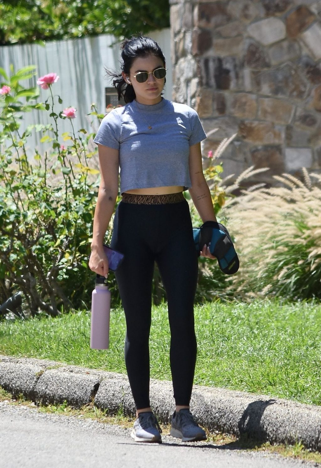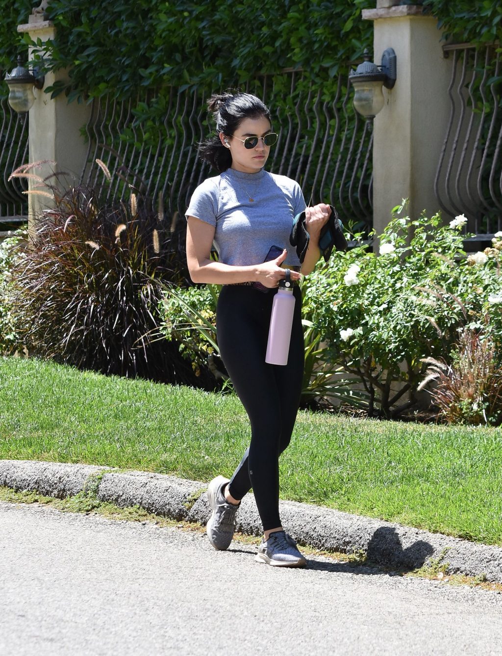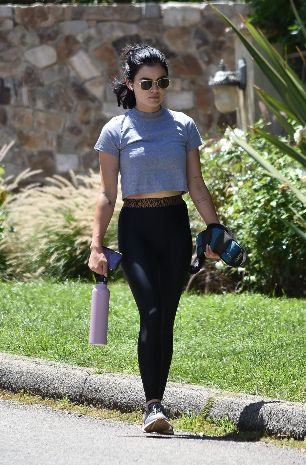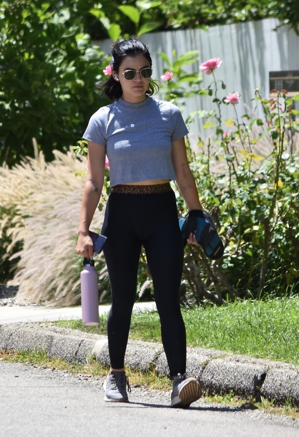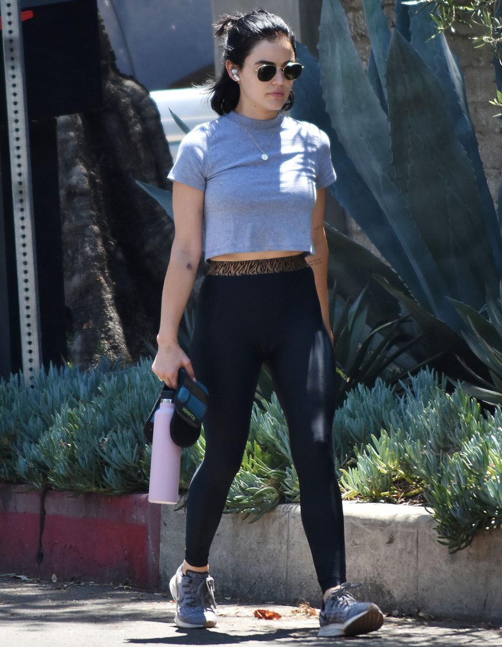 Lucy Hale sale a pasear por Los Ángeles, 12/06/2020. La actriz de 30 años llevaba una botella de agua rosa y vestía un top corto gris que dejaba el abdomen al descubierto, mallas negras y zapatillas negras.