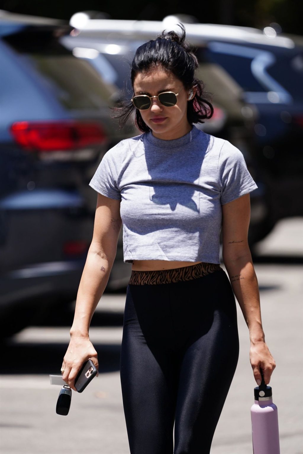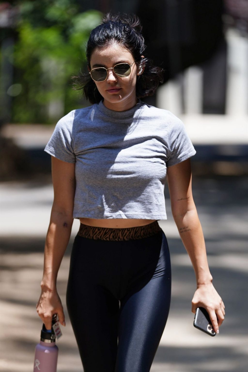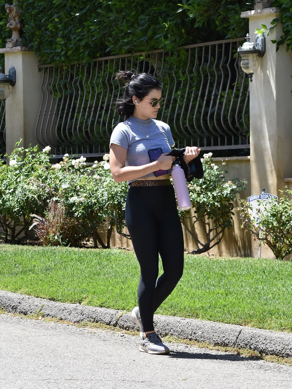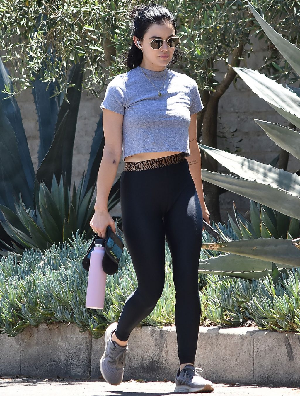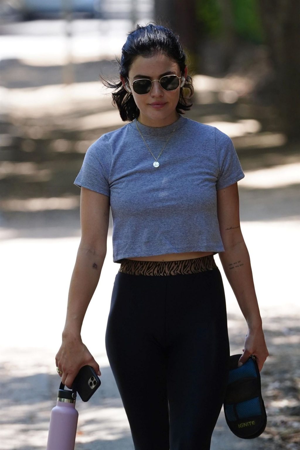 Lucy Hale sale a pasear por Los Ángeles, 12/06/2020. La actriz de 30 años llevaba una botella de agua rosa y vestía un top corto gris que dejaba el abdomen al descubierto, mallas negras y zapatillas negras.