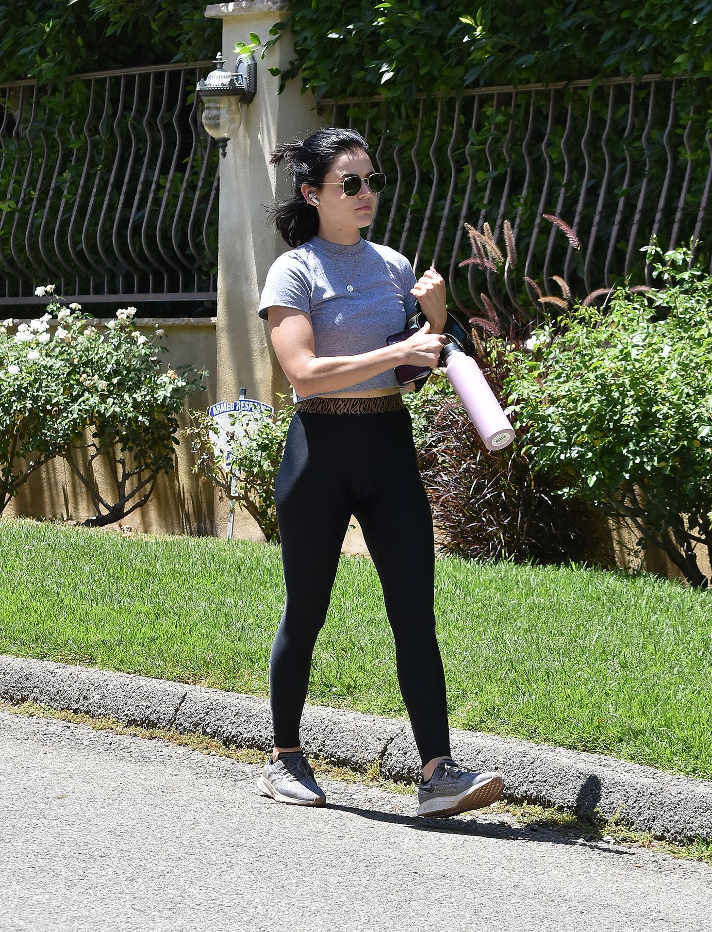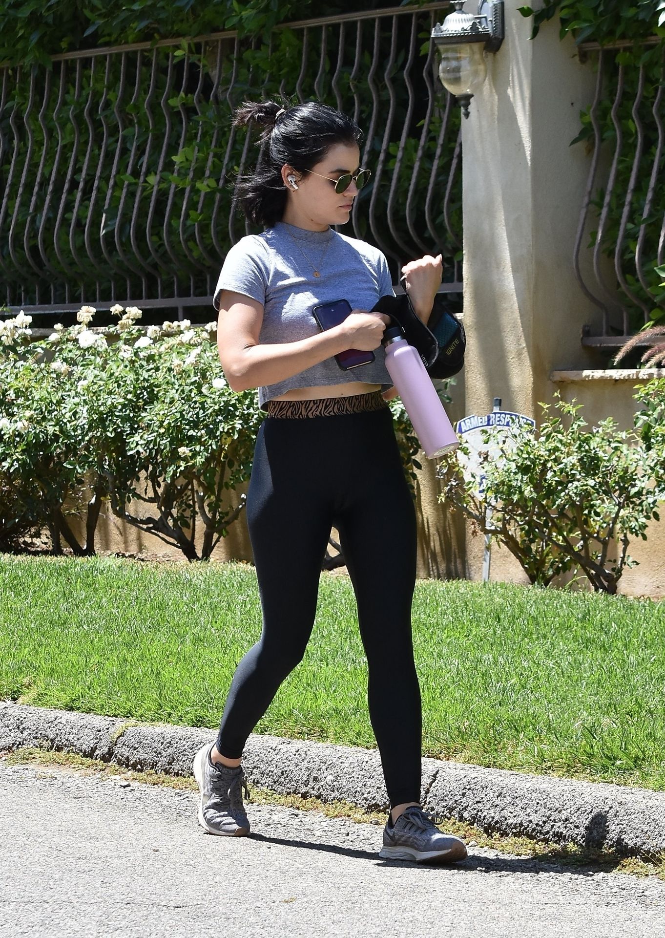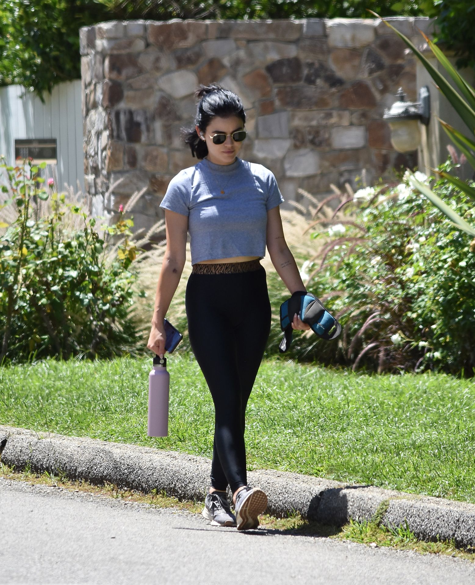 Lucy Hale sale a pasear por Los Ángeles, 12/06/2020. La actriz de 30 años llevaba una botella de agua rosa y vestía un top corto gris que dejaba el abdomen al descubierto, mallas negras y zapatillas negras.