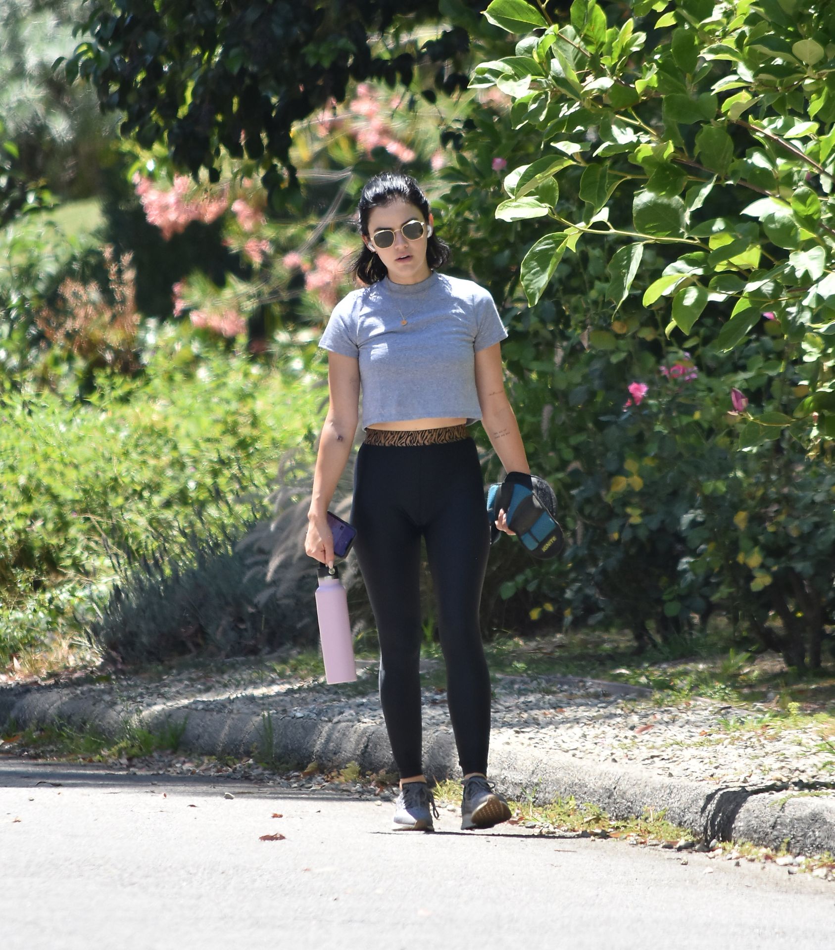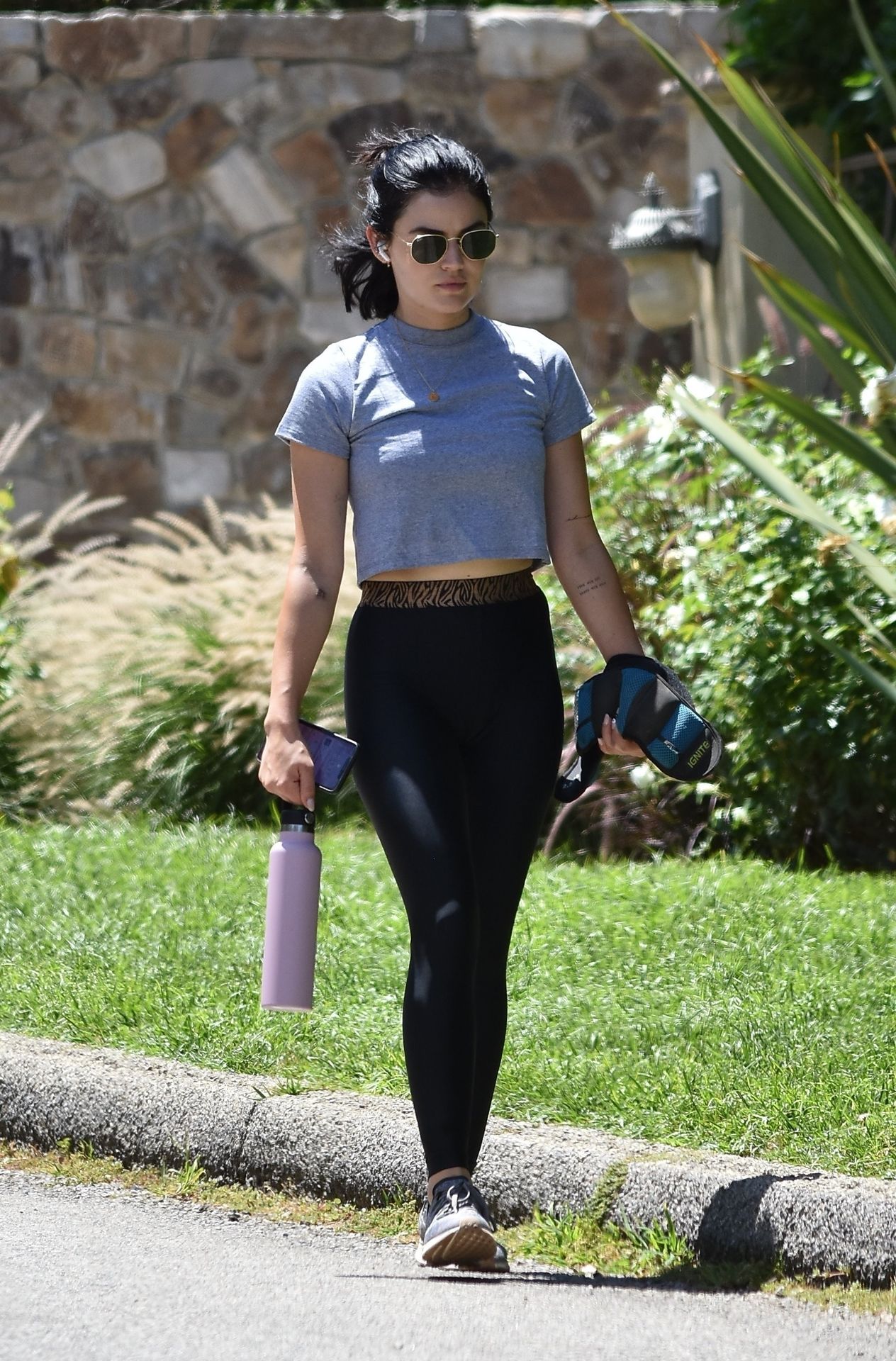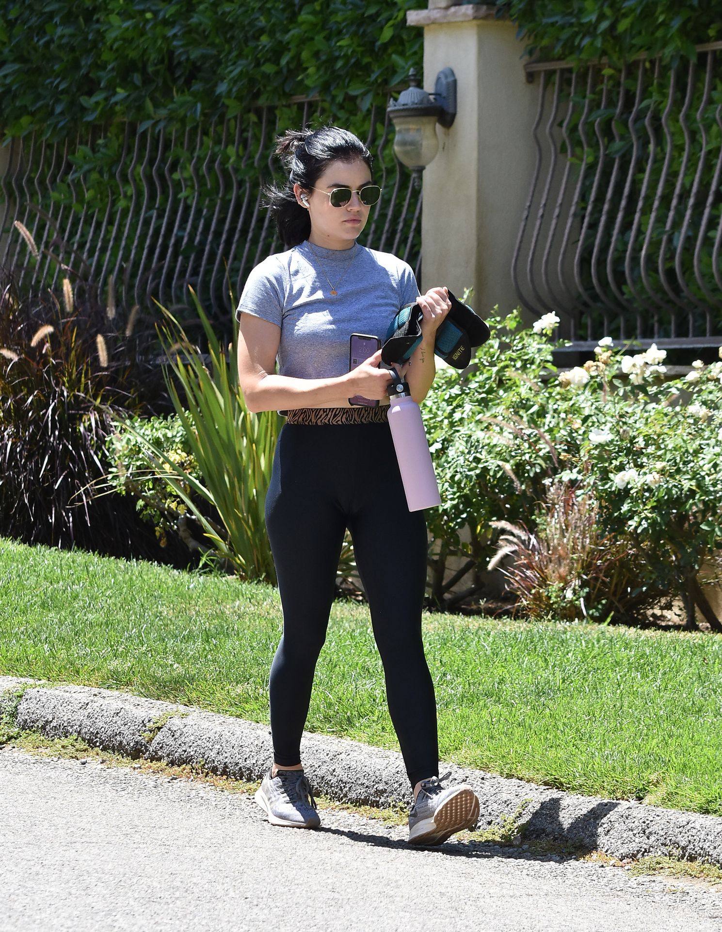 Lucy Hale sale a pasear por Los Ángeles, 12/06/2020. La actriz de 30 años llevaba una botella de agua rosa y vestía un top corto gris que dejaba el abdomen al descubierto, mallas negras y zapatillas negras.