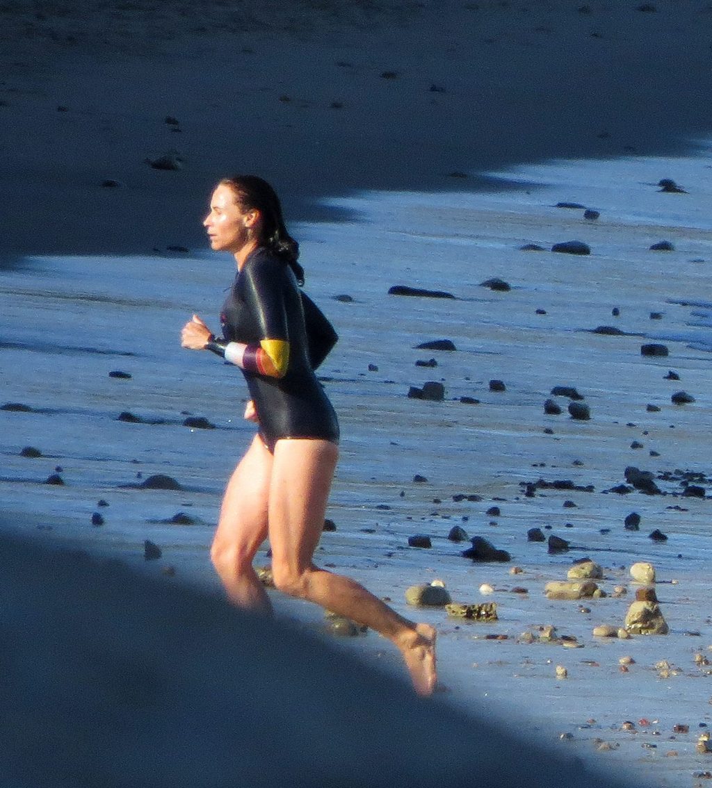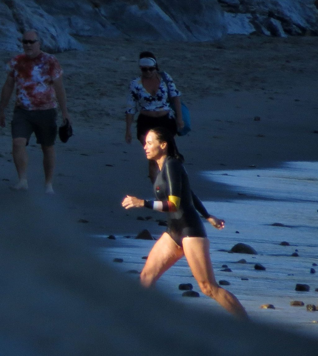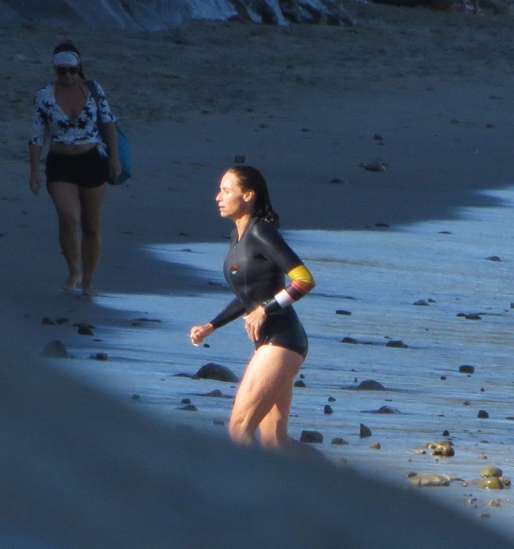La actriz Minnie Driver (50) es vista nadando en medio del océano usando un traje de neopreno con las piernas cortadas en Malibu, California, 10/06/2020.