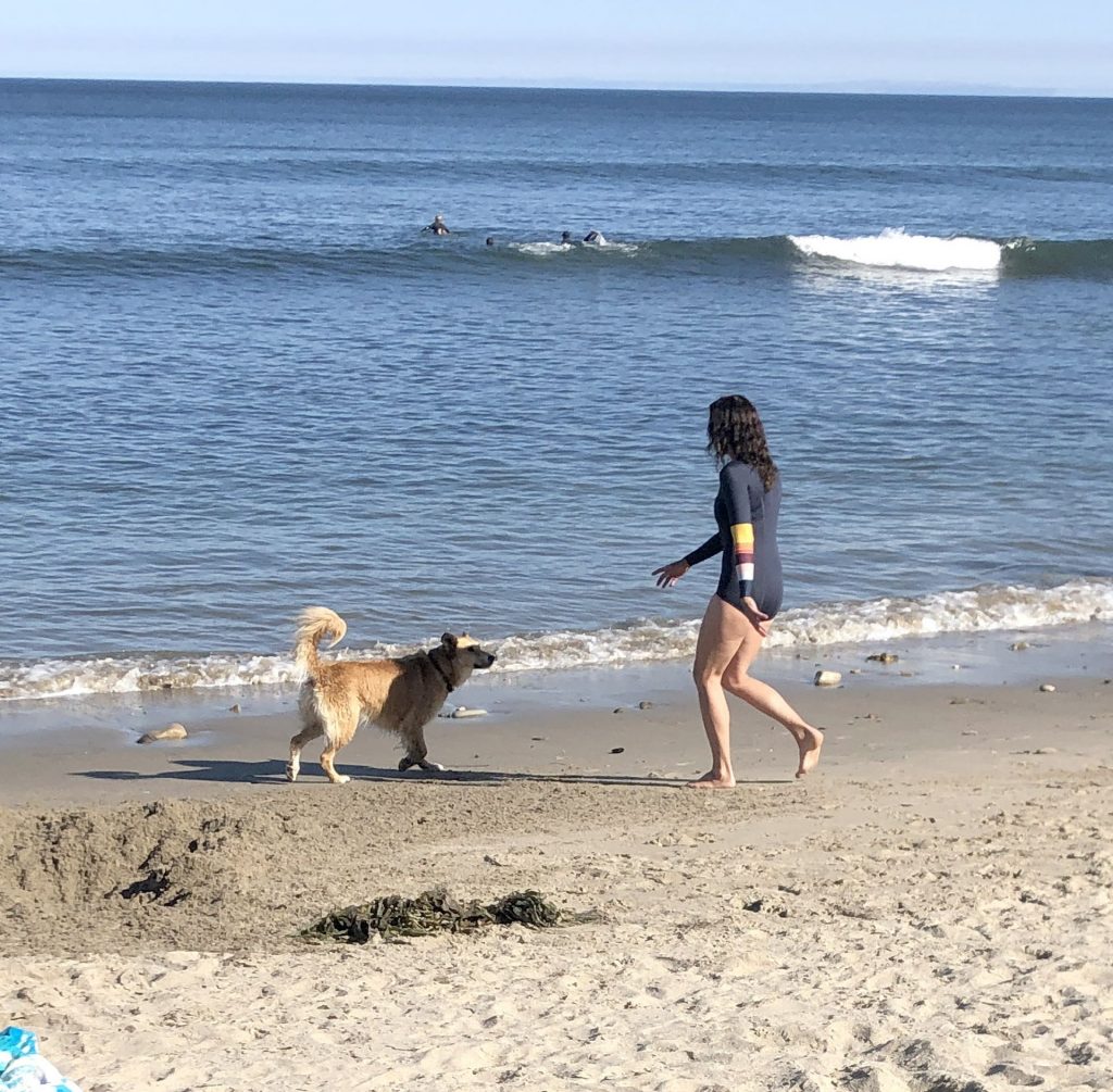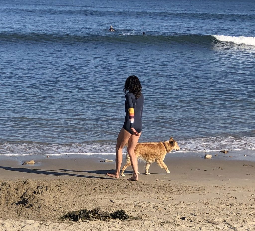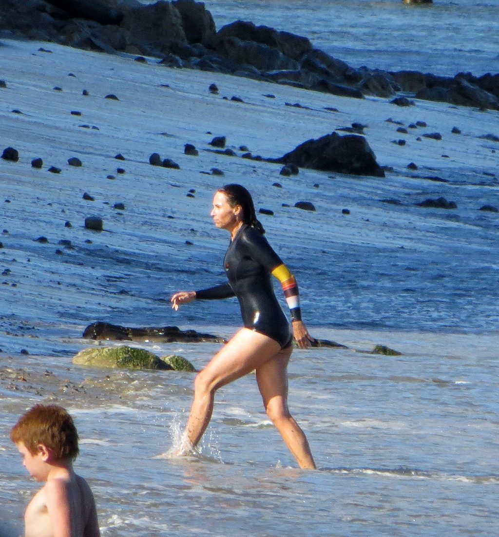 La actriz Minnie Driver (50) es vista nadando en medio del océano usando un traje de neopreno con las piernas cortadas en Malibu, California, 10/06/2020.