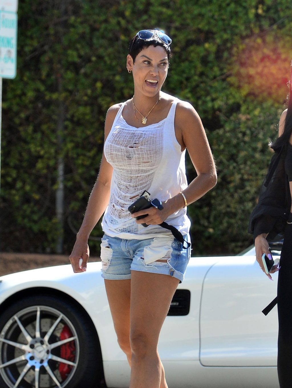 Nicole Murphy admira su roadster Mercedes AMG GT de $180,000 después de un paseo con una amiga en Beverly Hills, 07/07/2020. La modelo de 52 años llevaba una camiseta sin mangas blanca, shorts de mezclilla cortados y sandalias.