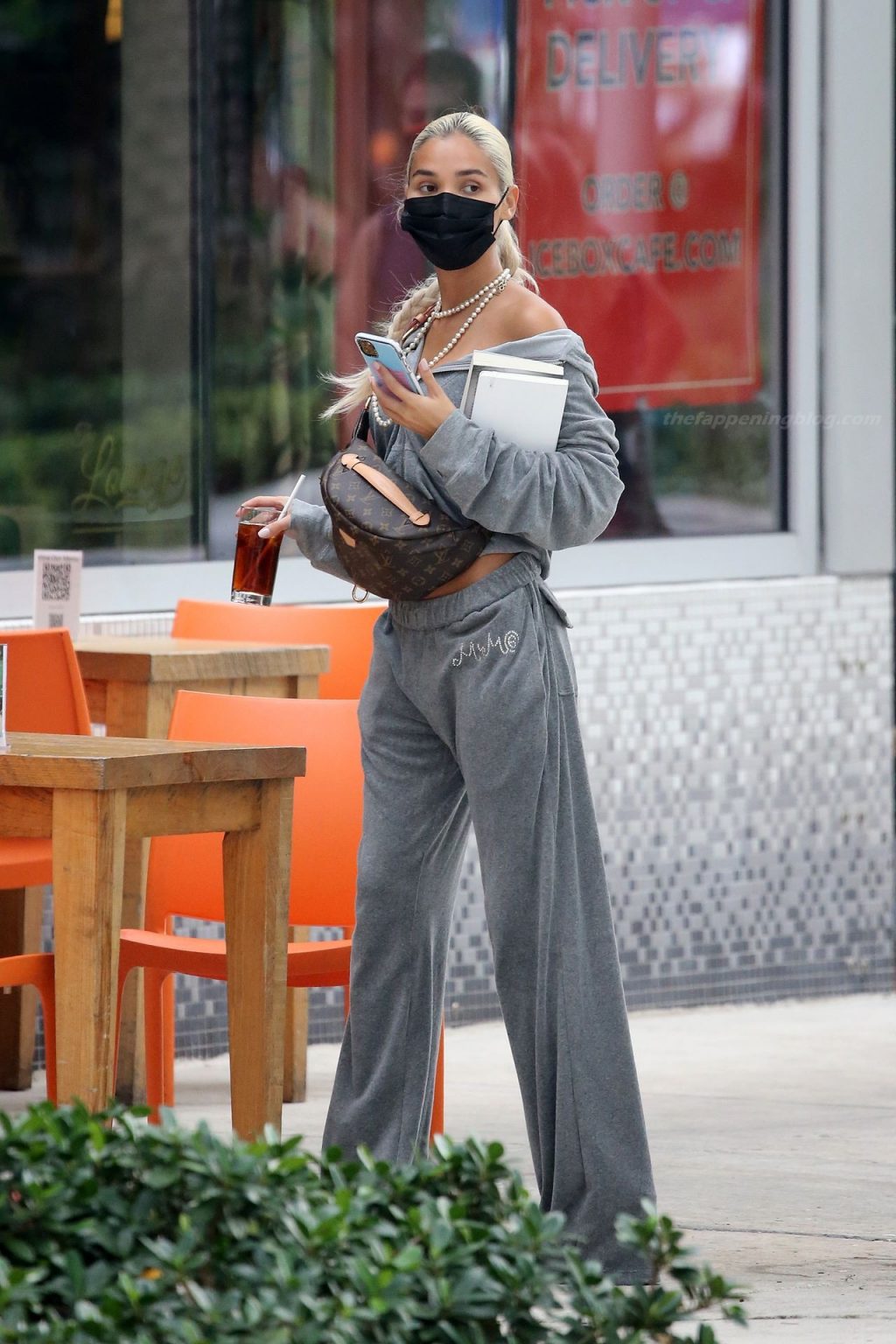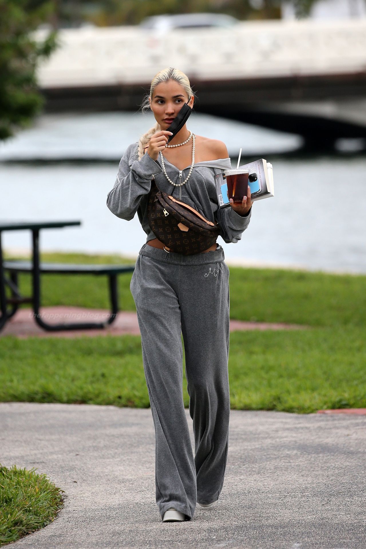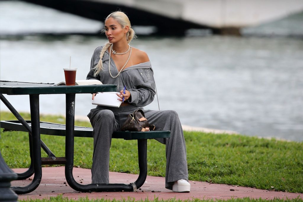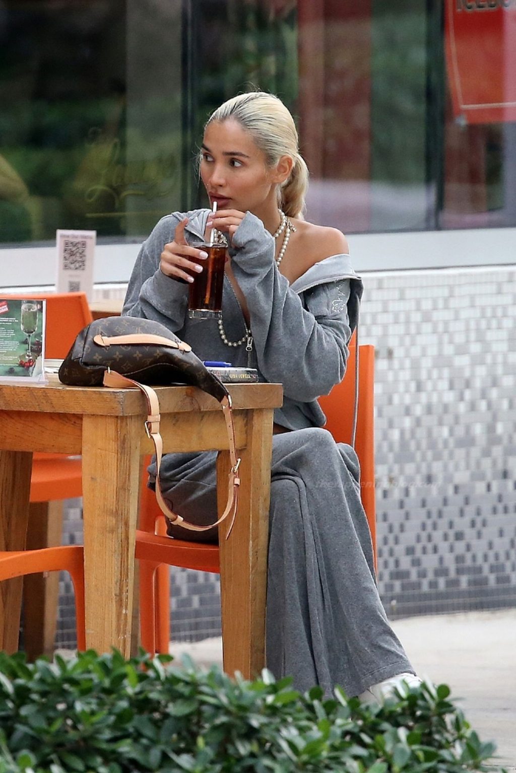 Singer Pia Mia viste sudaderas grises con un collar de perlas y una riñonera de diseñador mientras toma un café después de un día en la playa en Miami, 01/06/2021.