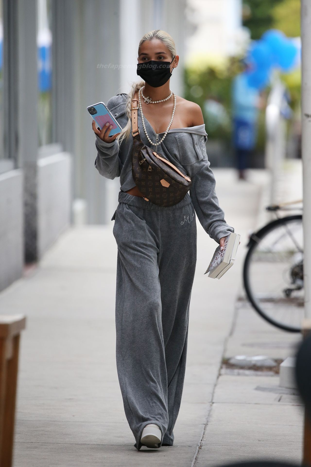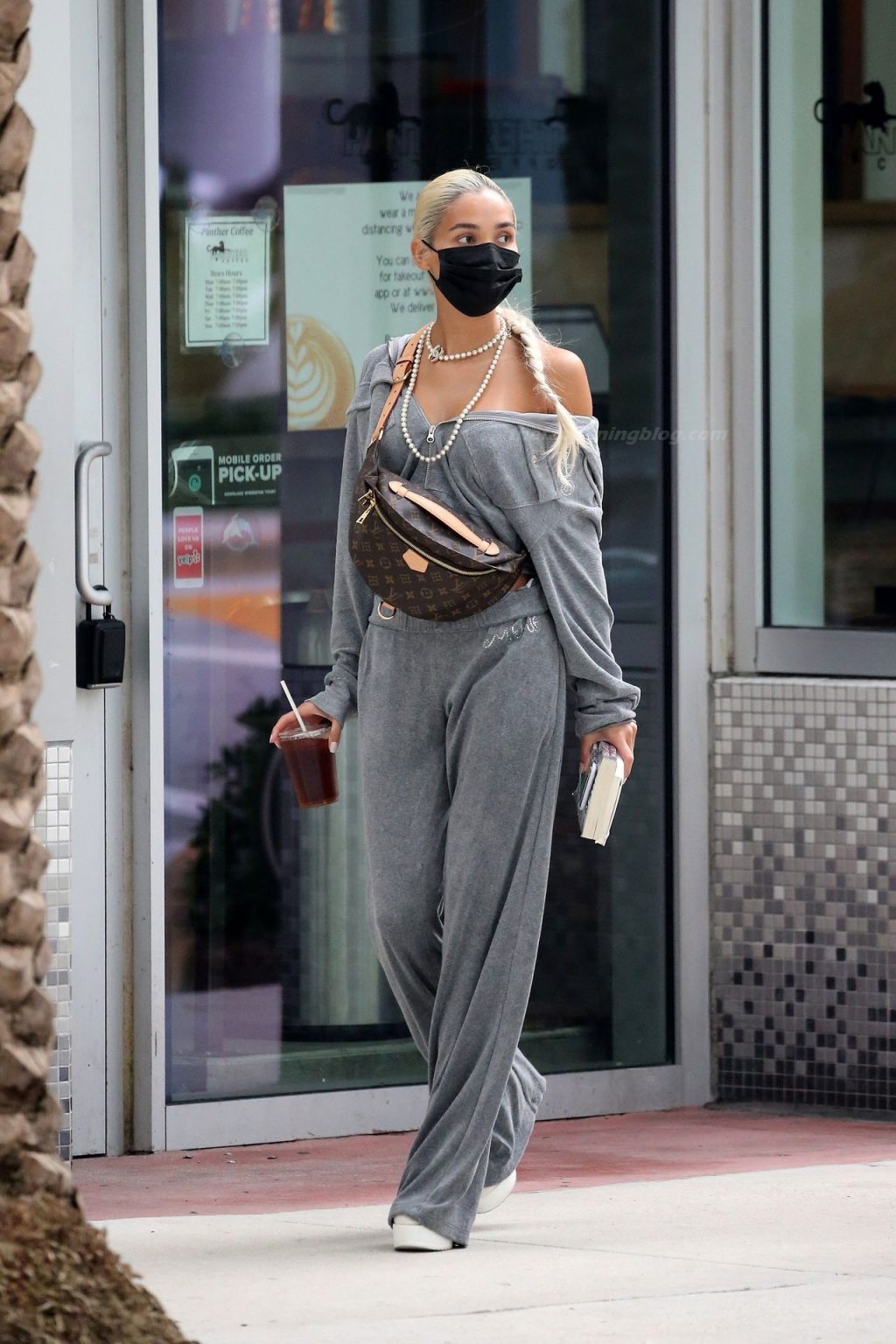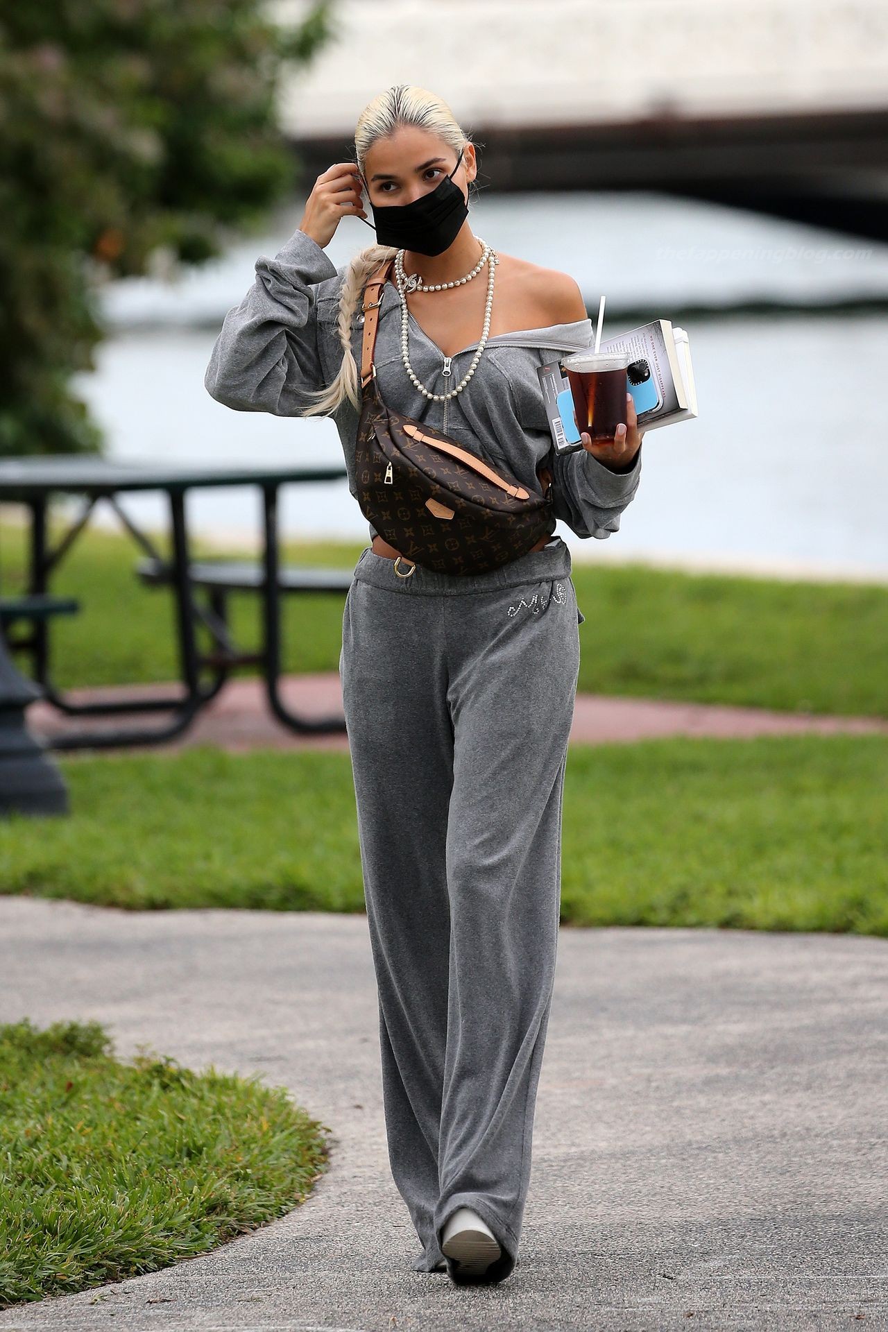 Singer Pia Mia viste sudaderas grises con un collar de perlas y una riñonera de diseñador mientras toma un café después de un día en la playa en Miami, 01/06/2021.