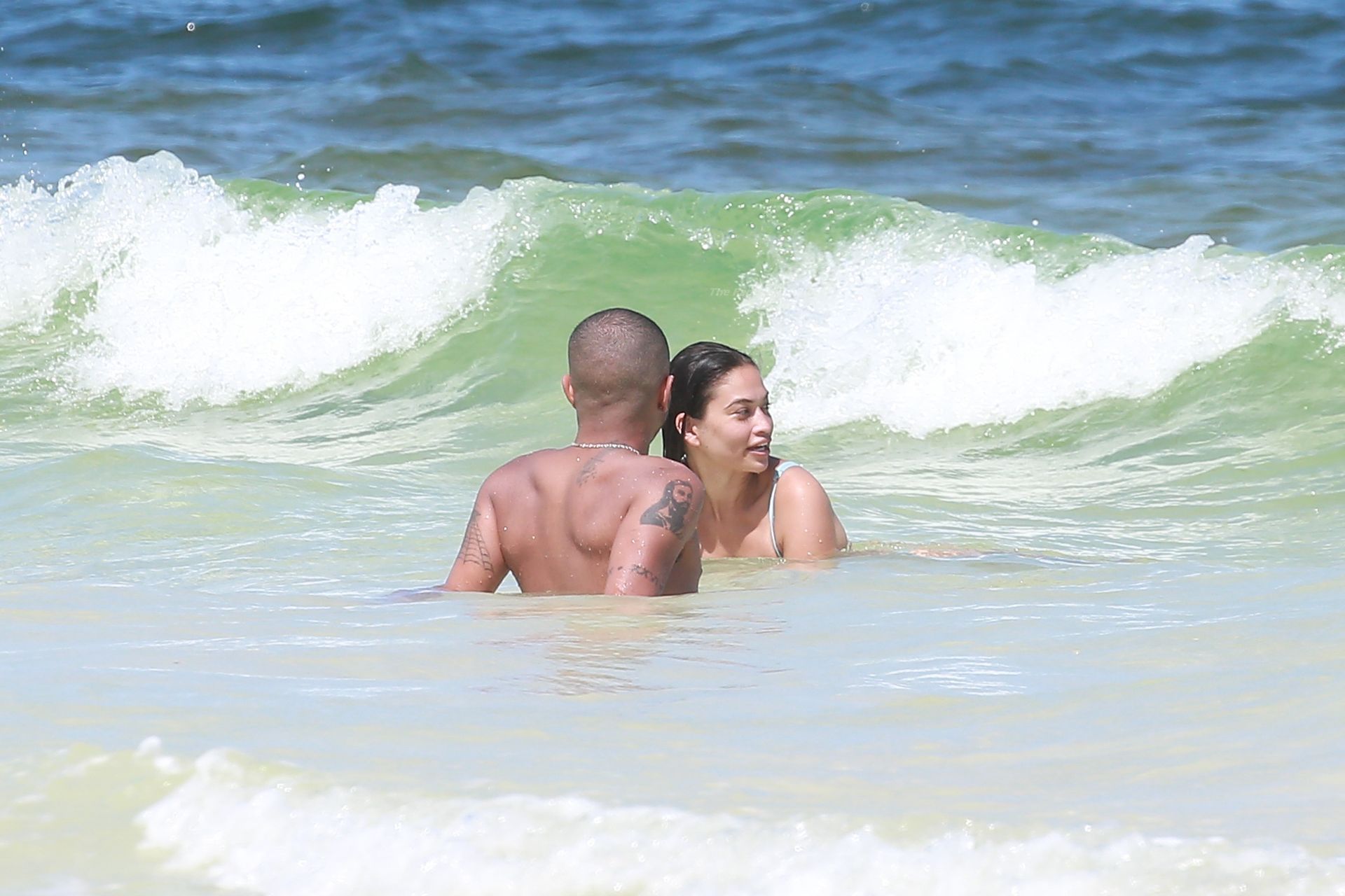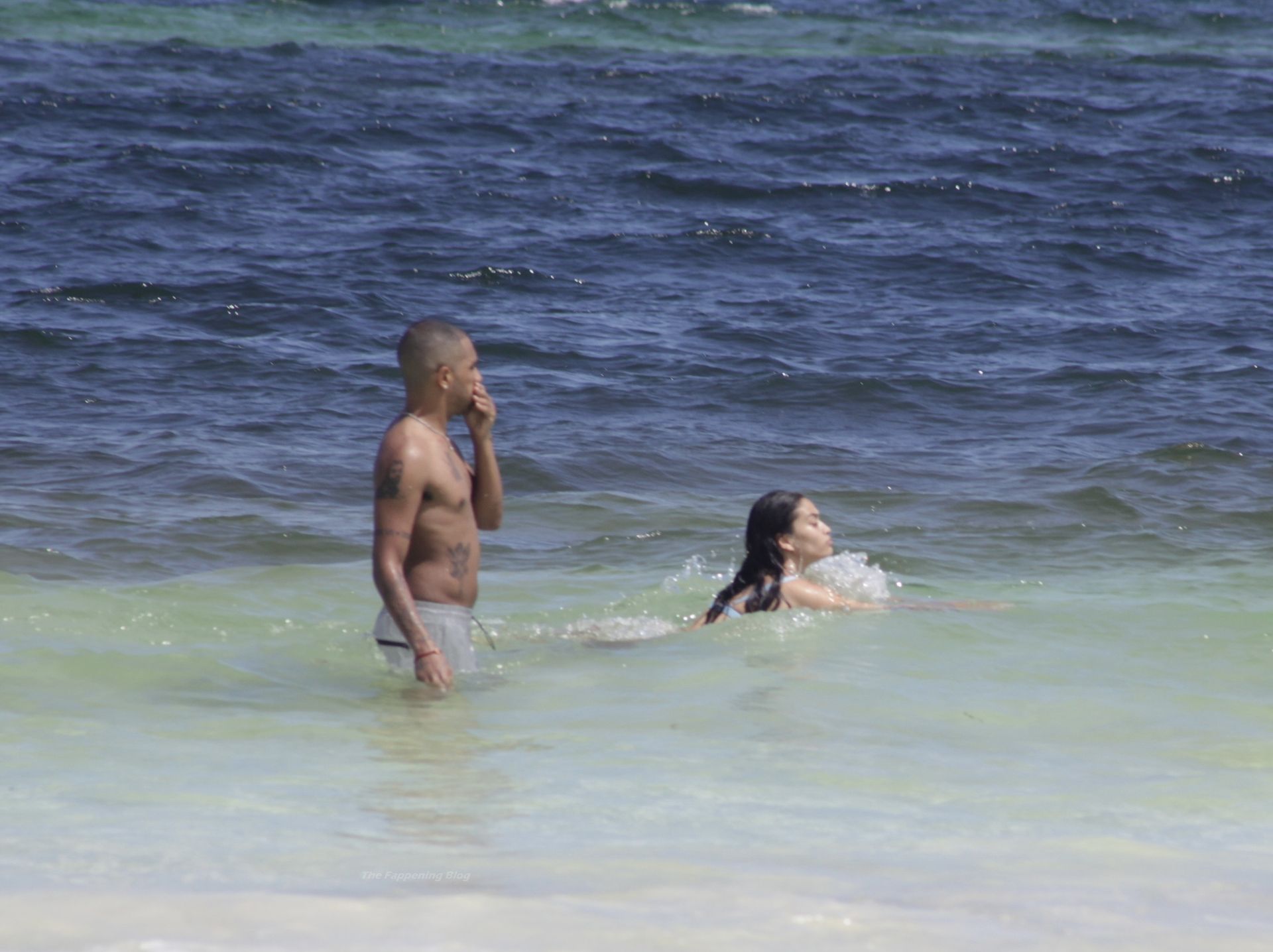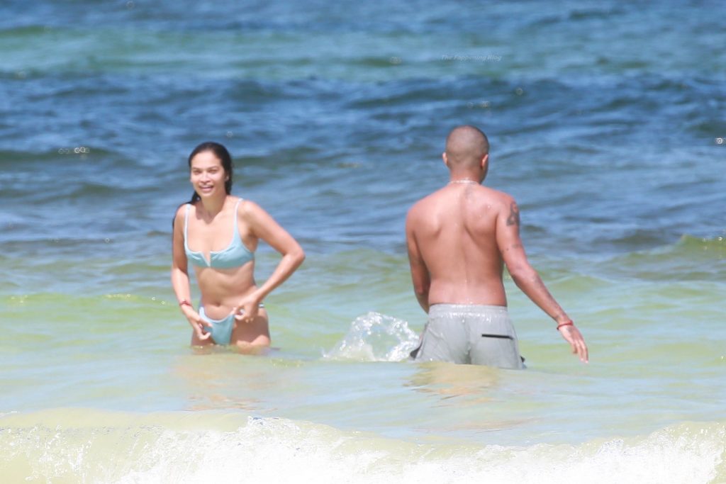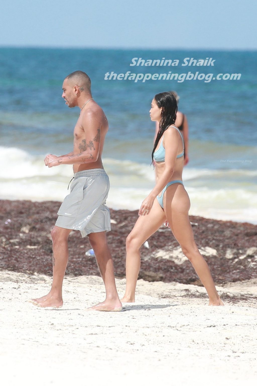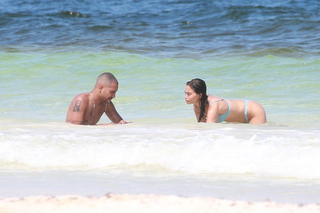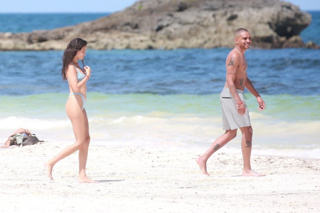 Model Shanina Shaik y su novio Matthew Adesuyan se acercan y se muestran cariñosos mientras disfrutan de un baño en las aguas de Tulum, 14/08/2021.