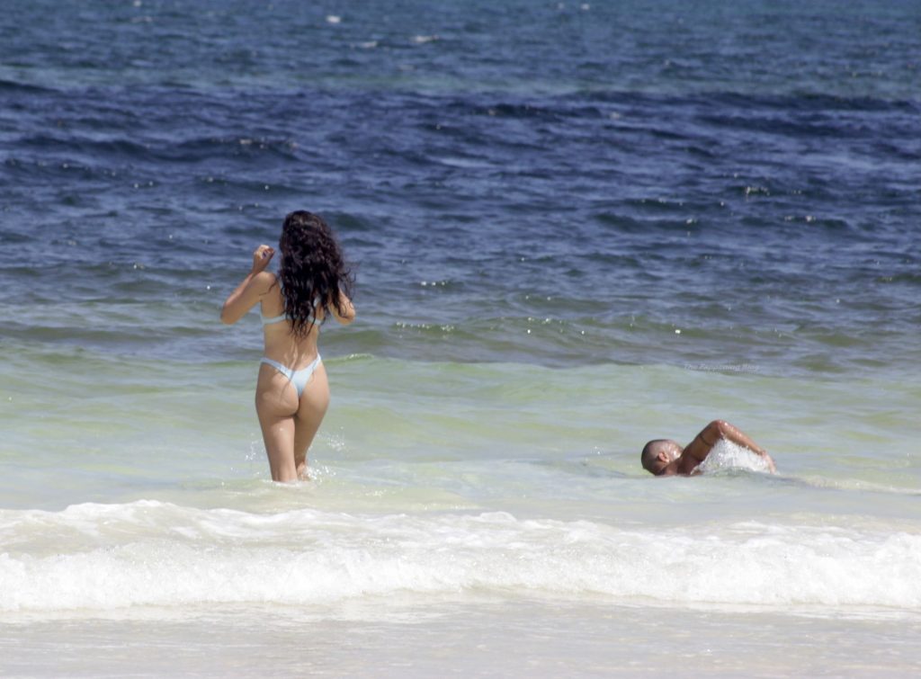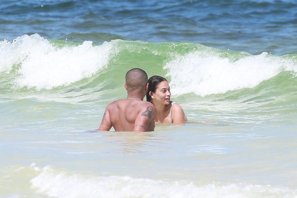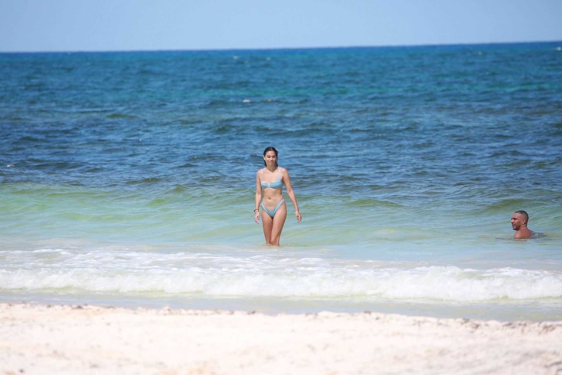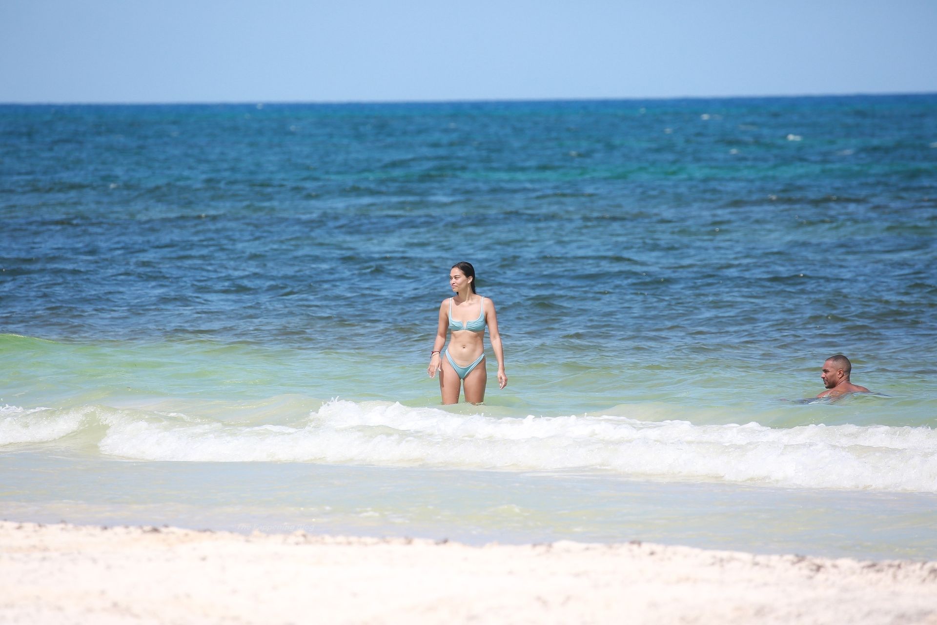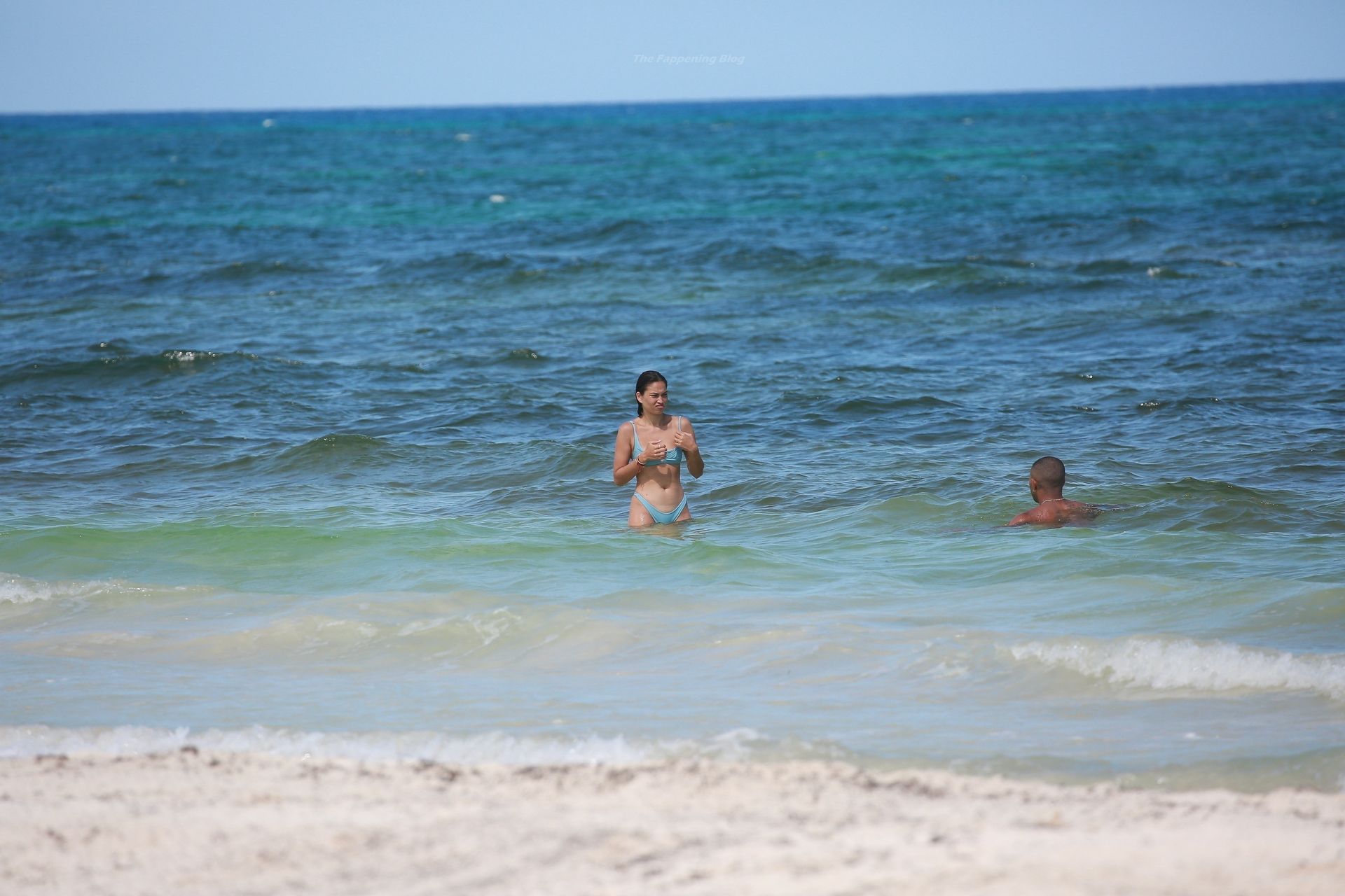 Model Shanina Shaik y su novio Matthew Adesuyan se acercan y se muestran cariñosos mientras disfrutan de un baño en las aguas de Tulum, 14/08/2021.
