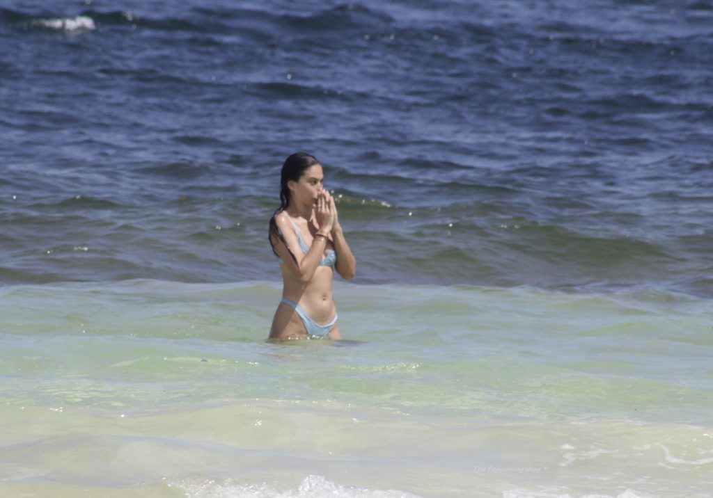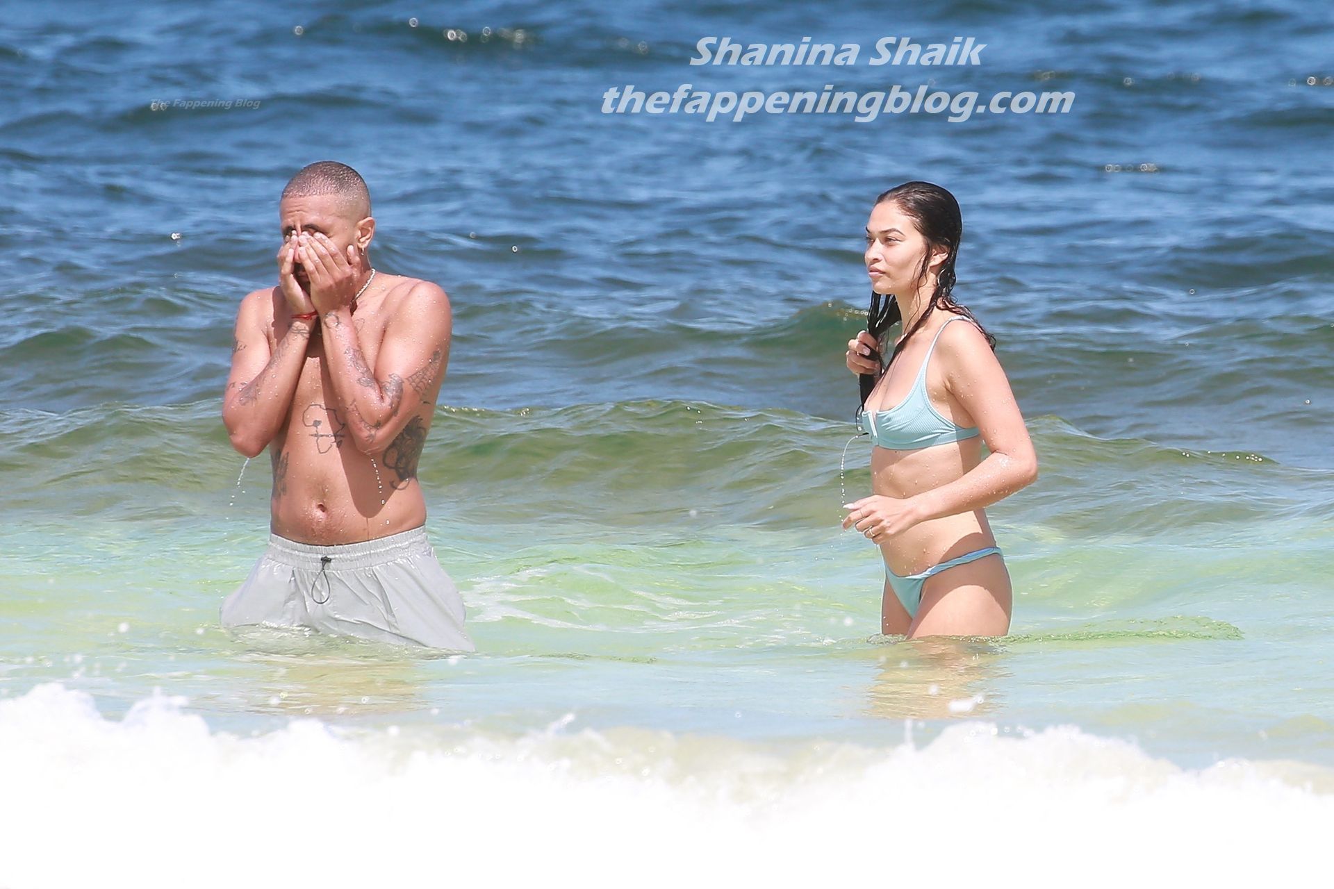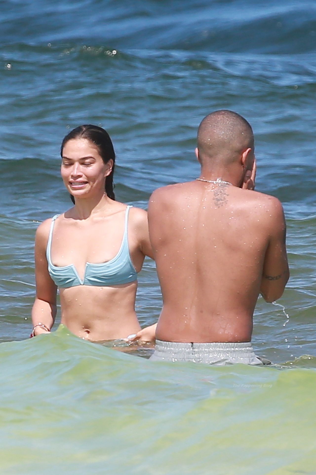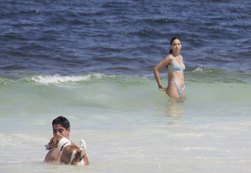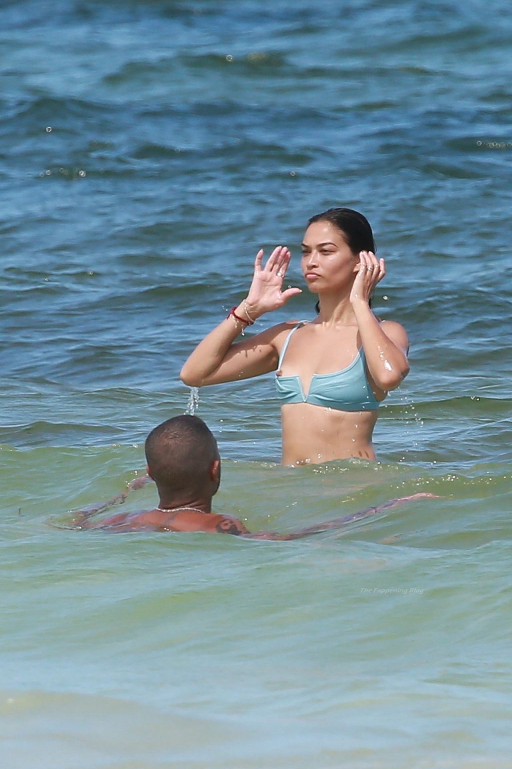 Shanina sufre un fallo de vestuario cuando una ola tira hacia abajo el top del bikini de la modelo, revelando su pecho desnudo.