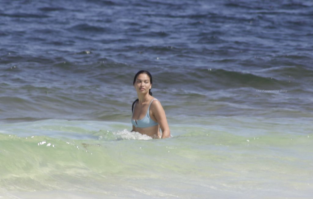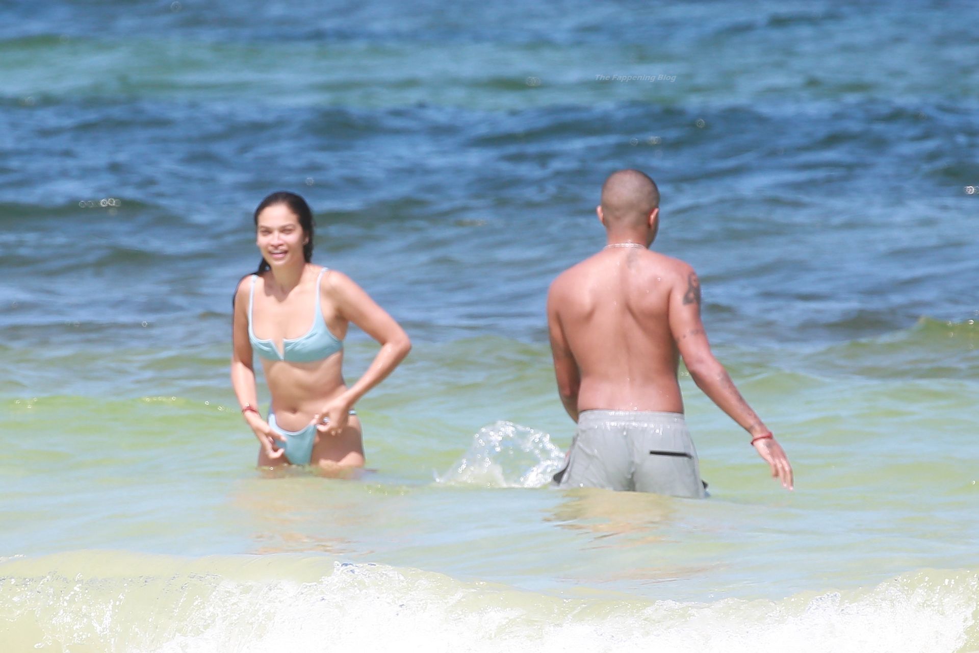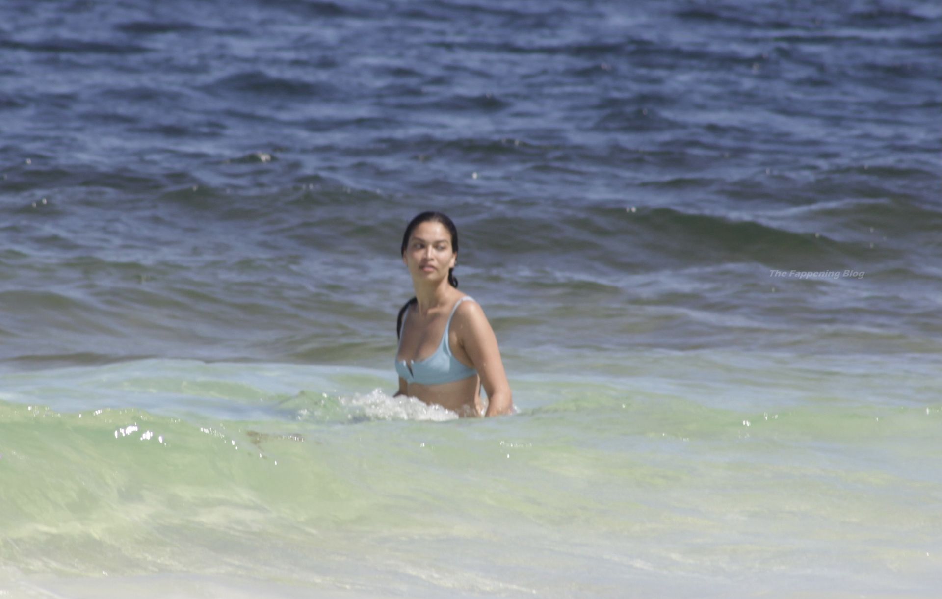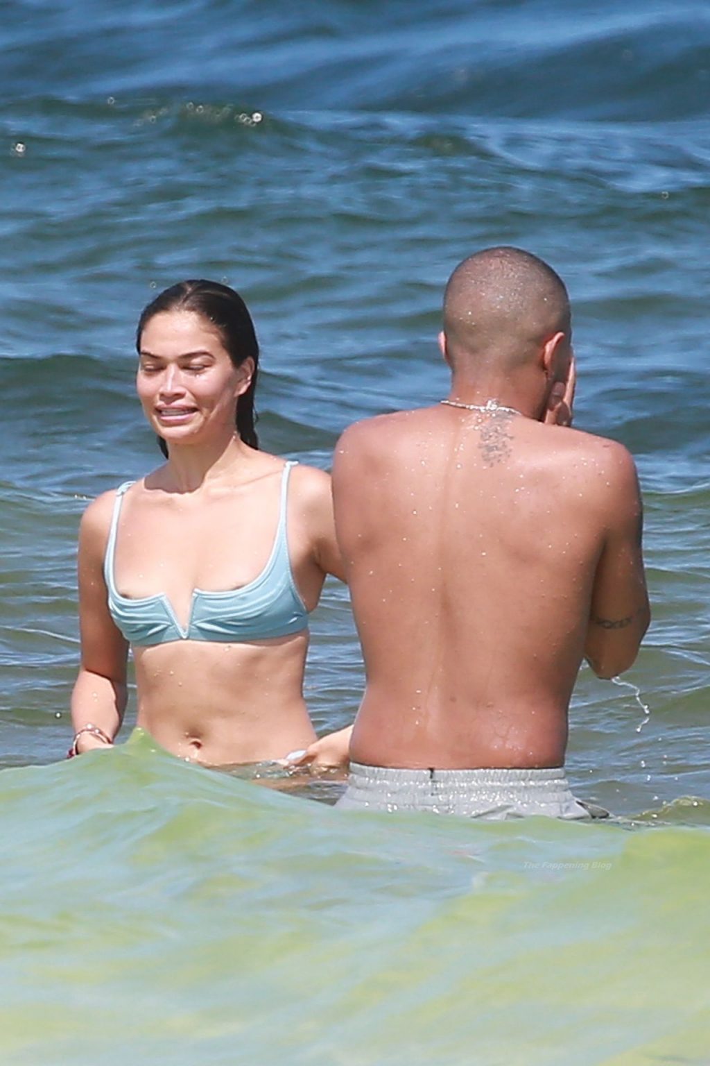 Shanina sufre un fallo de vestuario cuando una ola tira hacia abajo el top del bikini de la modelo, revelando su pecho desnudo.