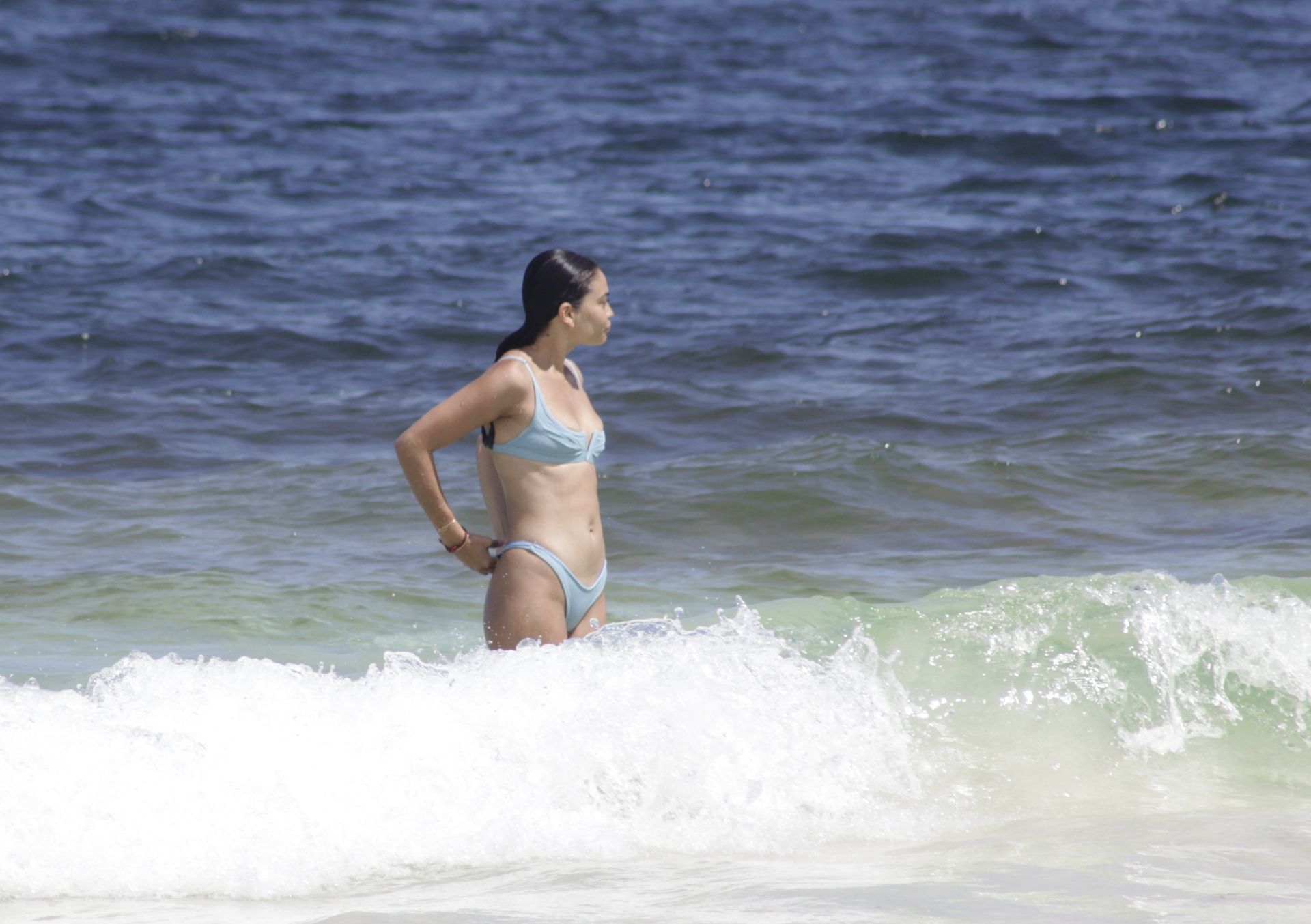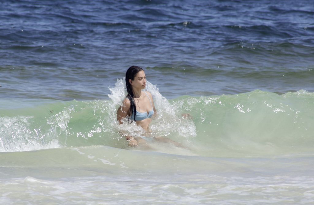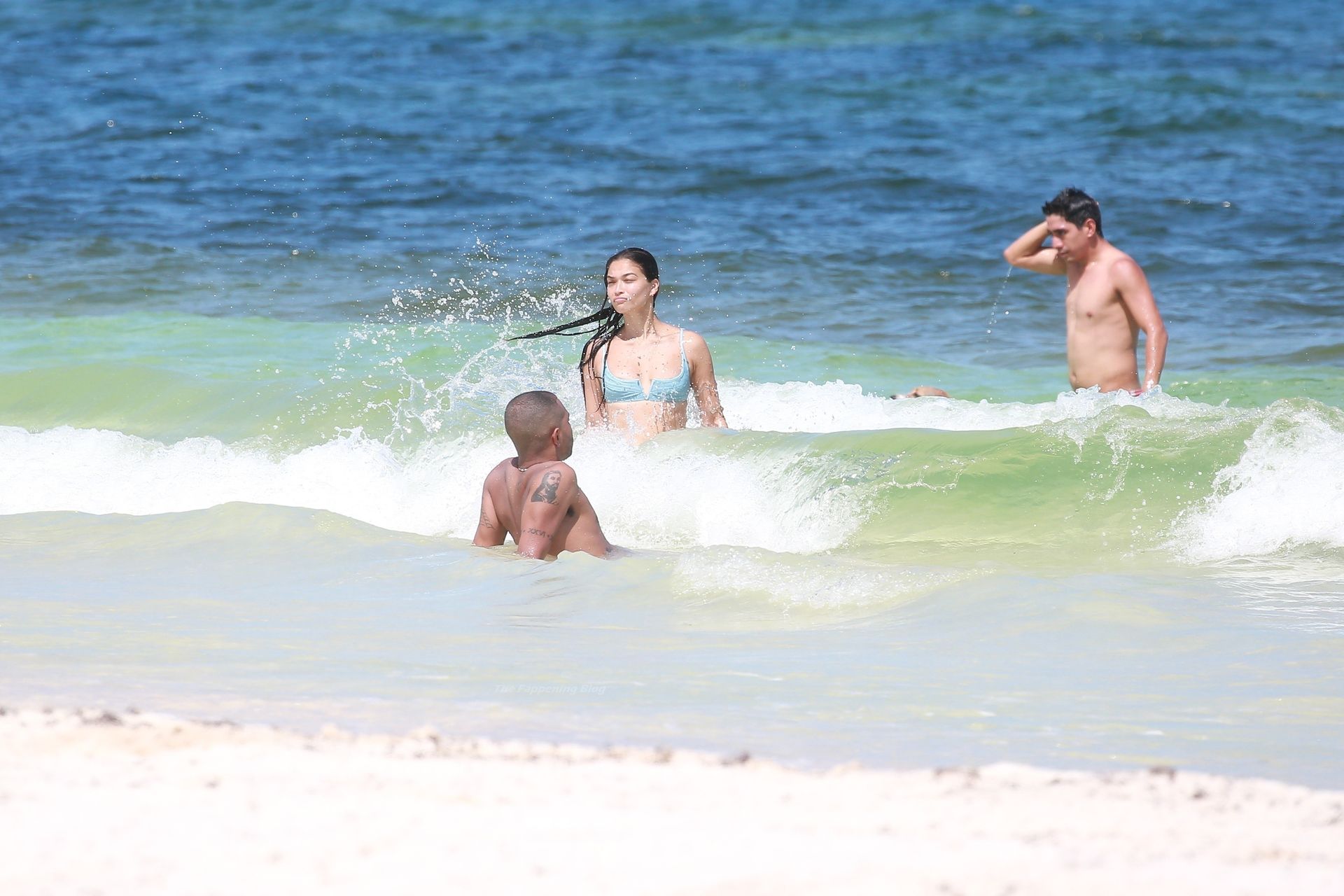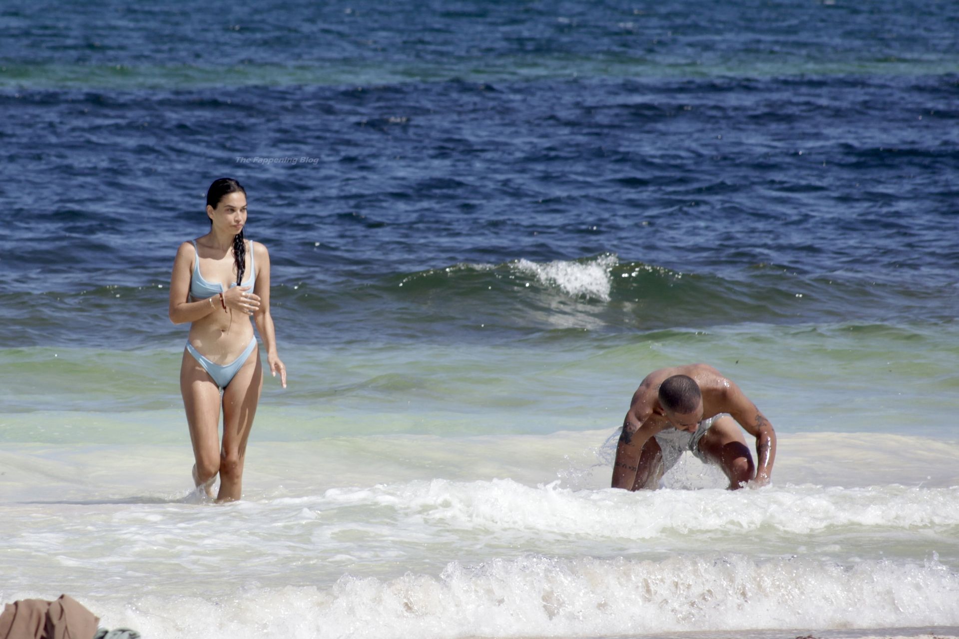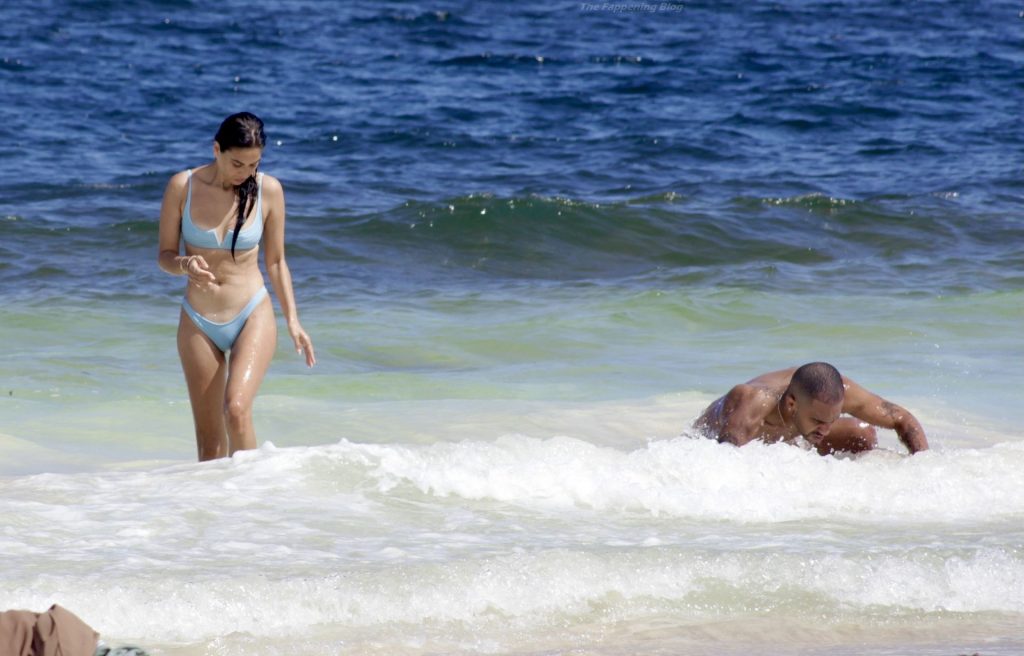 Shanina sufre un fallo de vestuario cuando una ola tira hacia abajo el top del bikini de la modelo, revelando su pecho desnudo.