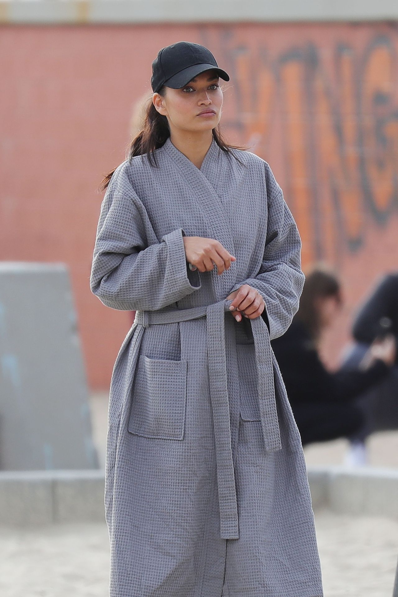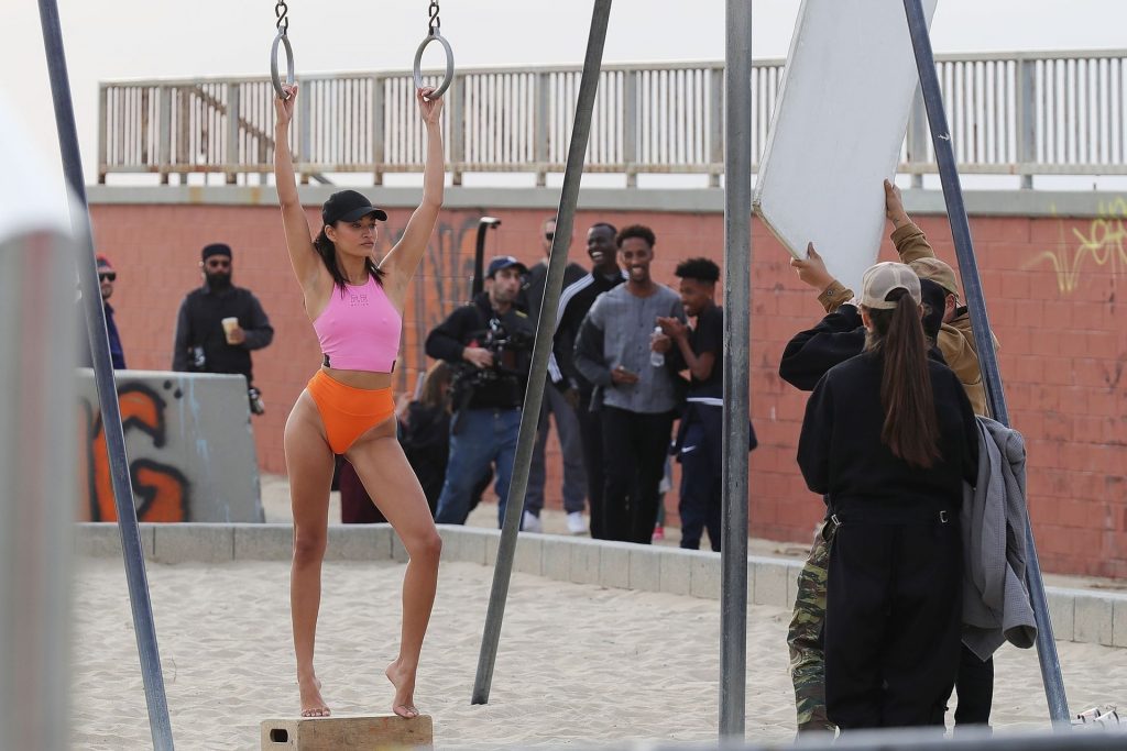 Con 2 millones de seguidores en Instagram, la modelo australiana de Victoria’s Secret Shanina Shaik posa para P.E Nation en Venice Beach, 26/11/2019. Shanina se sostiene de los anillos mientras lleva una camiseta rosa y un bikini naranja, mostrando sus curvas.
