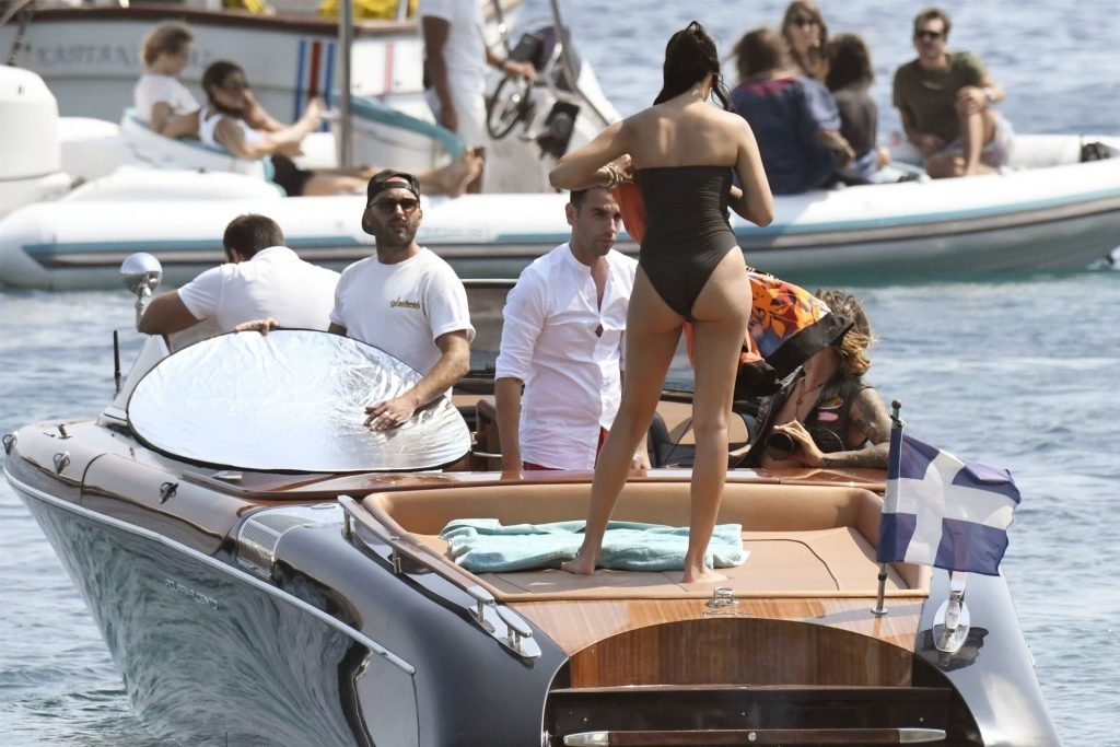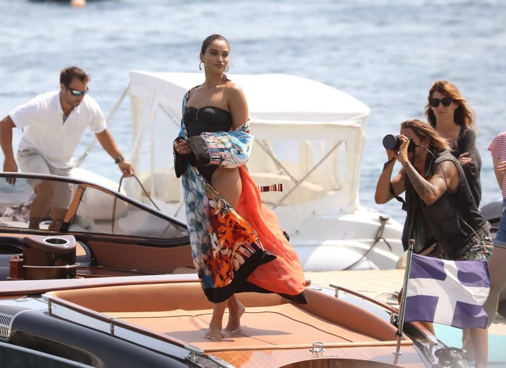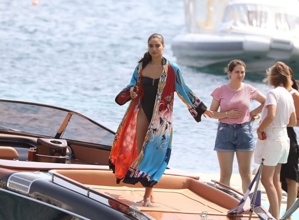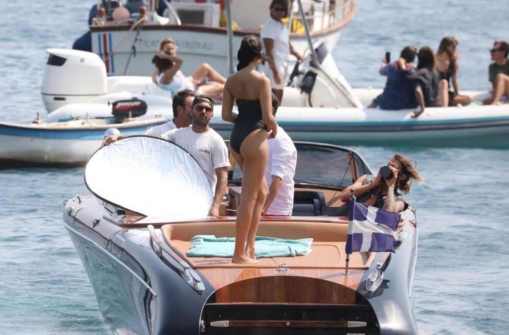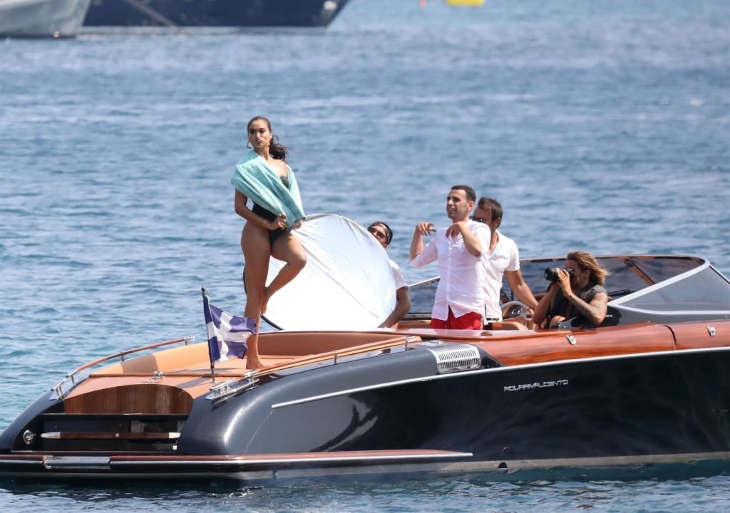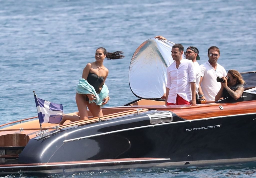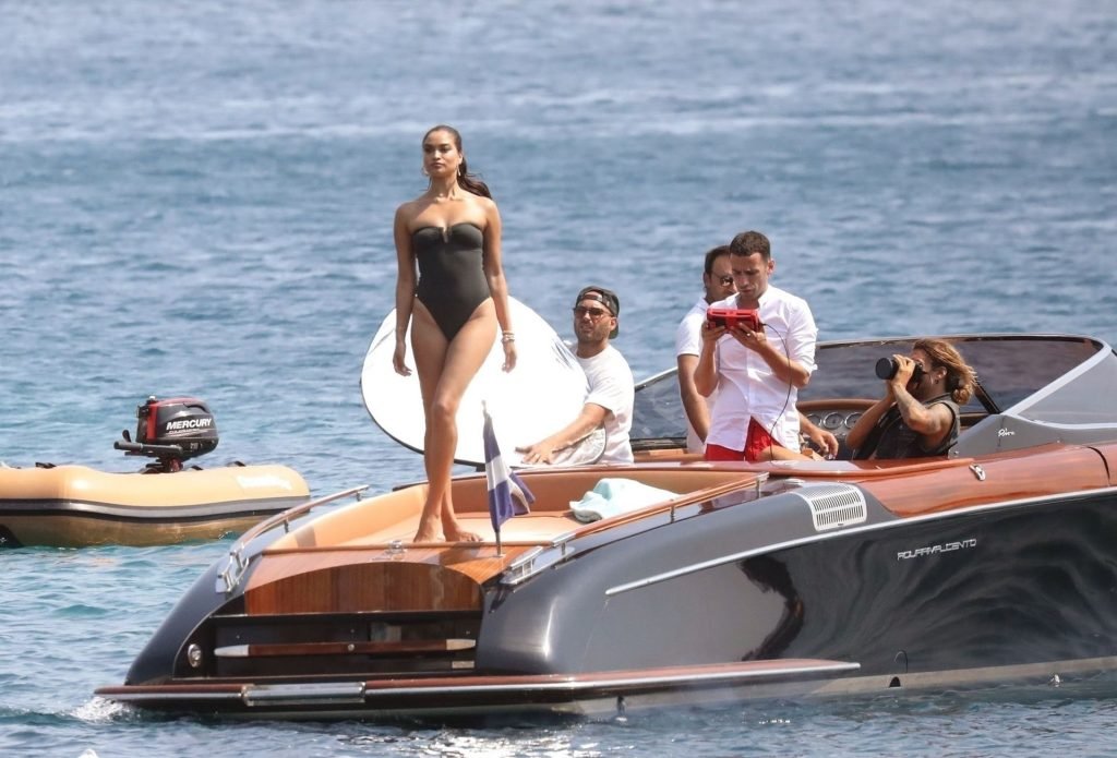 Sexy modelo de lencería de Victoria’s Secret, Shanina Shaik, luce su figura en un sexy traje de baño negro mientras posa en un barco bajo el sol griego filmando un comercial en Nammos, Playa Psarou en Mykonos, 09/05/2019. El actor canadiense Nick Bateman también se unió a Shanina en la sesión, mostrando sus músculos mientras paseaba en su moto acuática.