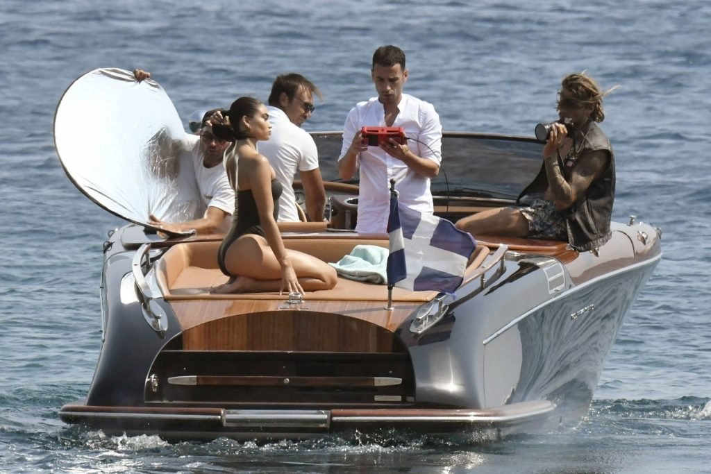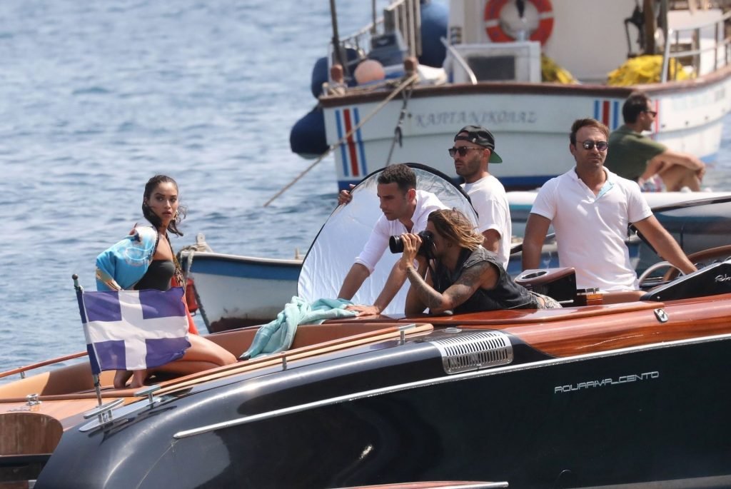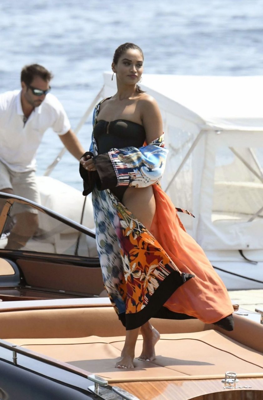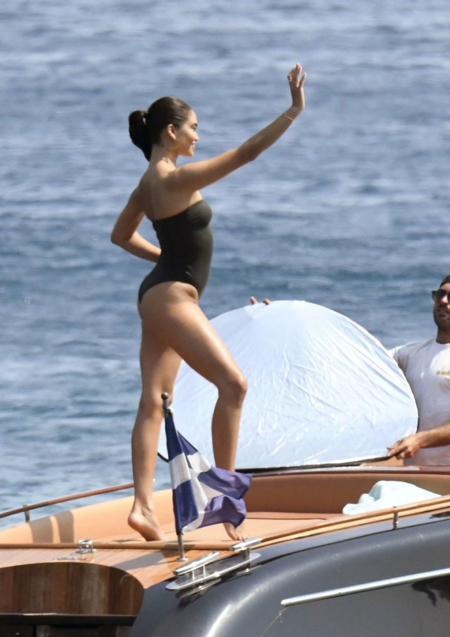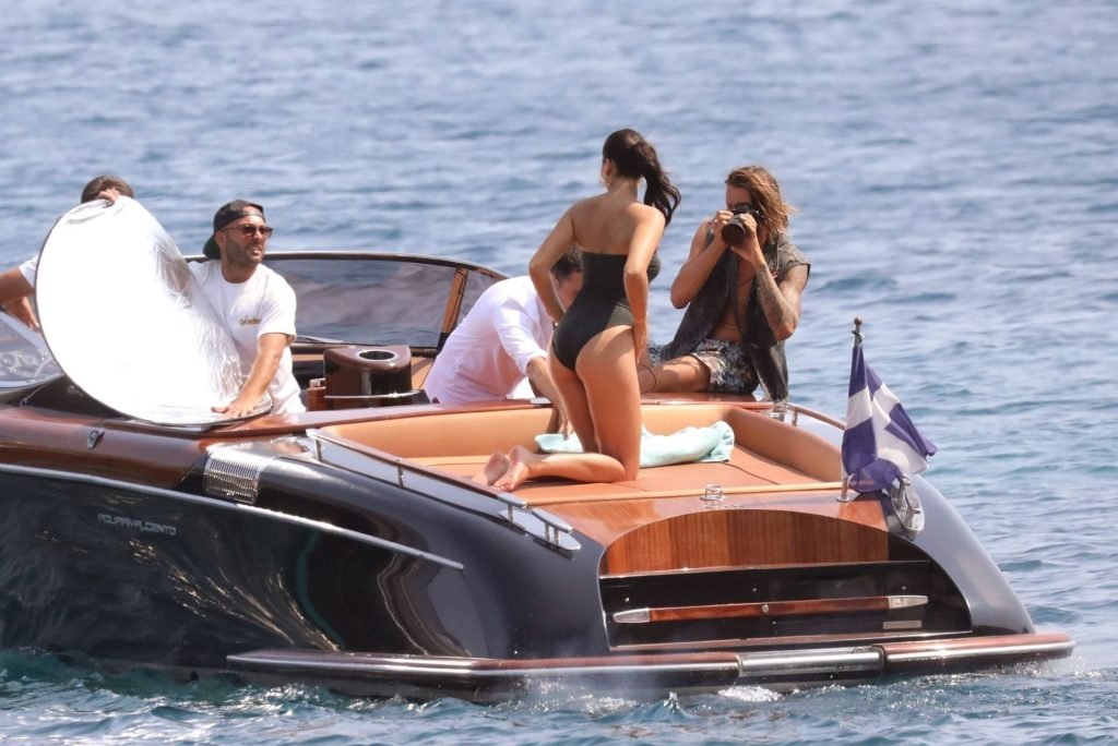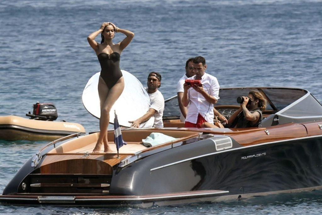 Sexy modelo de lencería de Victoria’s Secret, Shanina Shaik, luce su figura en un sexy traje de baño negro mientras posa en un barco bajo el sol griego filmando un comercial en Nammos, Playa Psarou en Mykonos, 09/05/2019. El actor canadiense Nick Bateman también se unió a Shanina en la sesión, mostrando sus músculos mientras paseaba en su moto acuática.