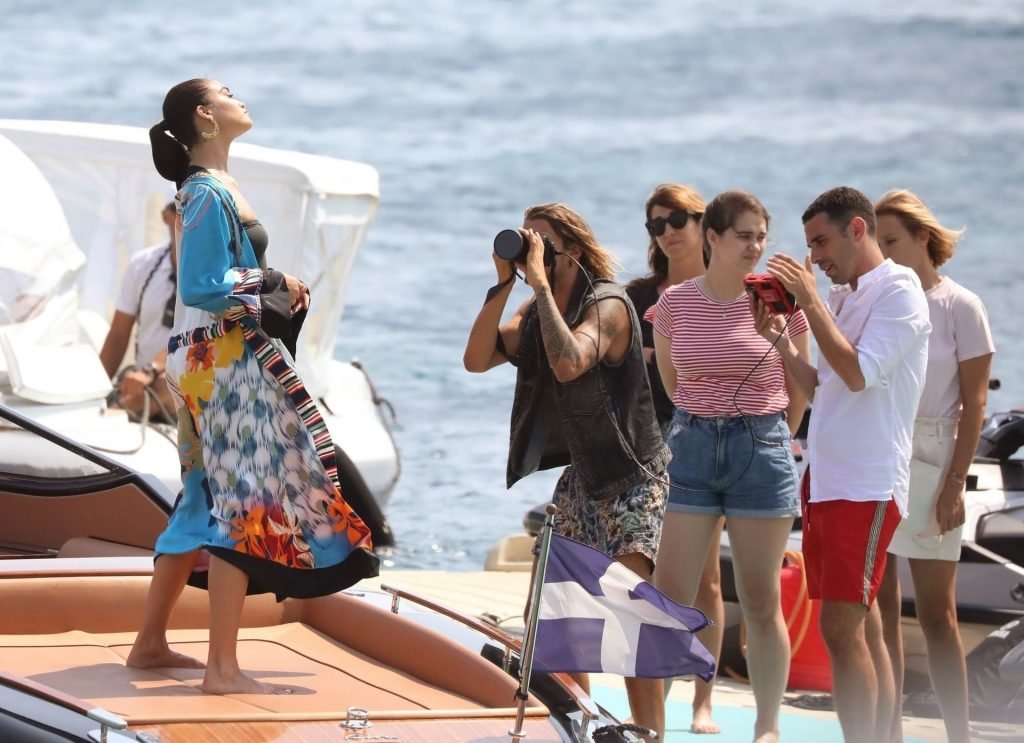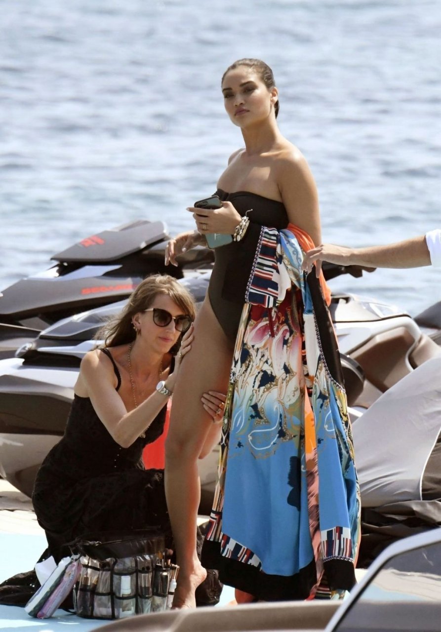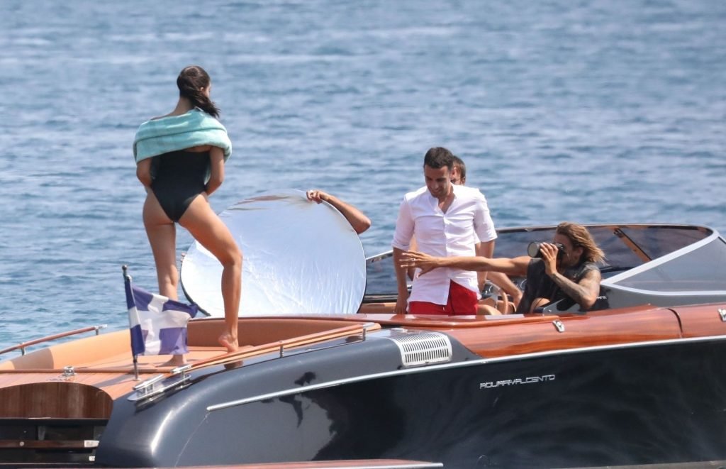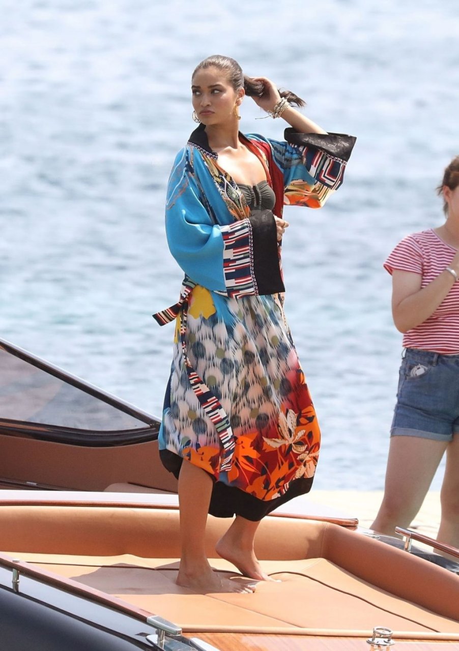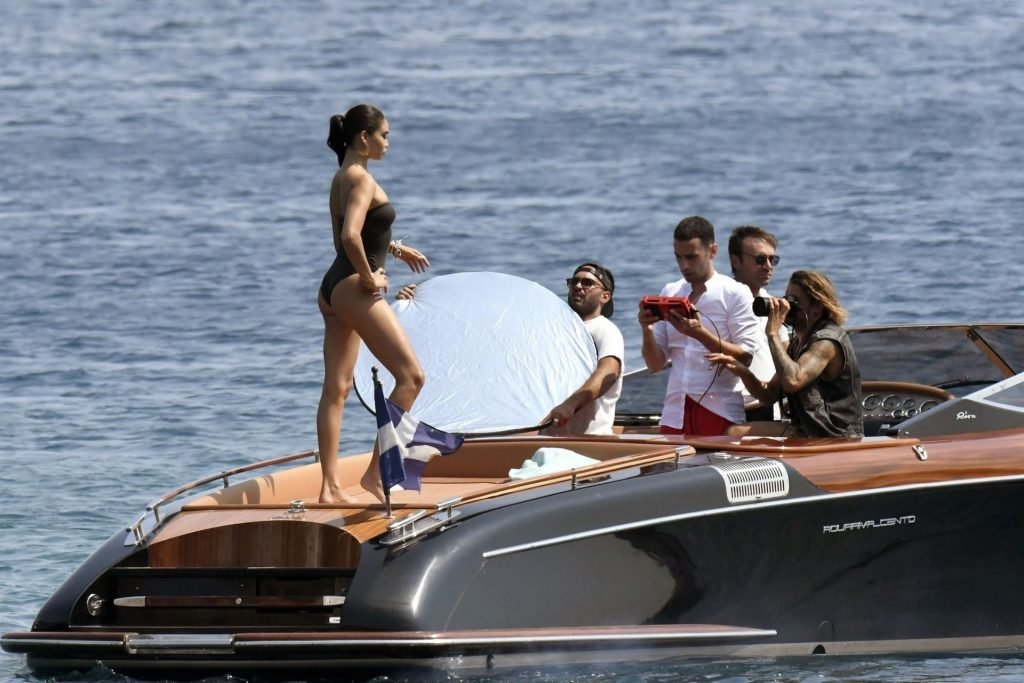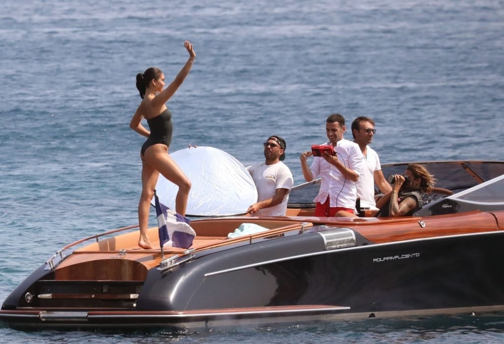 Sexy modelo de lencería de Victoria’s Secret, Shanina Shaik, luce su figura en un sexy traje de baño negro mientras posa en un barco bajo el sol griego filmando un comercial en Nammos, Playa Psarou en Mykonos, 09/05/2019. El actor canadiense Nick Bateman también se unió a Shanina en la sesión, mostrando sus músculos mientras paseaba en su moto acuática.