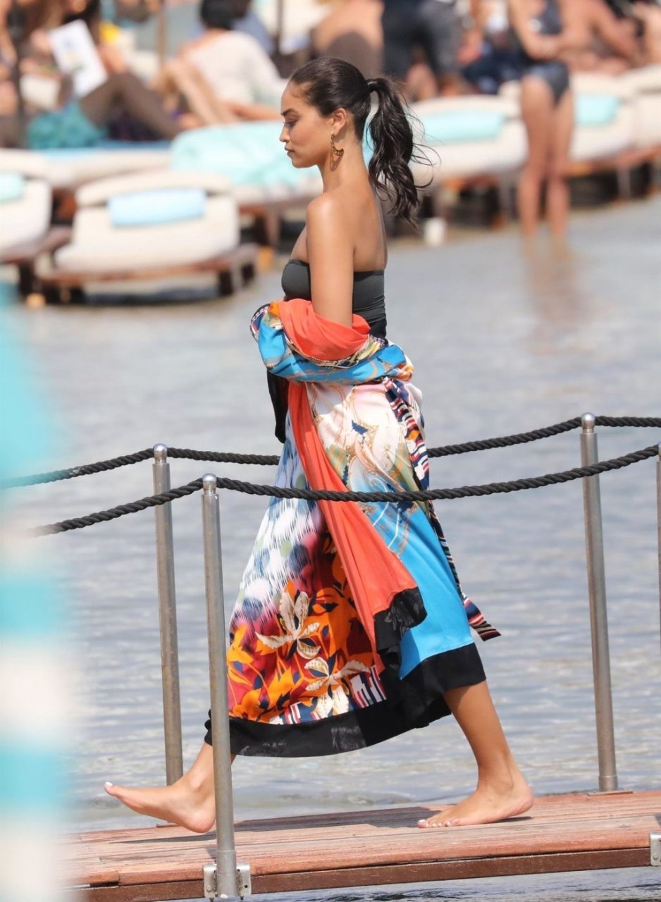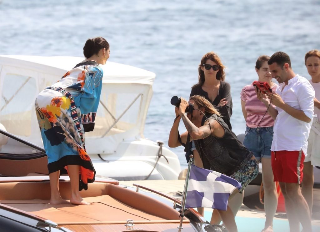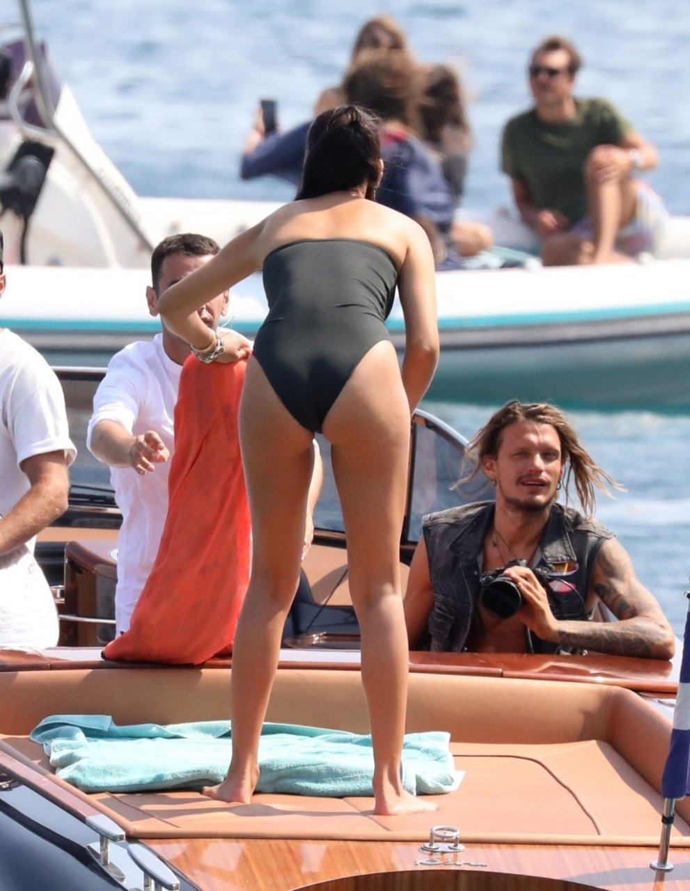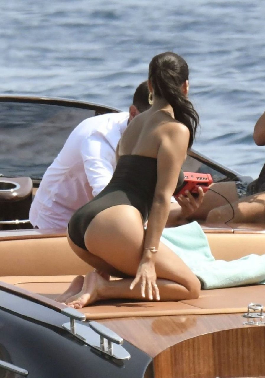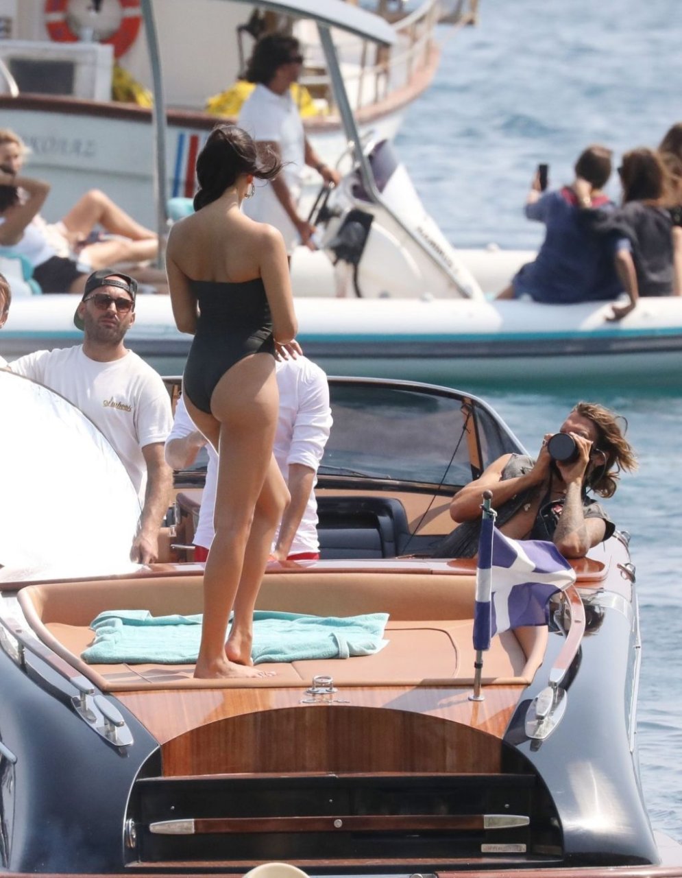 Sexy modelo de lencería de Victoria’s Secret, Shanina Shaik, luce su figura en un sexy traje de baño negro mientras posa en un barco bajo el sol griego filmando un comercial en Nammos, Playa Psarou en Mykonos, 09/05/2019. El actor canadiense Nick Bateman también se unió a Shanina en la sesión, mostrando sus músculos mientras paseaba en su moto acuática.
