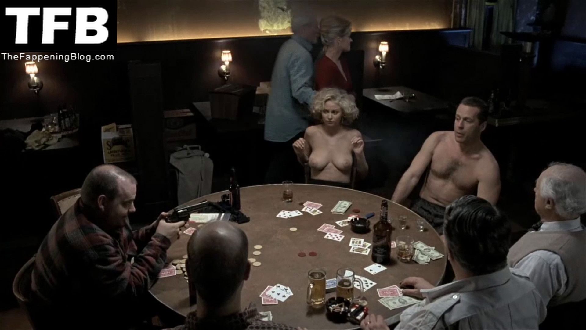 Shannah Laumeister está sentada sin camiseta en una mesa de cartas dándonos una buena vista de sus bonitos pechos mientras se sienta junto a Bruce Willis y juegan al póker desnudos.