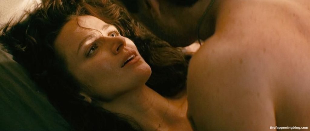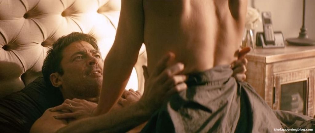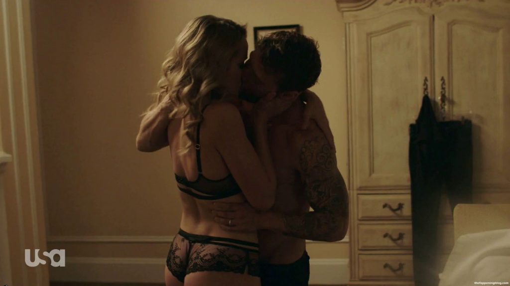 Shantel VanSanten está teniendo sexo con un hombre mientras lo monta en una cama, mostrando su espalda desnuda y un ligero vistazo del costado de su pecho antes de que él la voltee, y ahora tienen sexo con él encima de ella.From