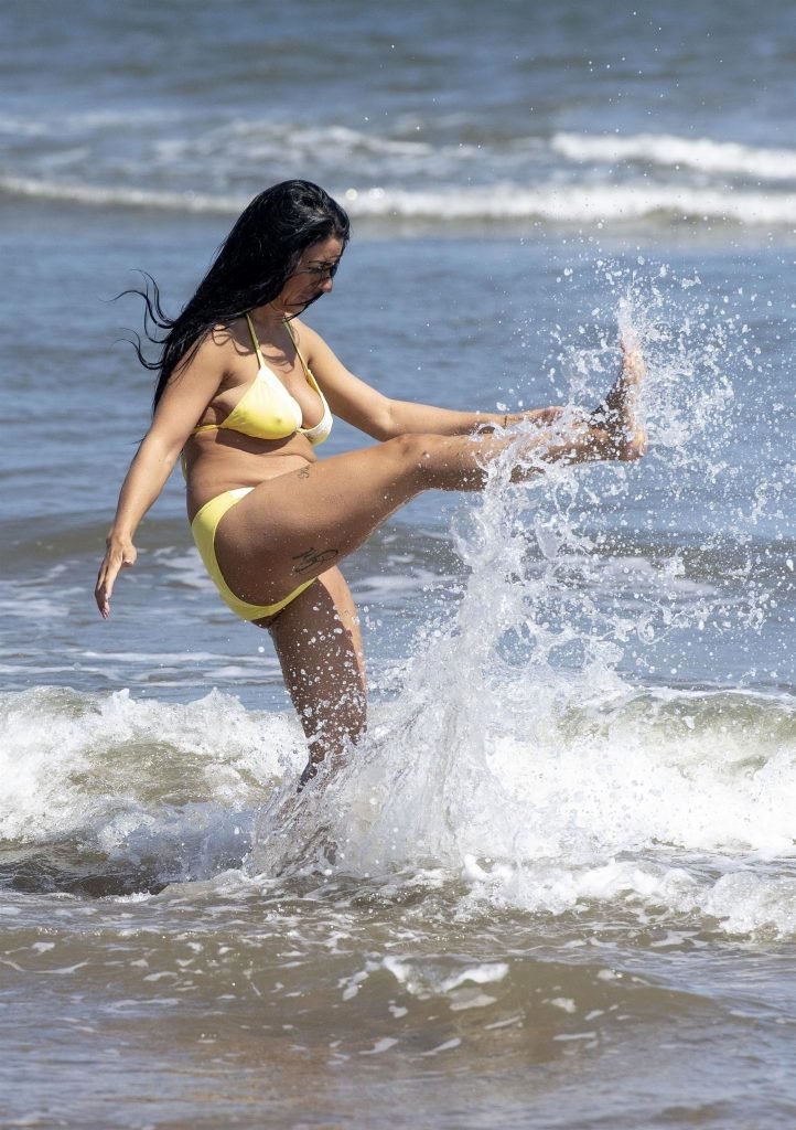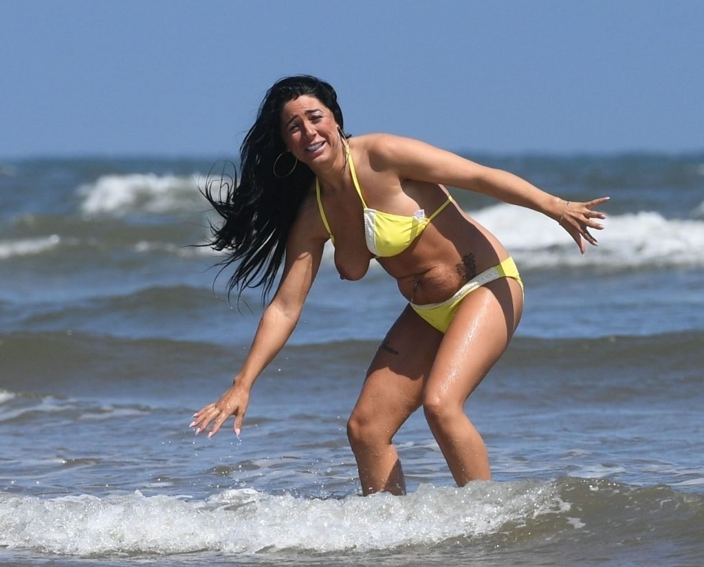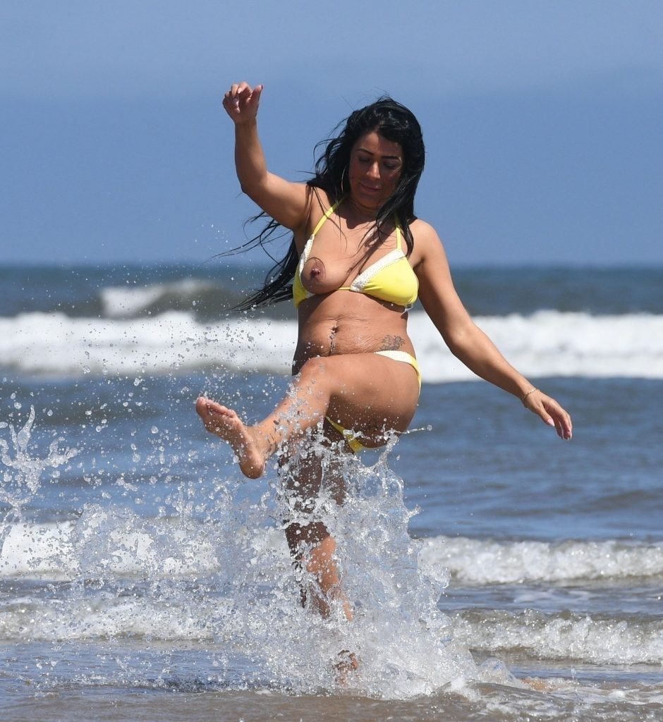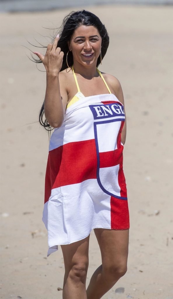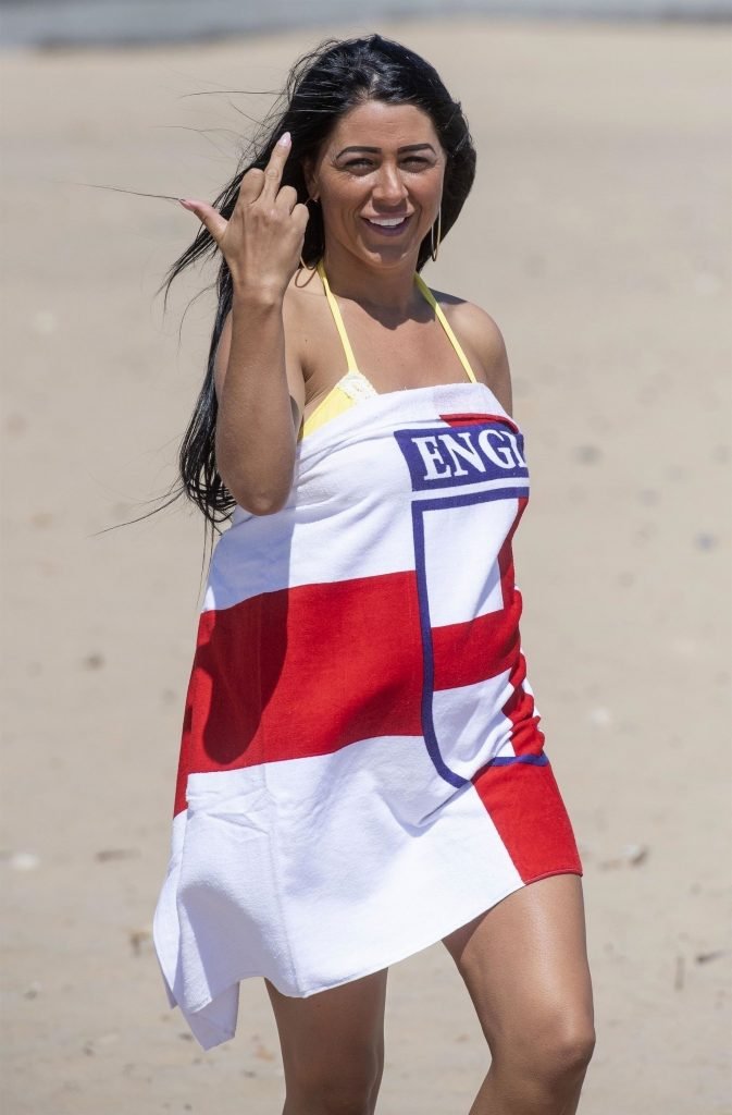 Big Brother’s Simone Reed fue vista en una playa entrando en el espíritu de la Copa del Mundo con una toalla de Inglaterra, 27/06/2018. Simone causa sensación al meterse en el agua en una exhibición llamativa y fue sorprendida por una ola, haciendo que uno de sus pechos se saliera de su bikini.