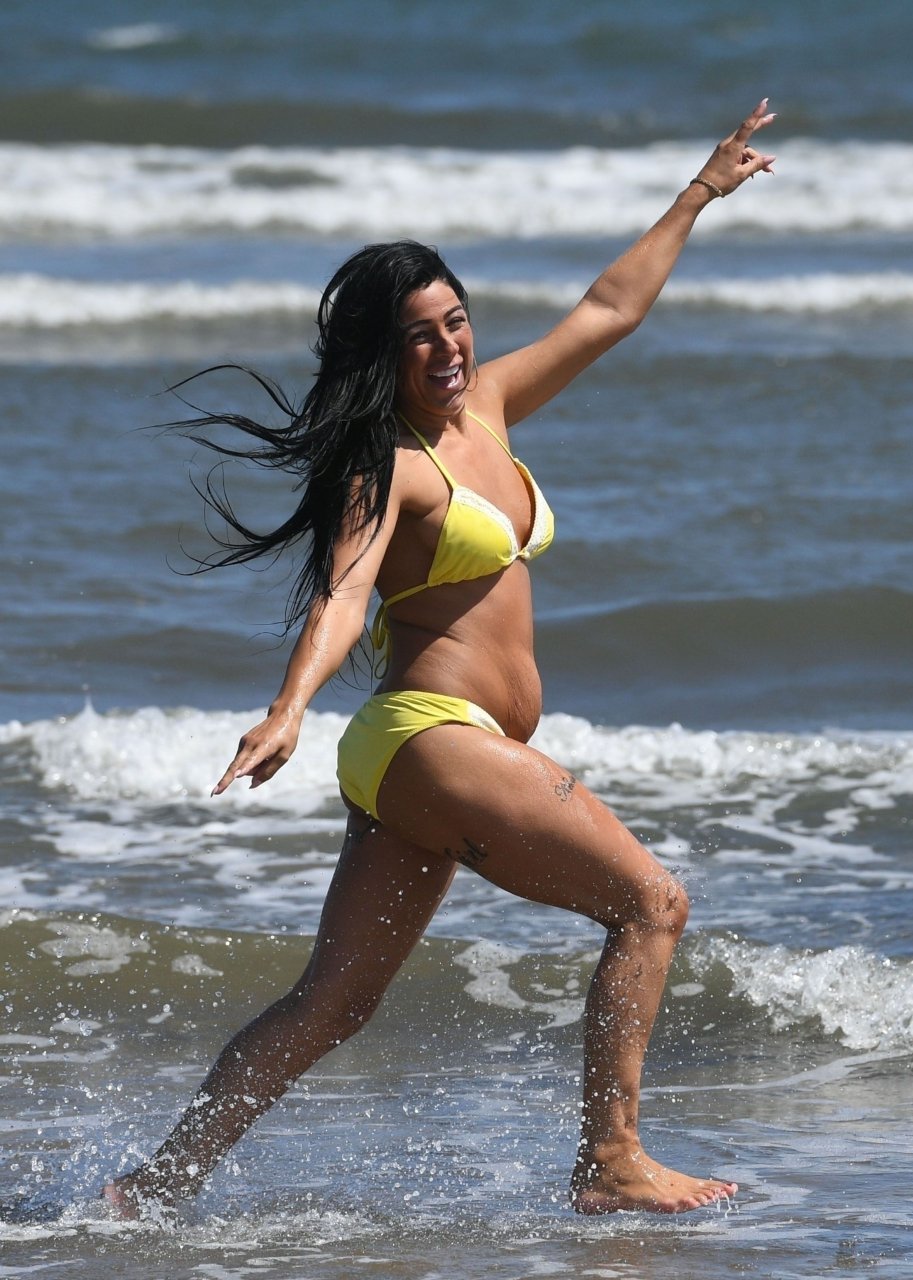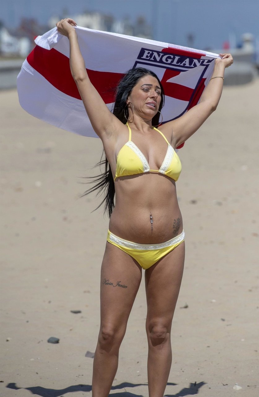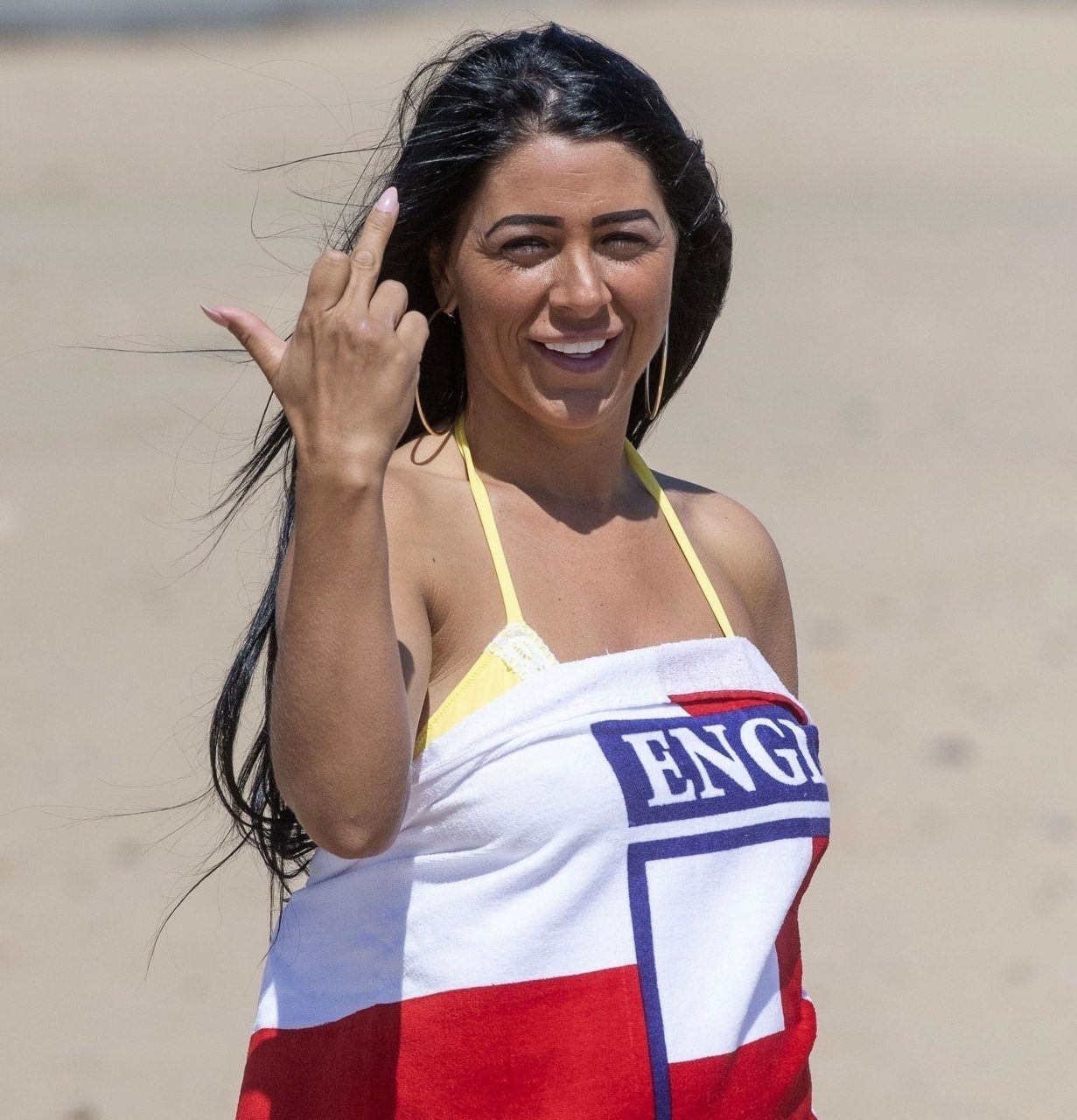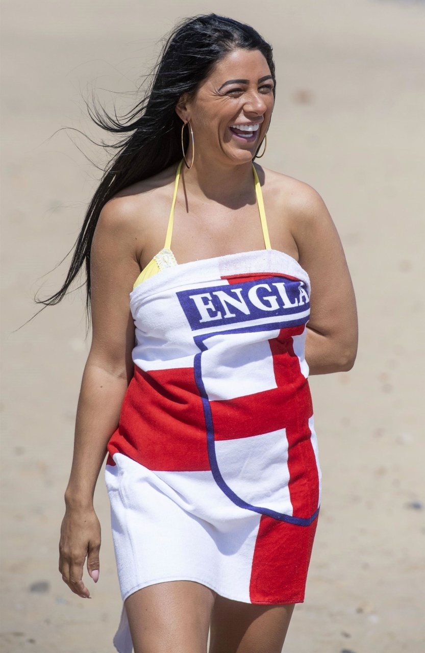 Big Brother’s Simone Reed fue vista en una playa entrando en el espíritu de la Copa del Mundo con una toalla de Inglaterra, 27/06/2018. Simone causa sensación al meterse en el agua en una exhibición llamativa y fue sorprendida por una ola, haciendo que uno de sus pechos se saliera de su bikini.