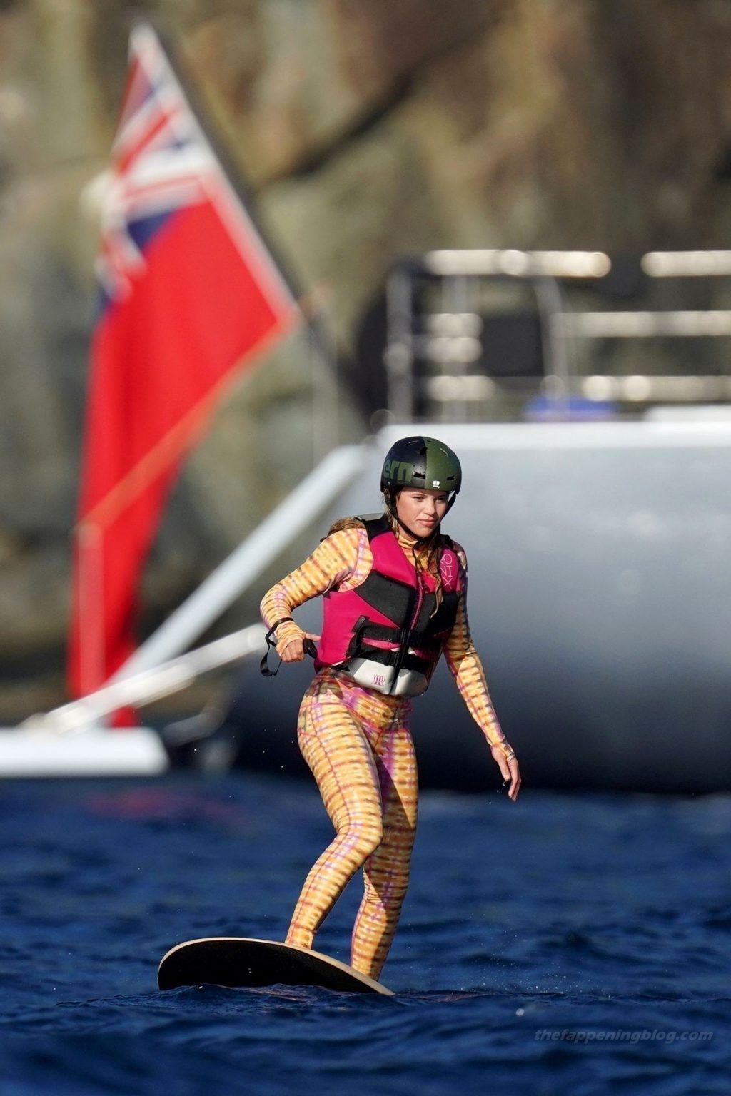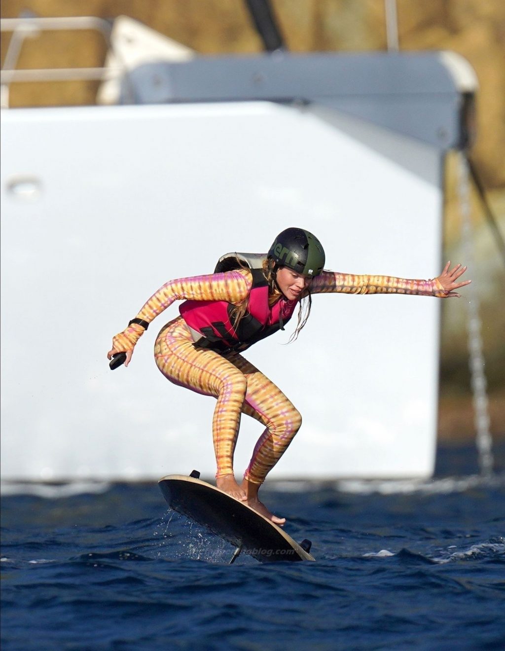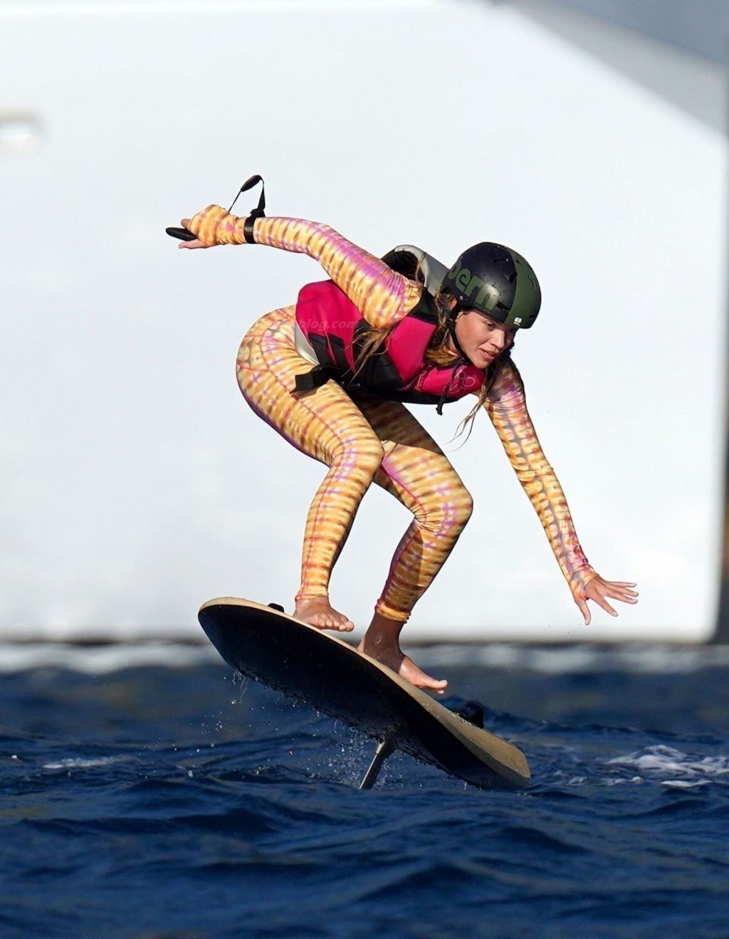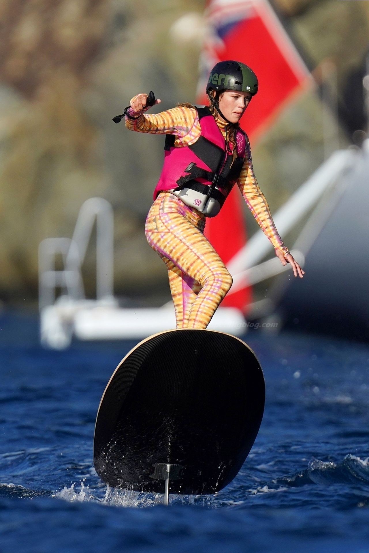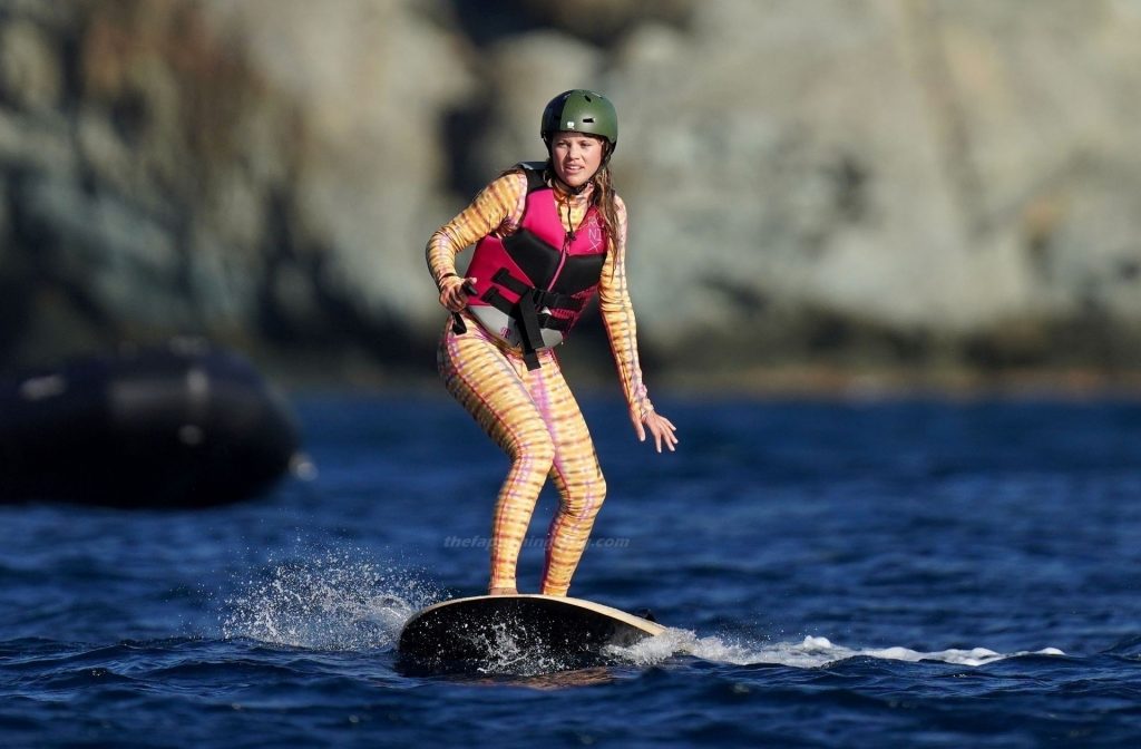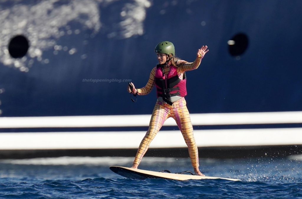 El legendario cantautor estadounidense de 71 años, Lionel, lucía impresionante mientras sonreía mostrando su bronceado físico bajo el intenso sol, mientras Sofia deslumbraba con un top de bikini blanco mientras se ponía su traje de neopreno.