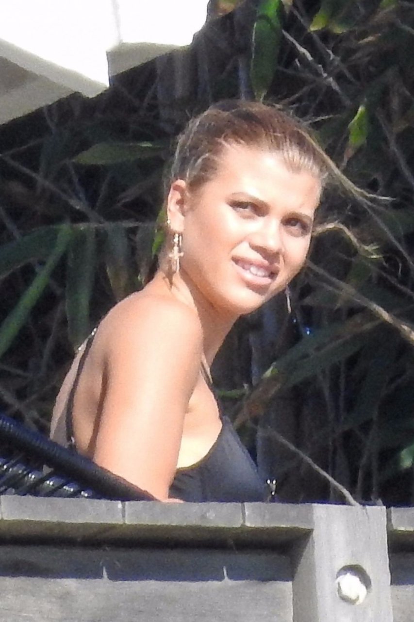 Model Sofia Richie (20) muestra sus glúteos en la fiesta en la piscina de un amigo. Sofia luce genial con un traje de baño negro de una pieza mientras disfruta tomando el sol con sus amigos, 29/09/2018.