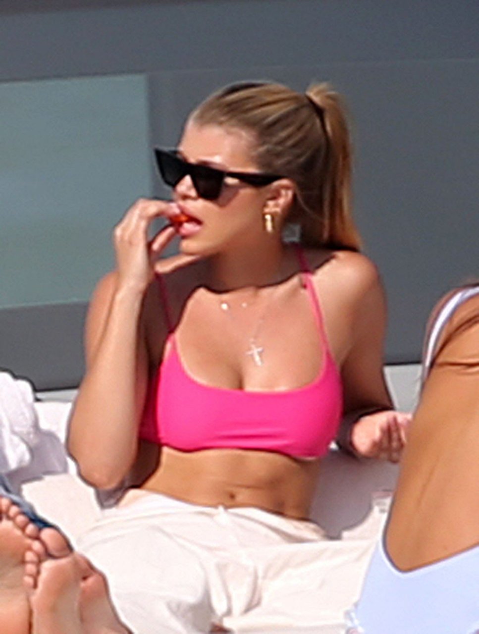 Model Sofia Richie lleva un top de bikini rosa fuerte mientras se relaja en un yate con su novio Scott Disick en Miami, 17/02/2019.