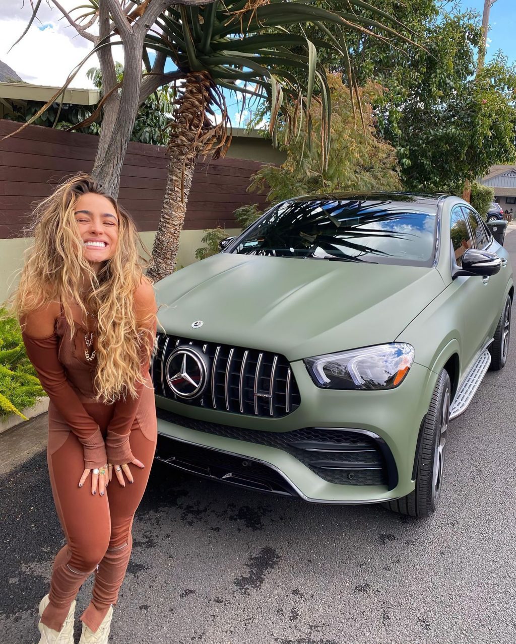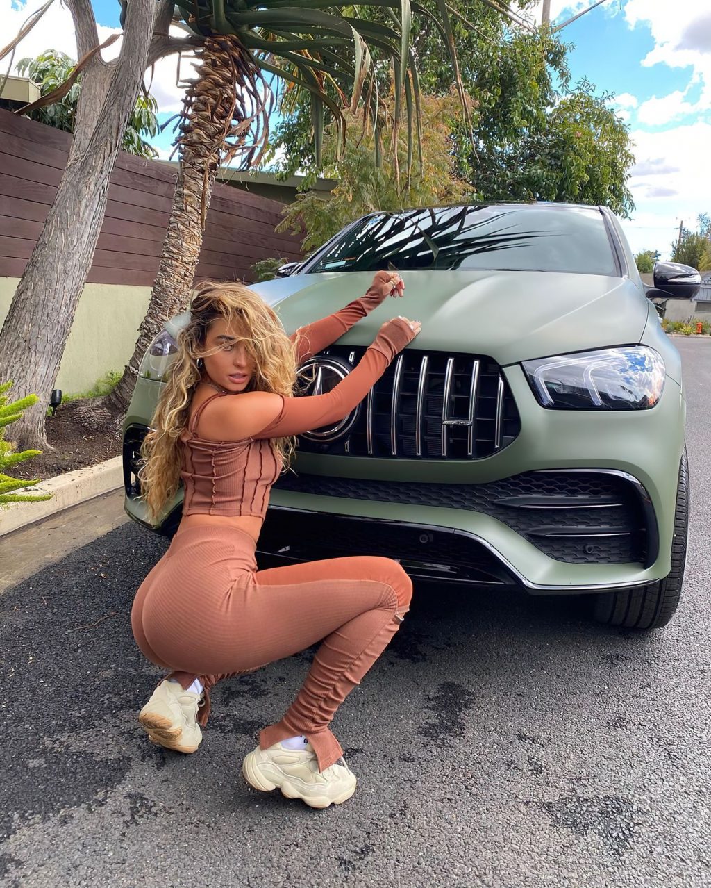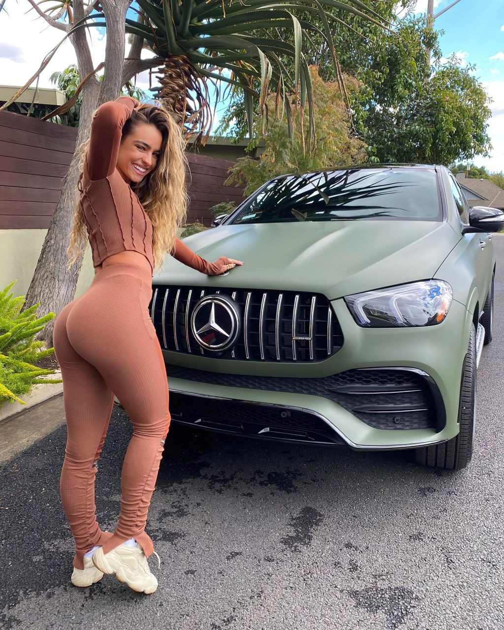 Model y amante del fitness Sommer Ray muestra sus tetas y pechos mientras posa con ropa deportiva ajustada en una sesión de fotos para redes sociales de Infamous Motor Group (marzo 2021).