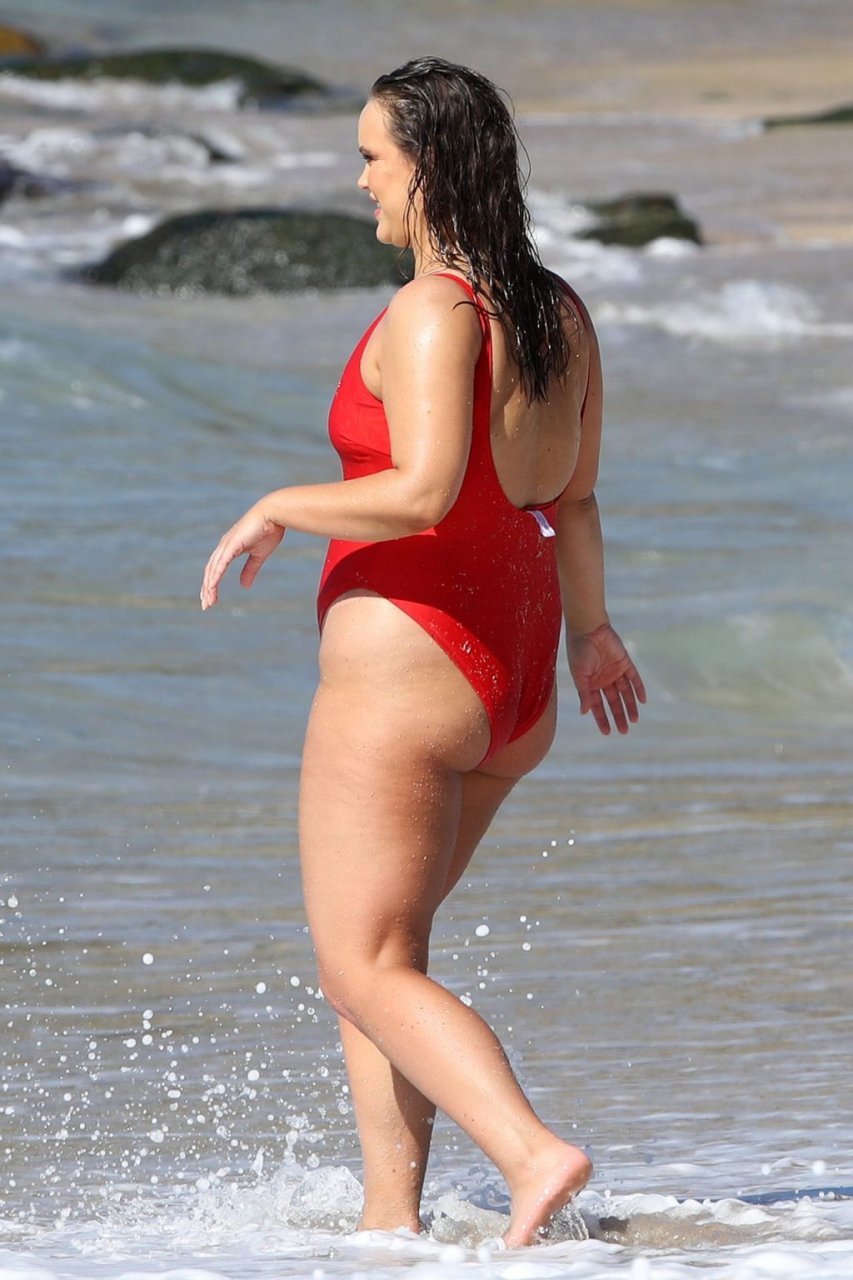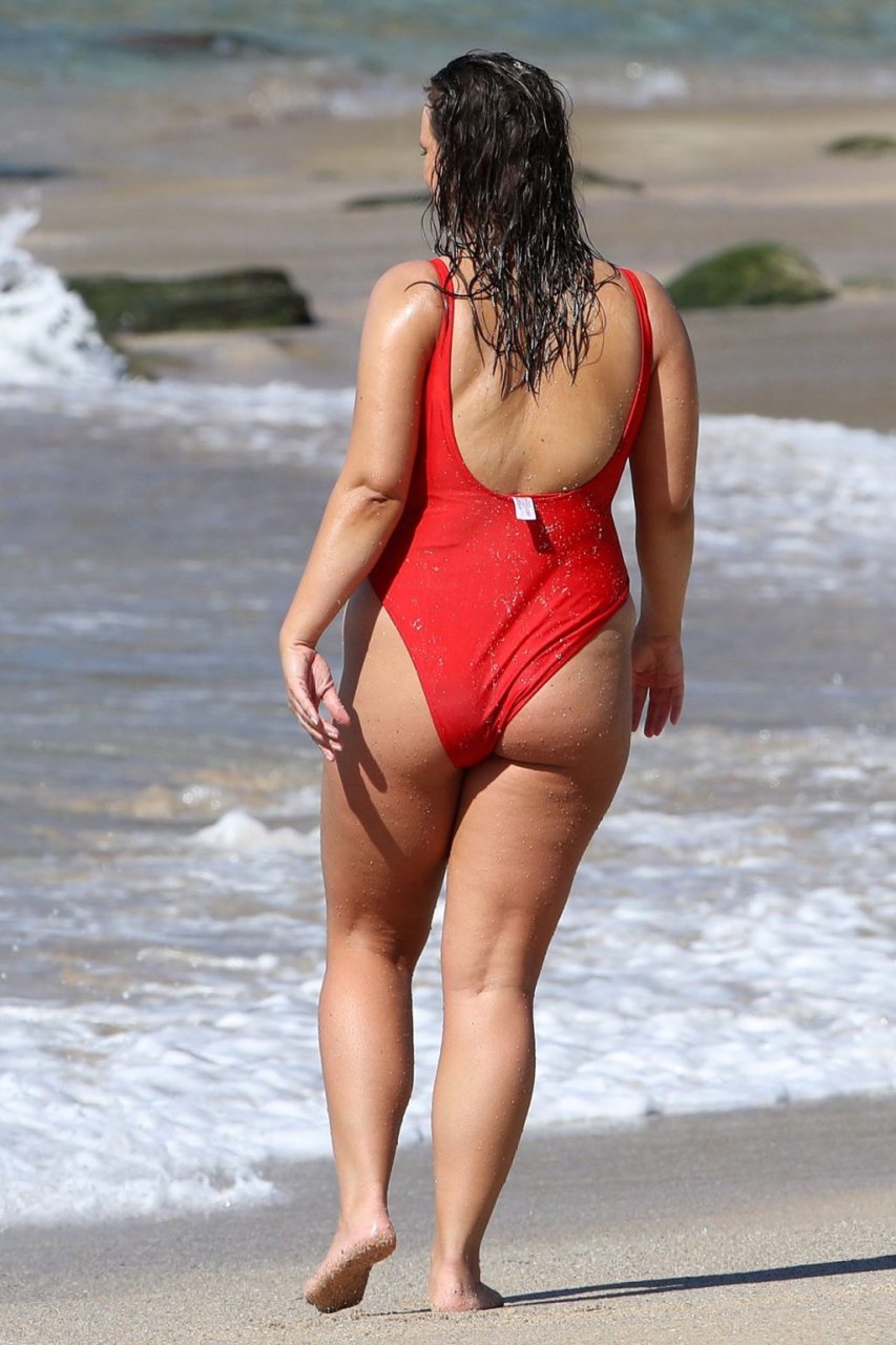Curvilínea modelo Sophia Brennan fue fotografiada con un traje de baño rojo de una pieza en el set de una sesión de fotos de trajes de baño en Sídney, 16/08/2019.