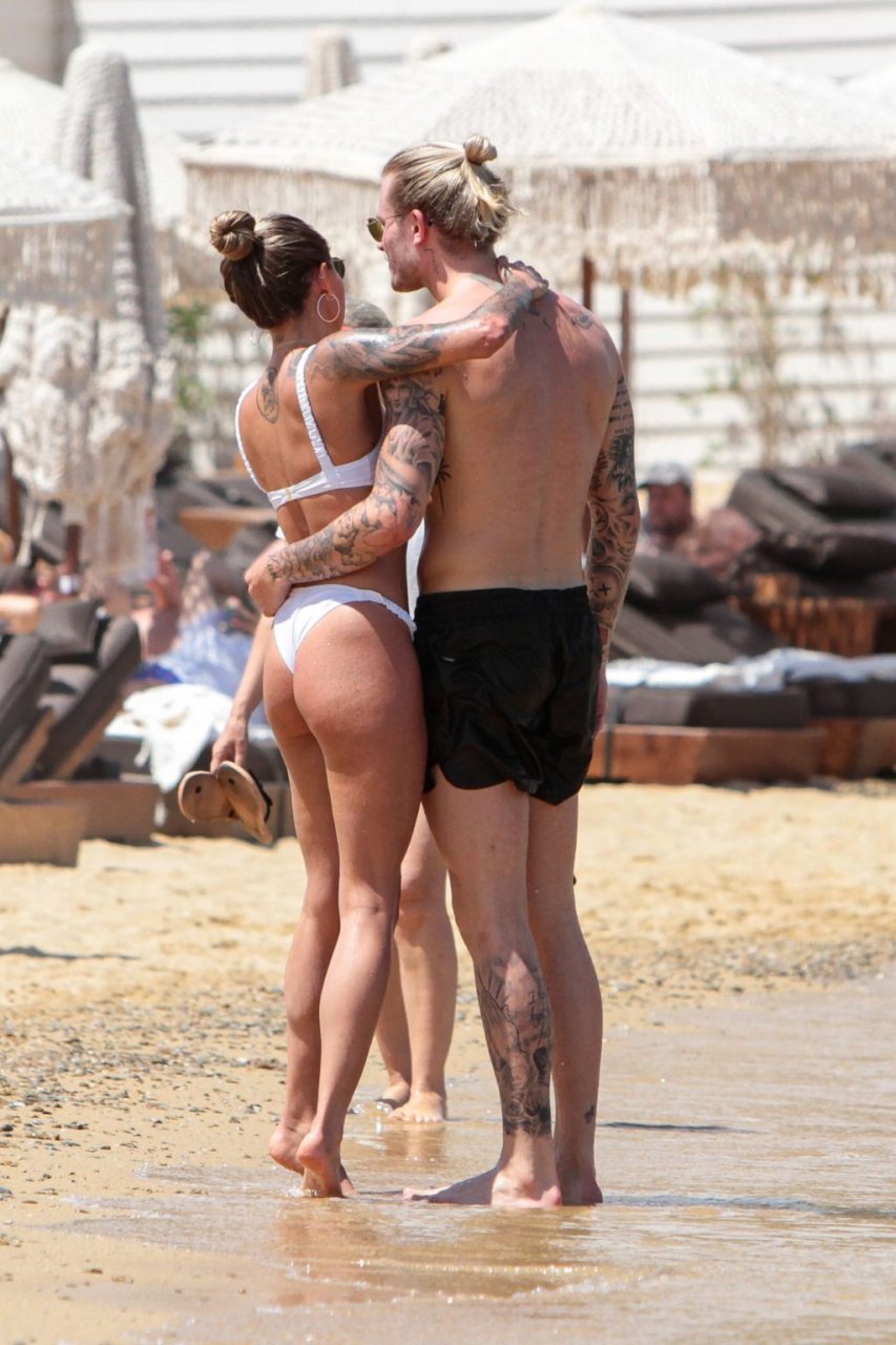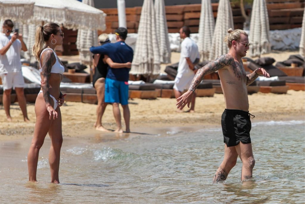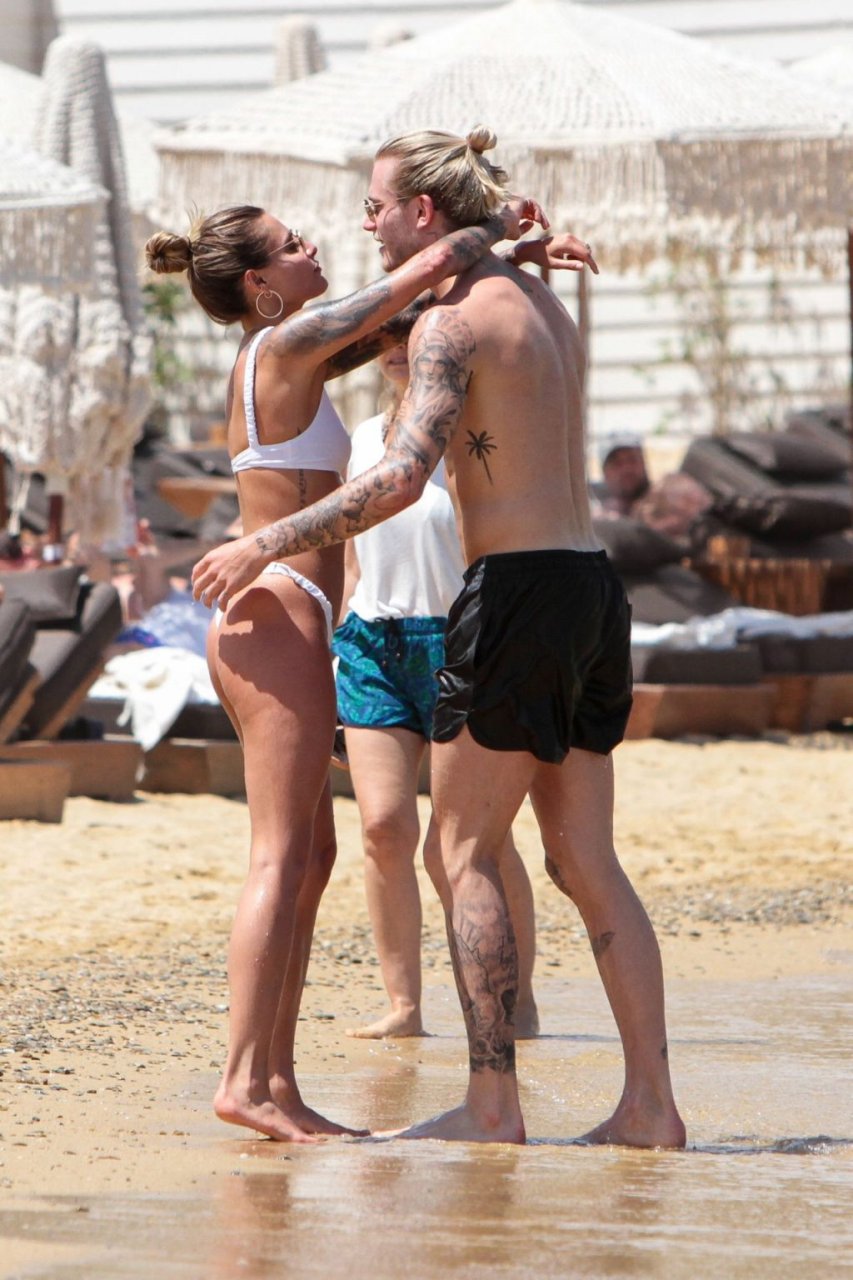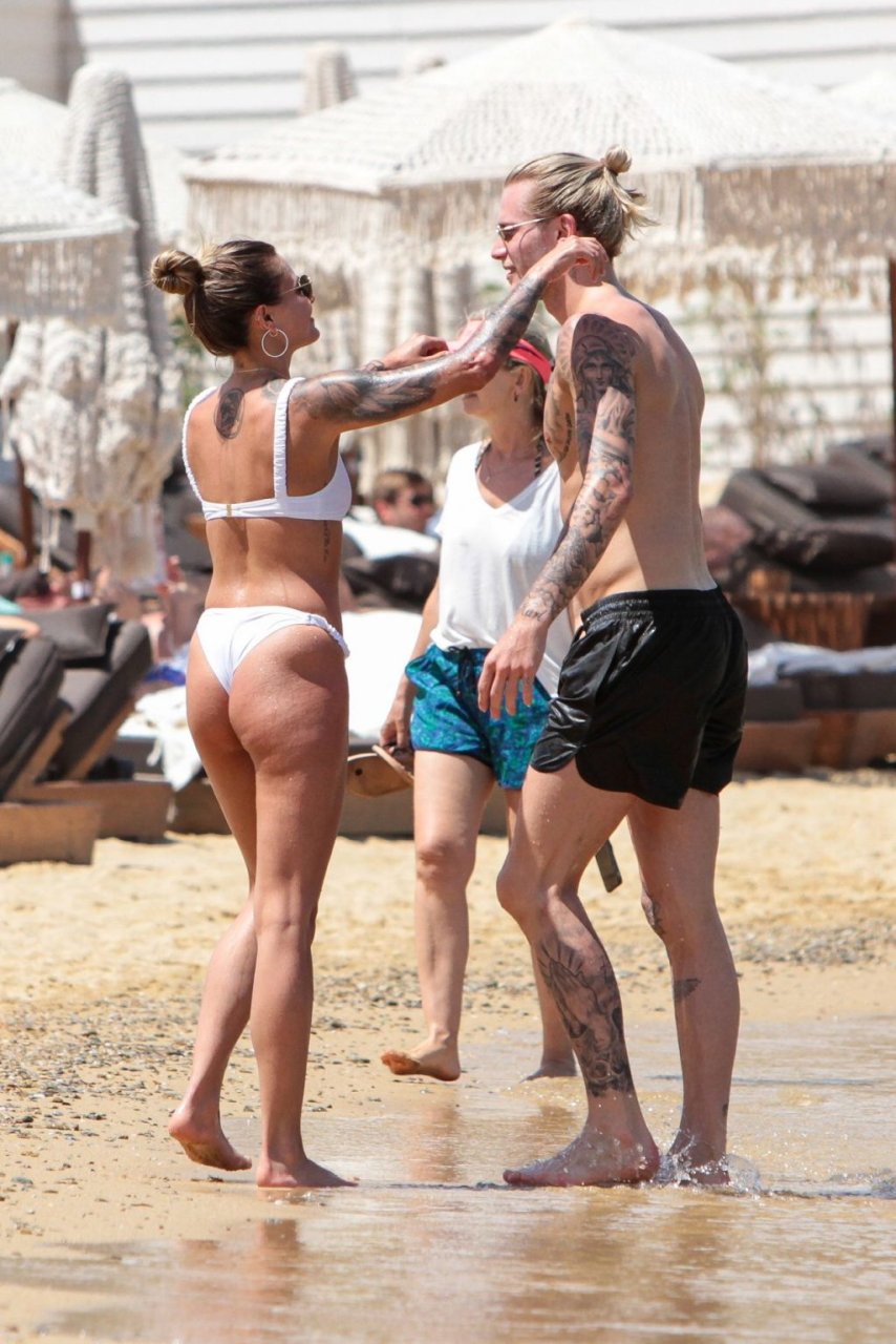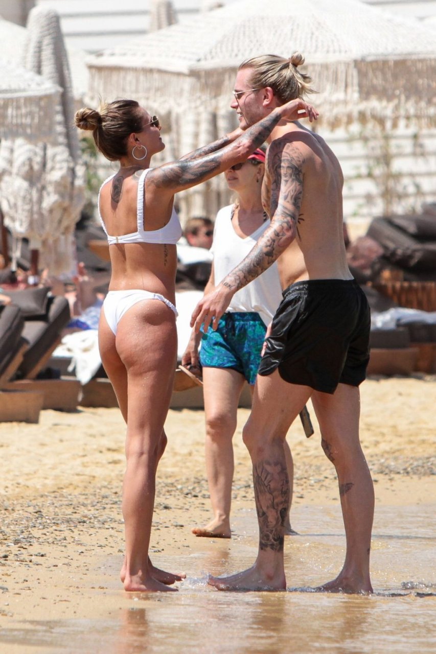 Loris Karius y Sophia Thomalla se ven disfrutando en la playa de la isla de Mykonos, 01/06/2019. La actriz/estrella de TV/modelo tatuada de 29 años presume su figura, vistiendo un bikini blanco.