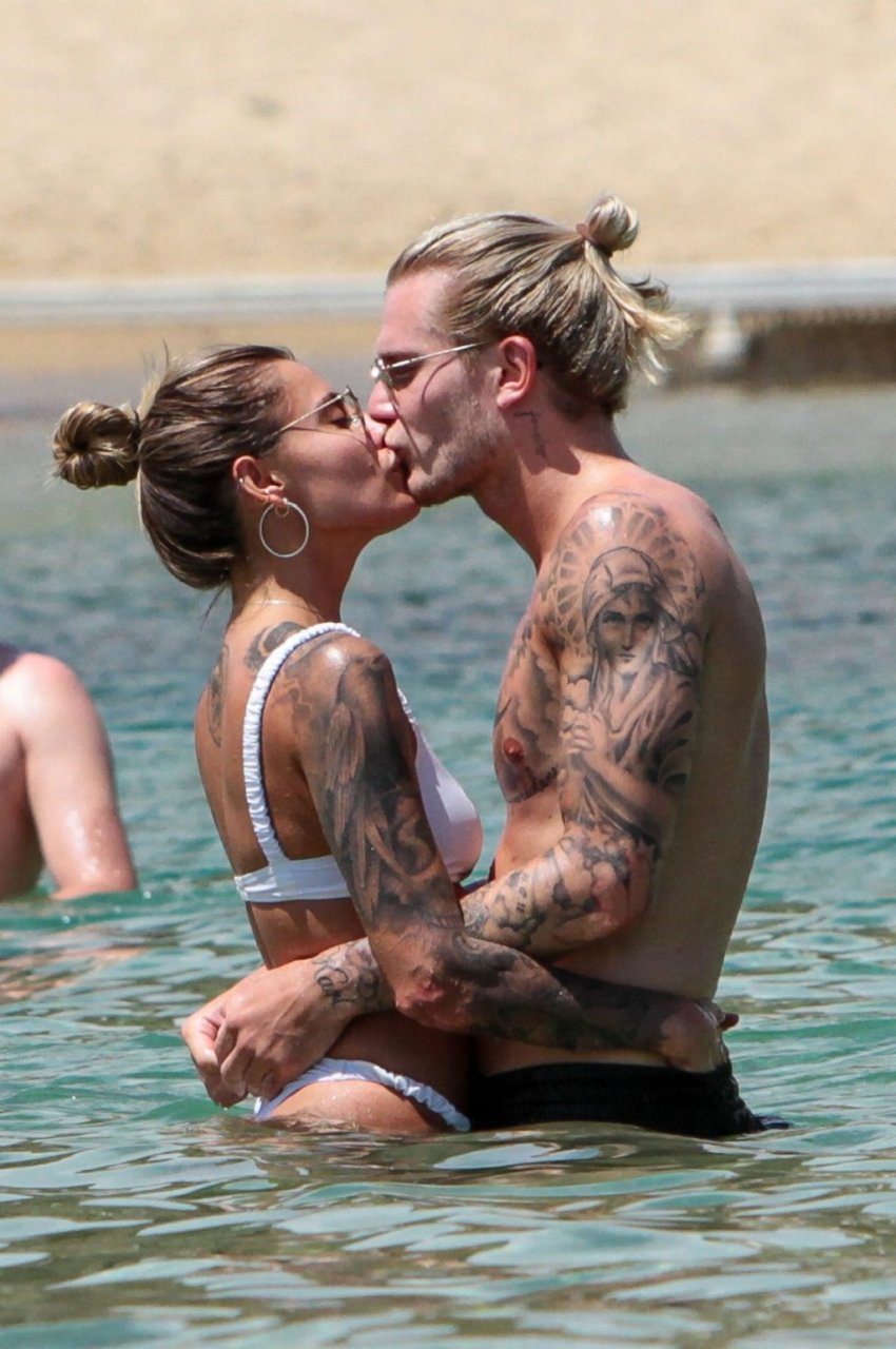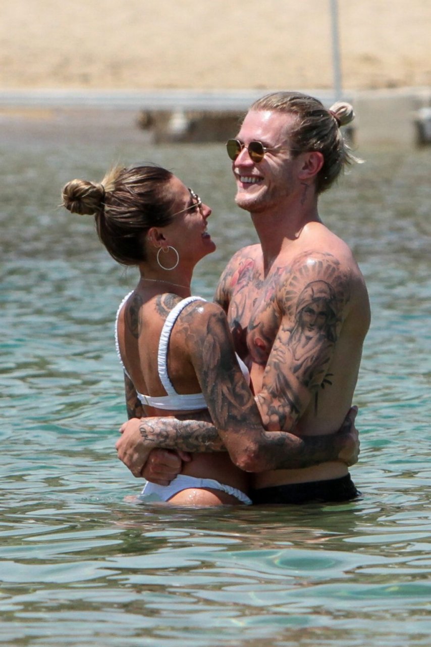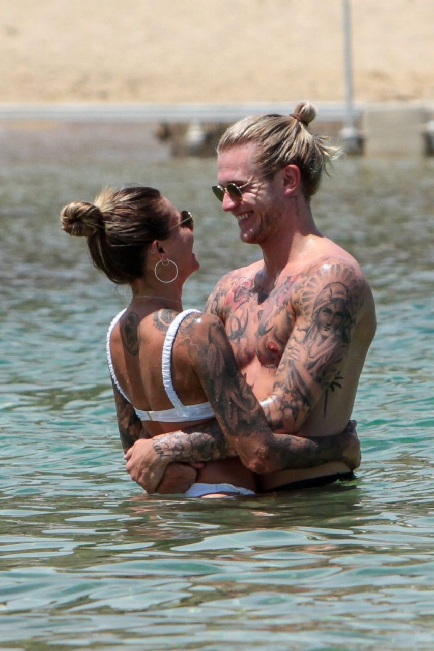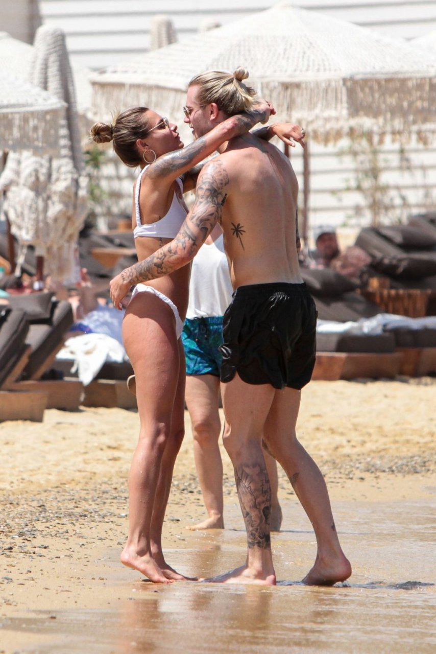 Loris Karius y Sophia Thomalla se ven disfrutando en la playa de la isla de Mykonos, 01/06/2019. La actriz/estrella de TV/modelo tatuada de 29 años presume su figura, vistiendo un bikini blanco.