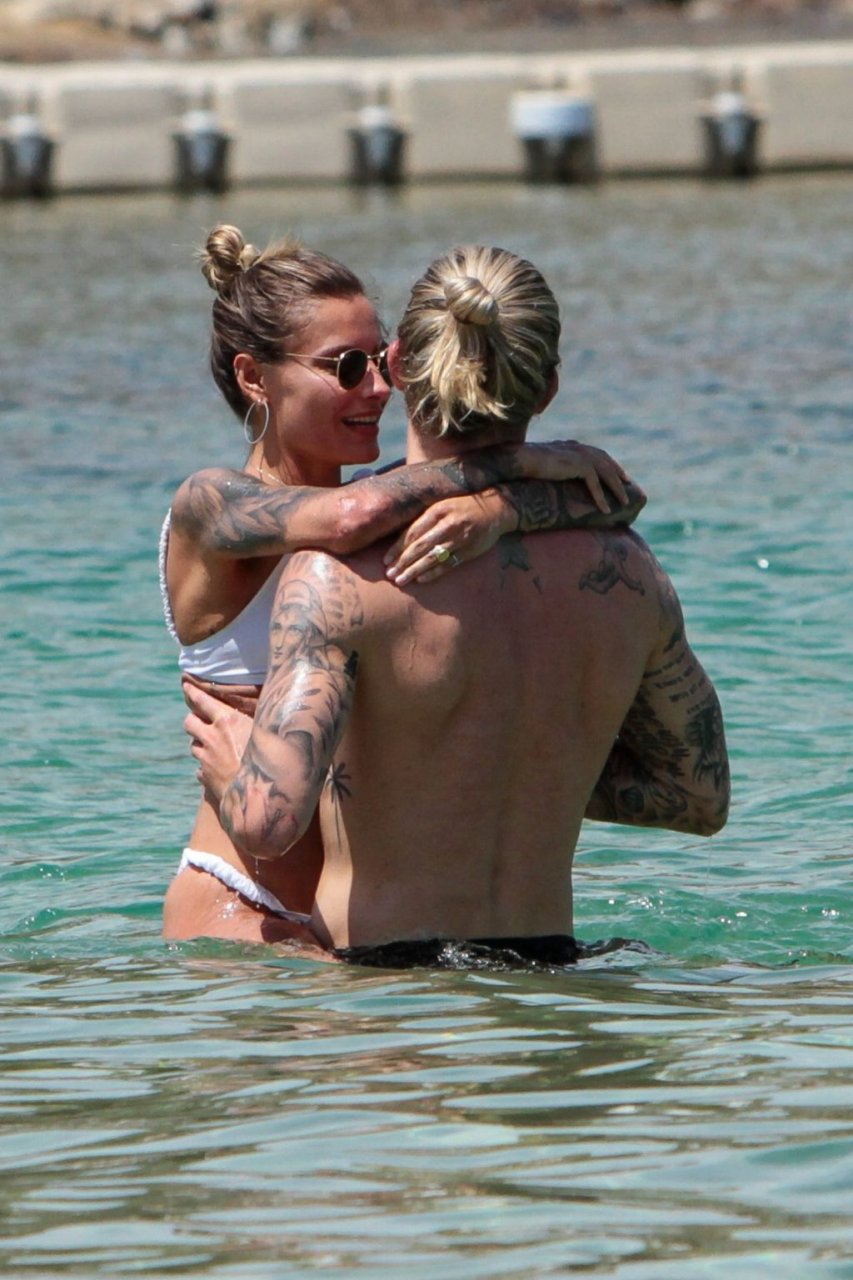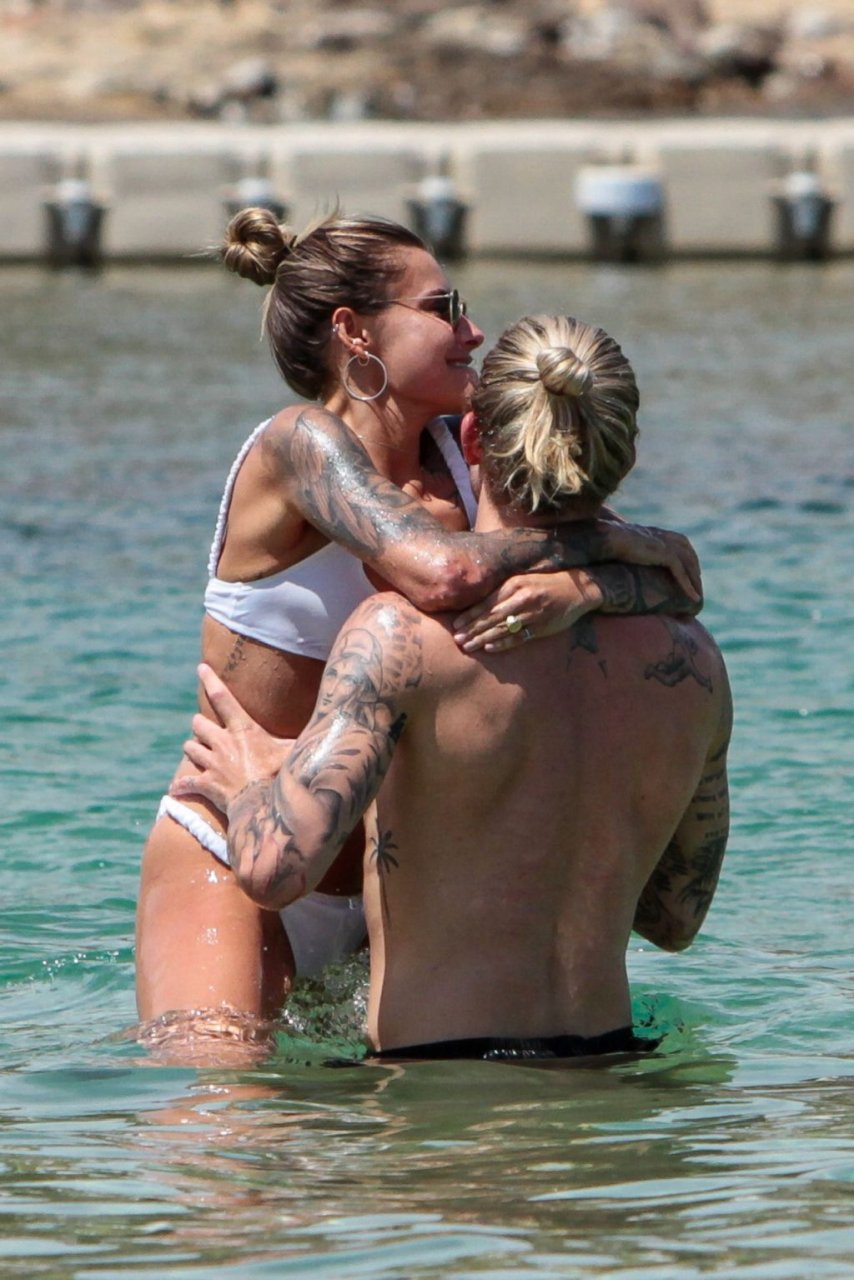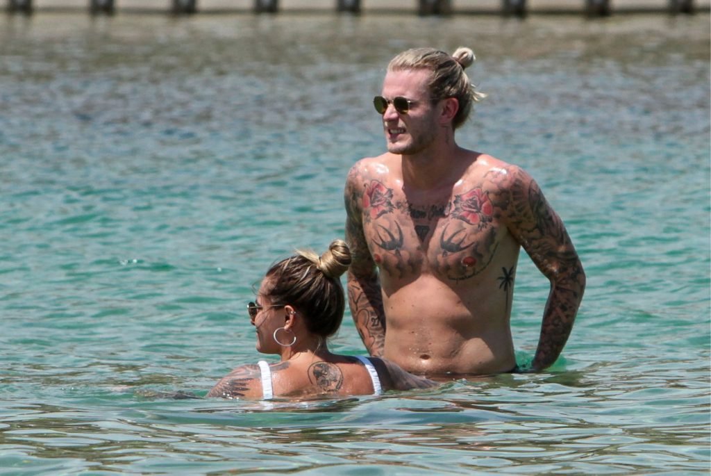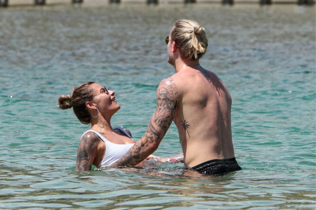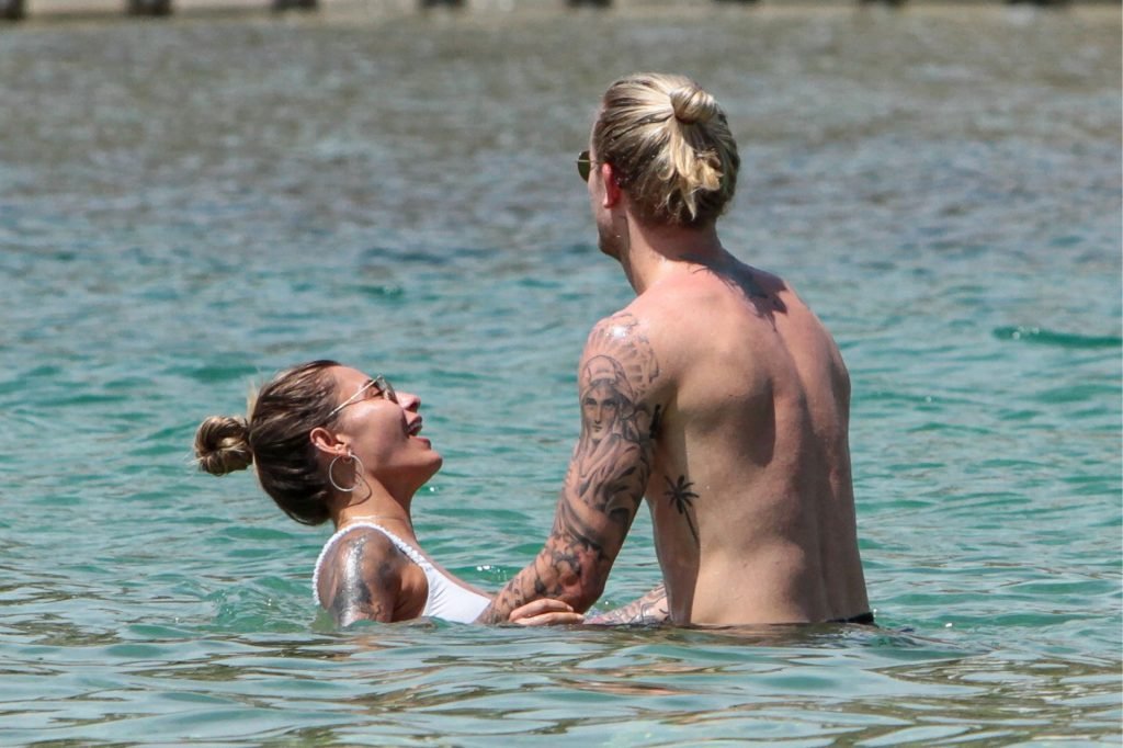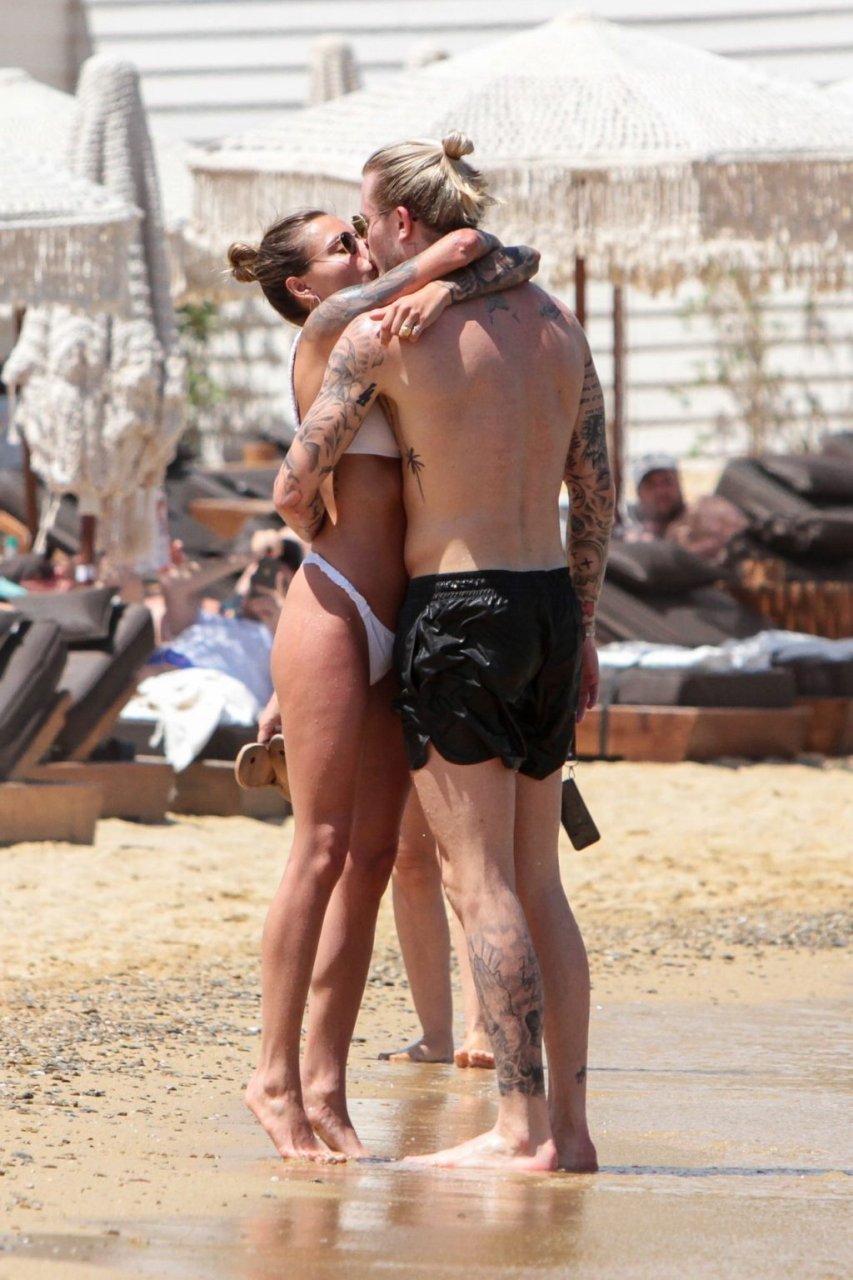 Loris Karius y Sophia Thomalla se ven disfrutando en la playa de la isla de Mykonos, 01/06/2019. La actriz/estrella de TV/modelo tatuada de 29 años presume su figura, vistiendo un bikini blanco.