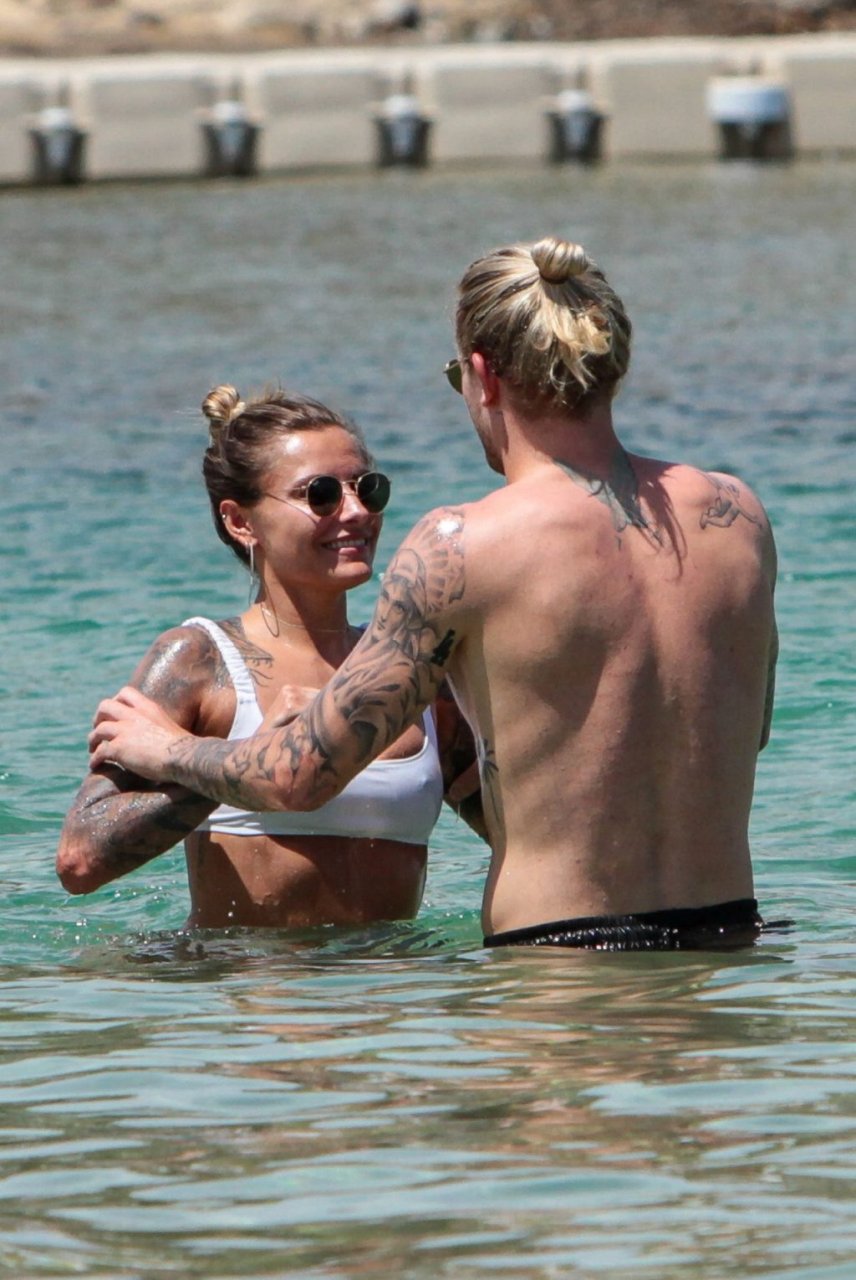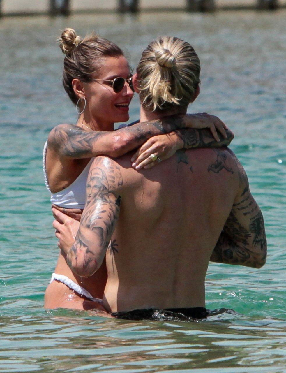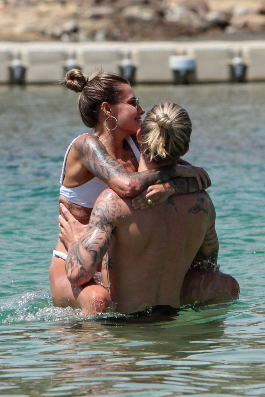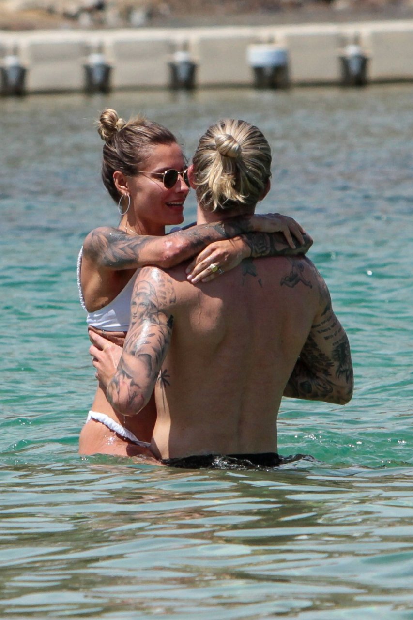 Loris Karius y Sophia Thomalla se ven disfrutando en la playa de la isla de Mykonos, 01/06/2019. La actriz/estrella de TV/modelo tatuada de 29 años presume su figura, vistiendo un bikini blanco.