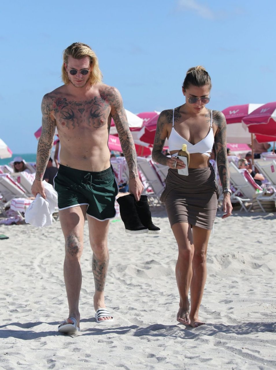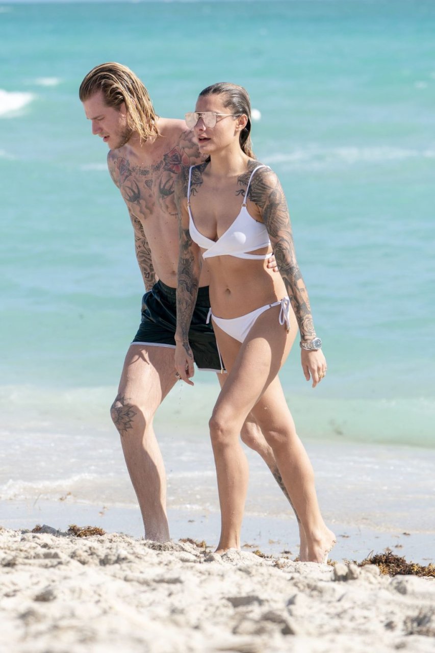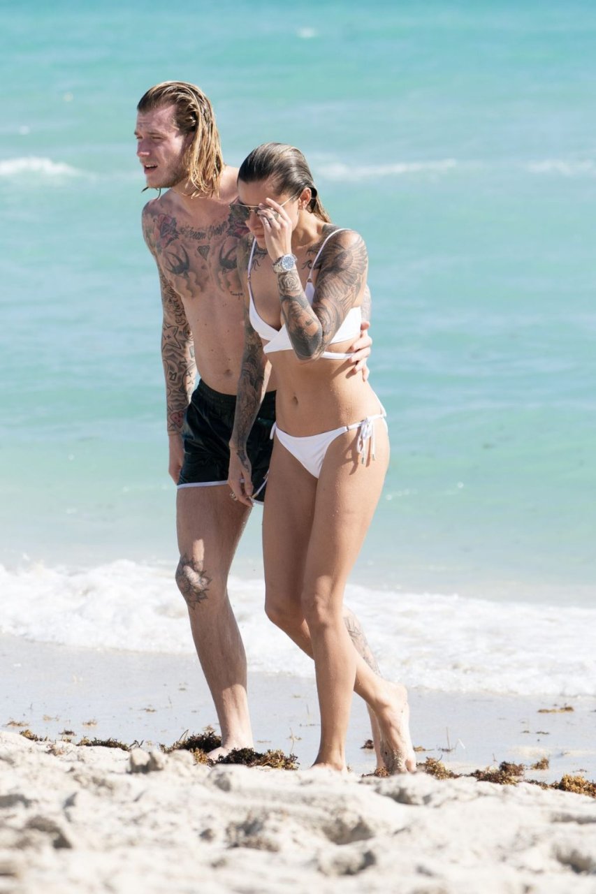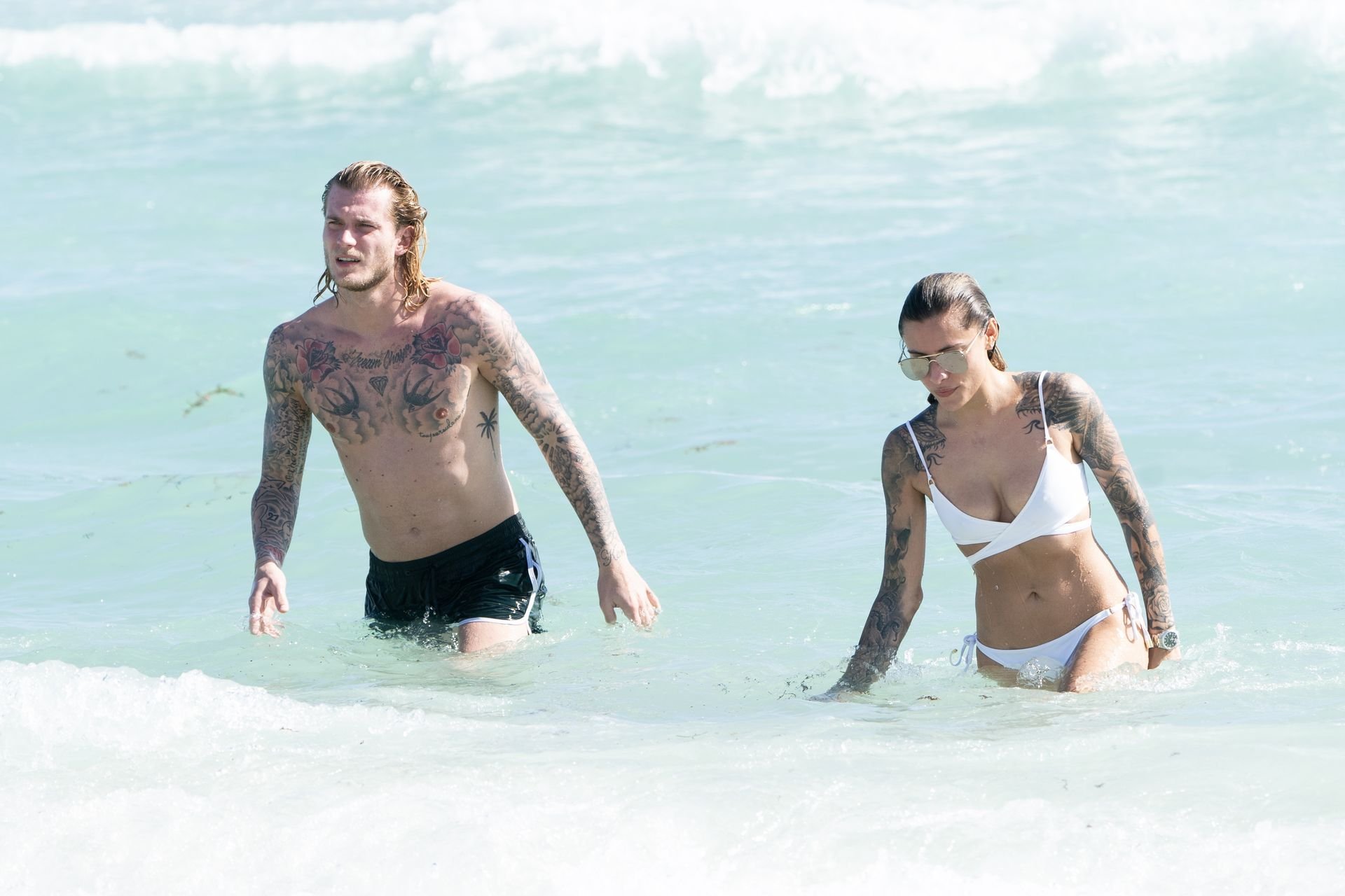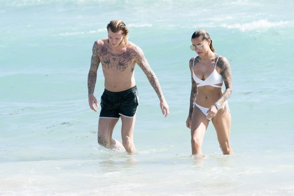 La belleza tatuada Sophia Thomalla y su nuevo novio, el portero Loris Karius, fueron vistos acercándose durante un divertido día en la playa en Miami, 30/12/2018.