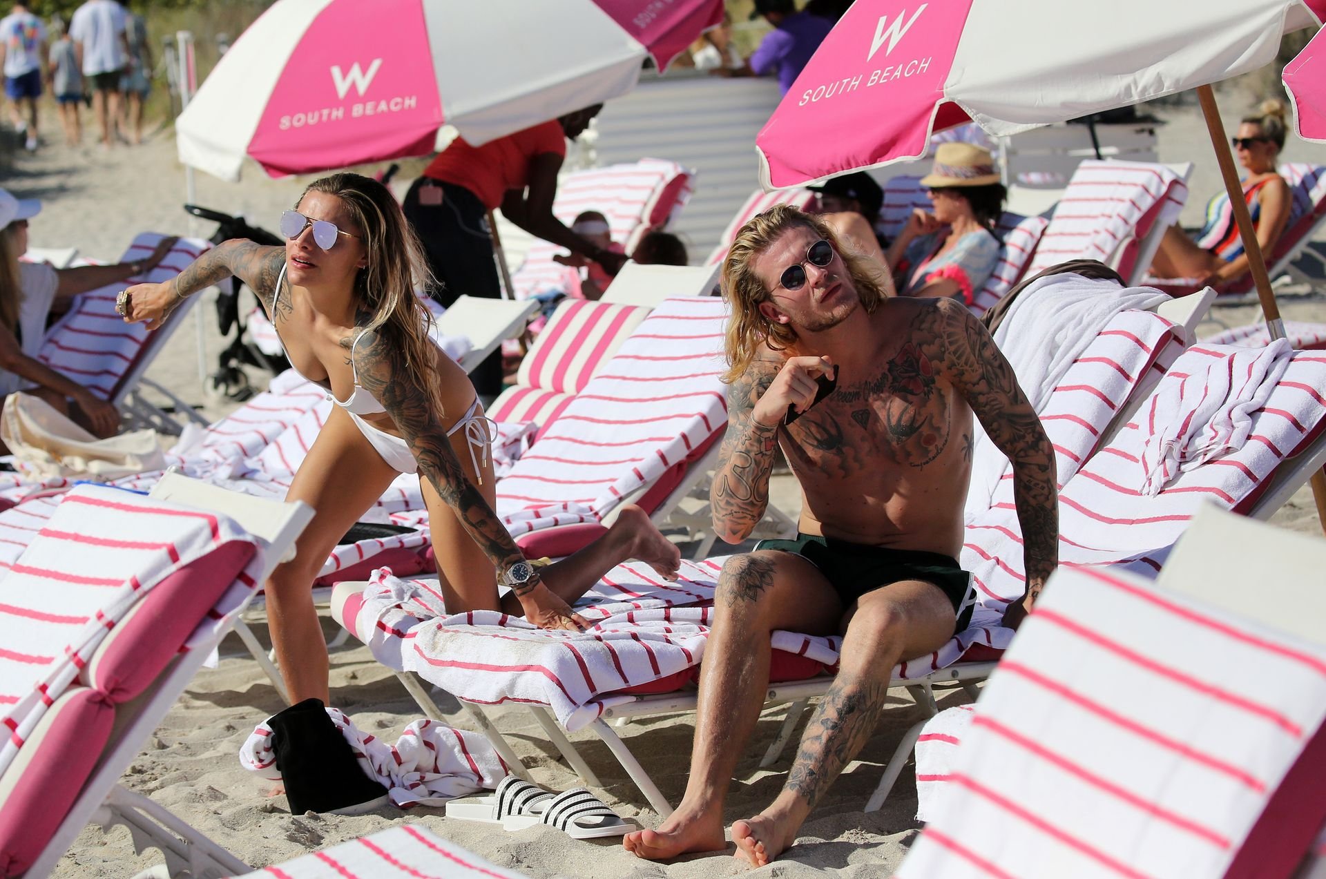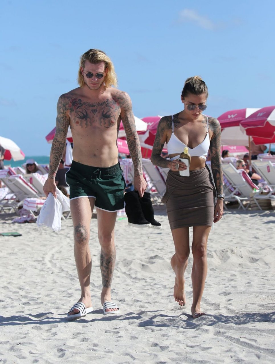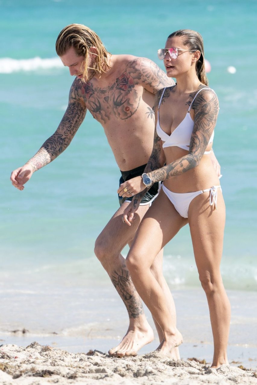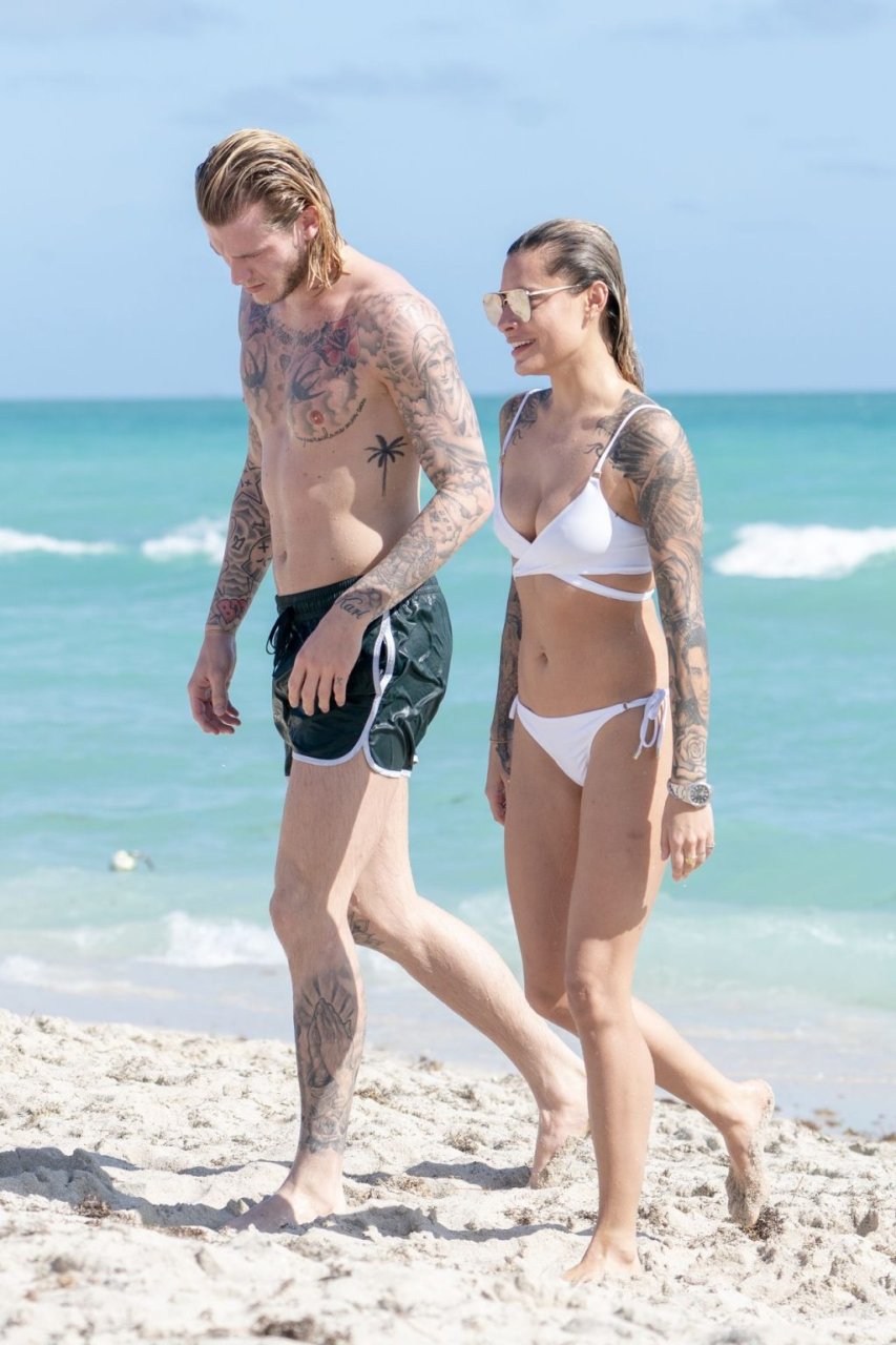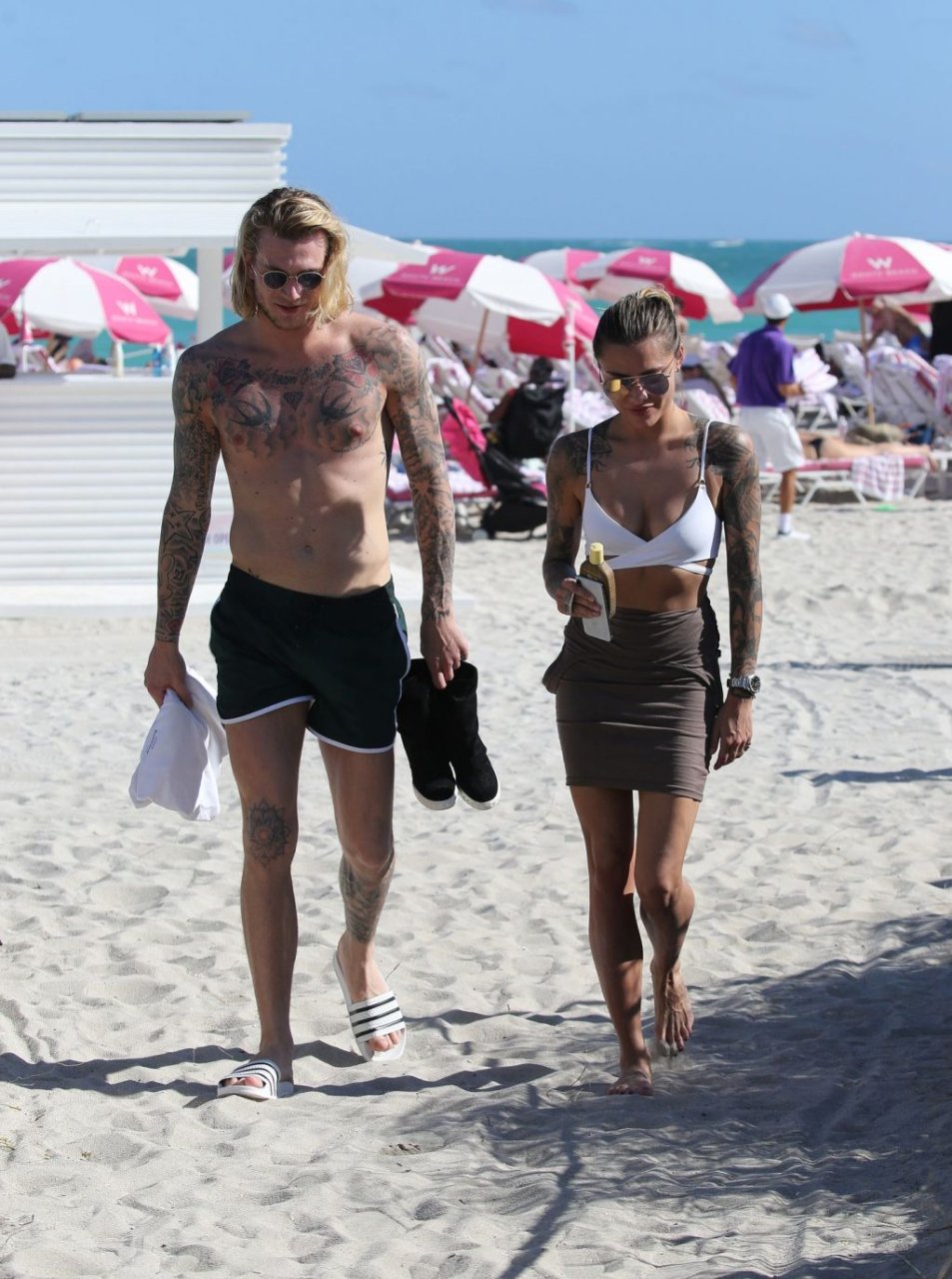 La belleza tatuada Sophia Thomalla y su nuevo novio, el portero Loris Karius, fueron vistos acercándose durante un divertido día en la playa en Miami, 30/12/2018.