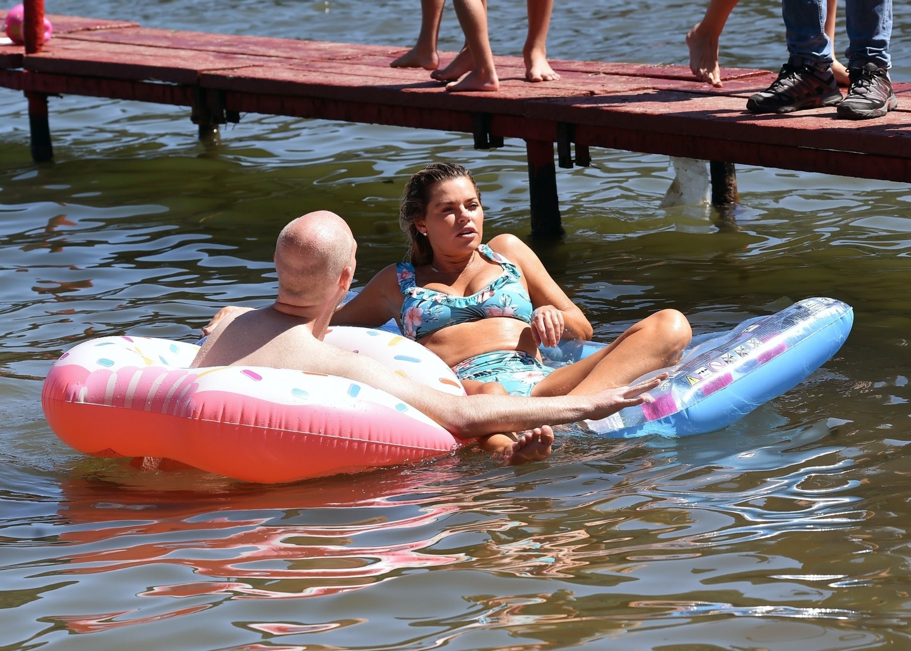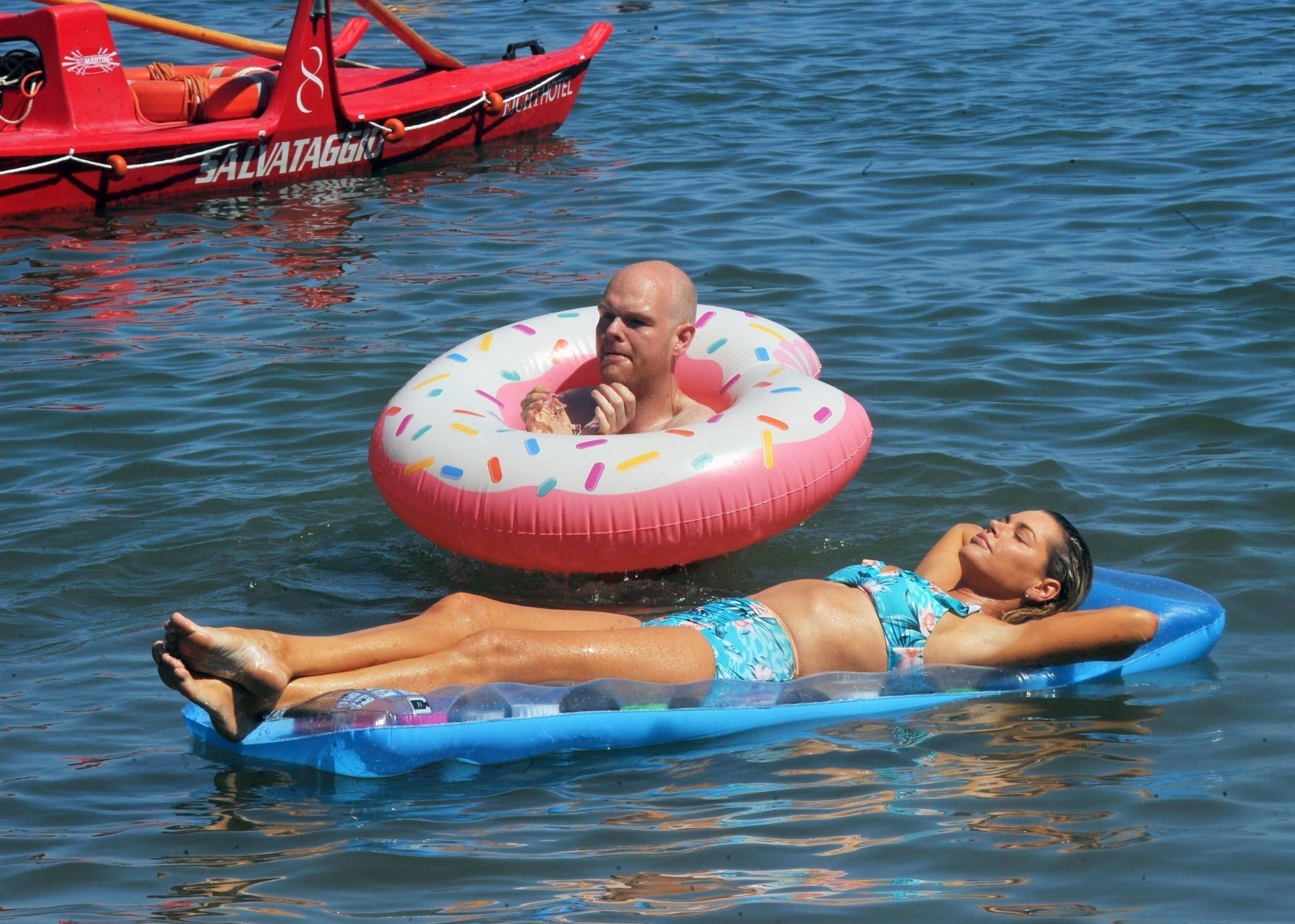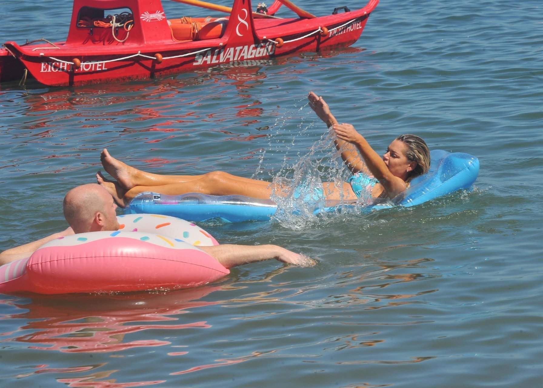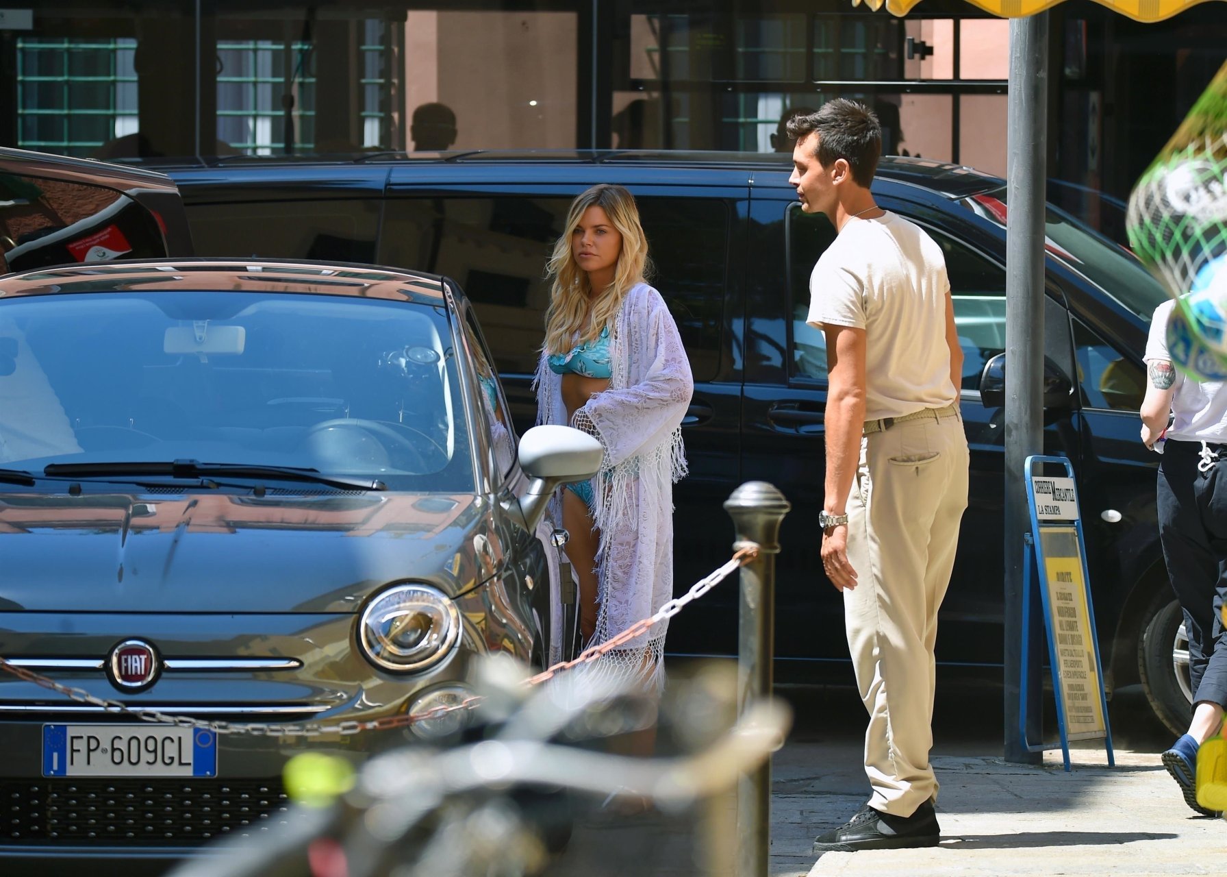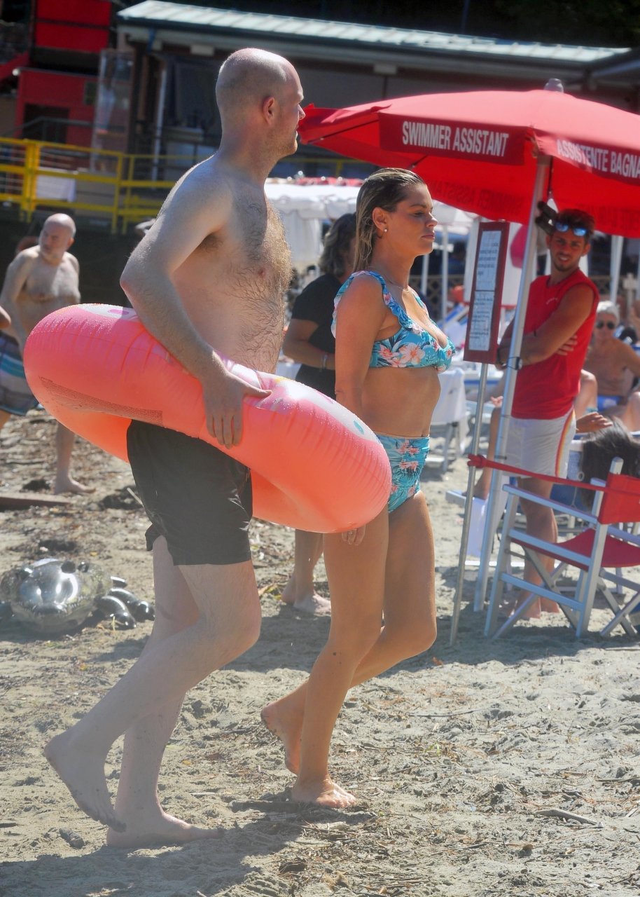 Sophie Monk fue fotografiada luciendo genial con un bikini azul de cintura alta mientras filmaba un programa de televisión con Oscar Gordon en la playa de Portofino, 14/07/2018.