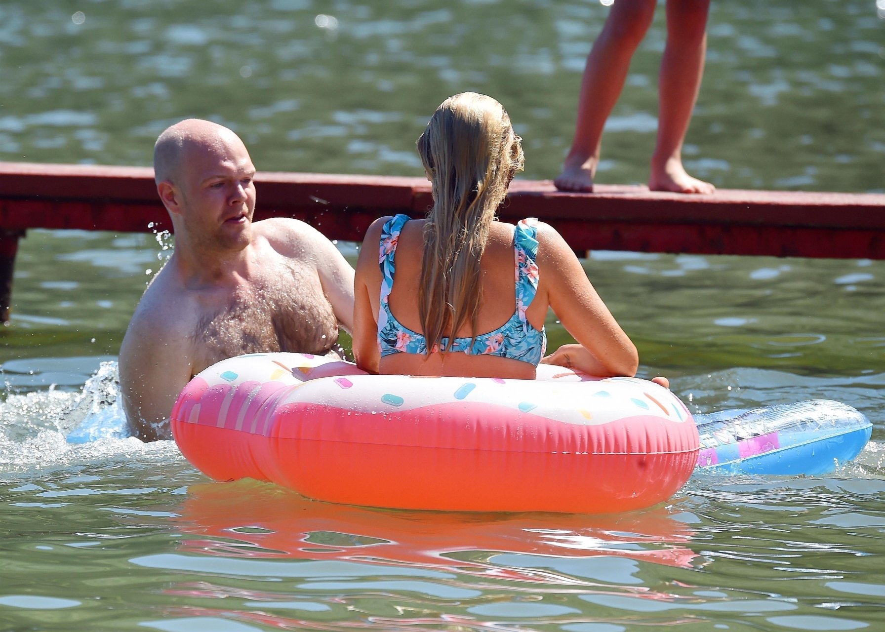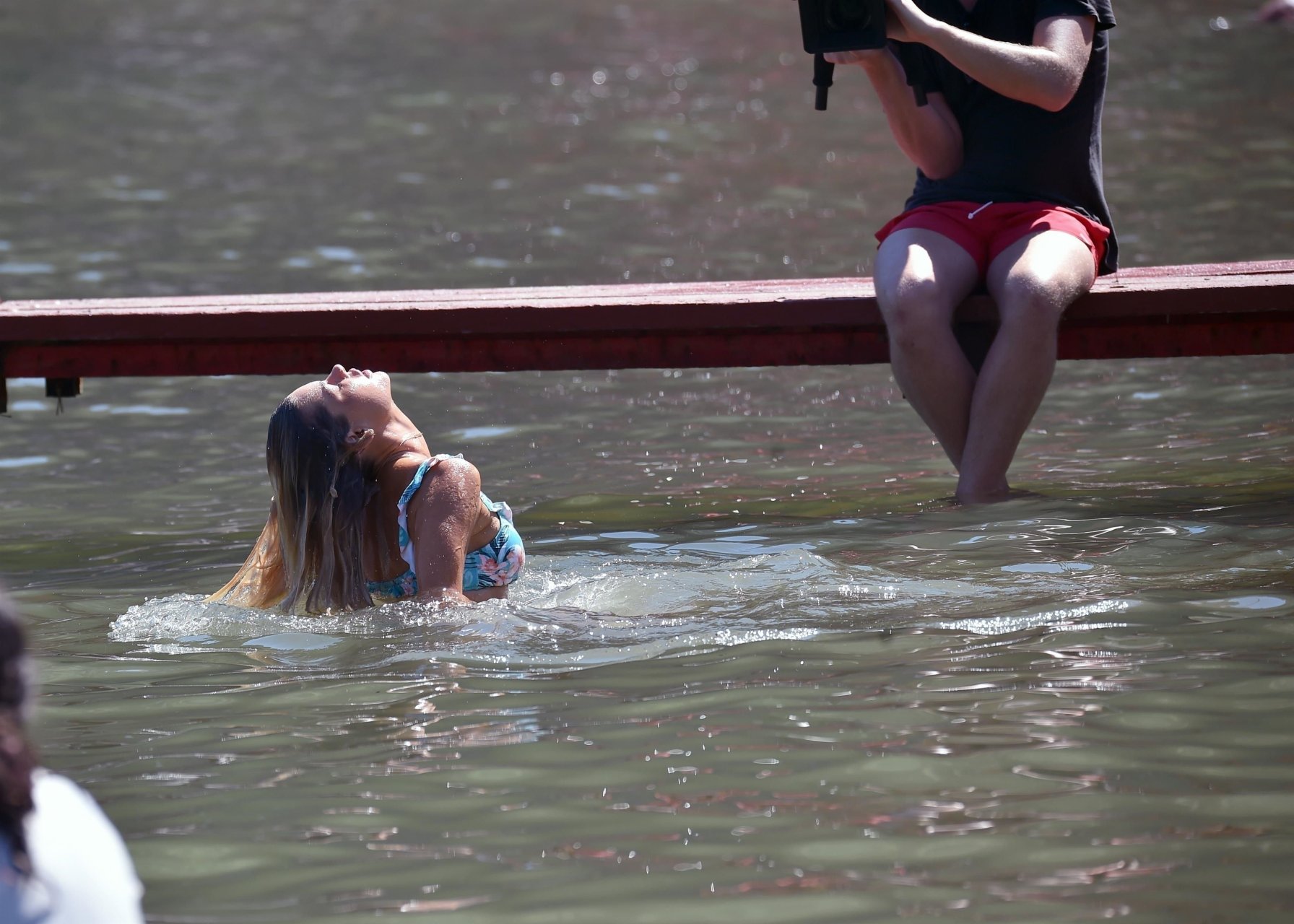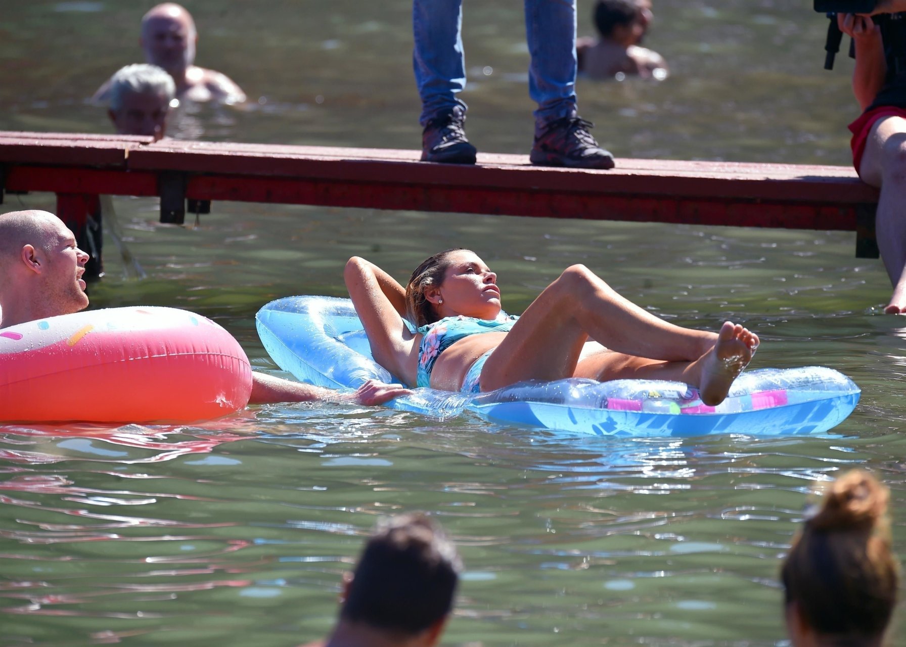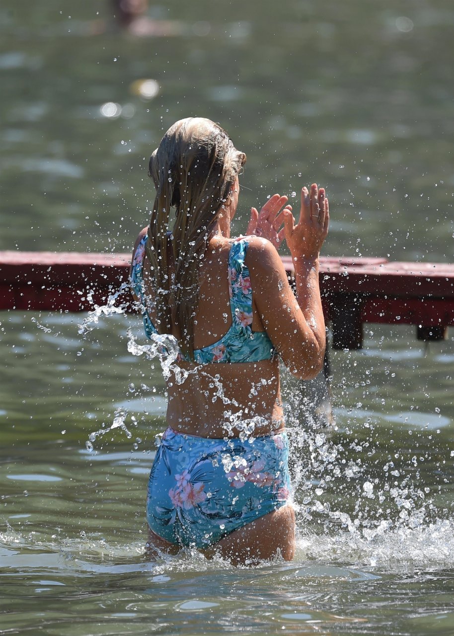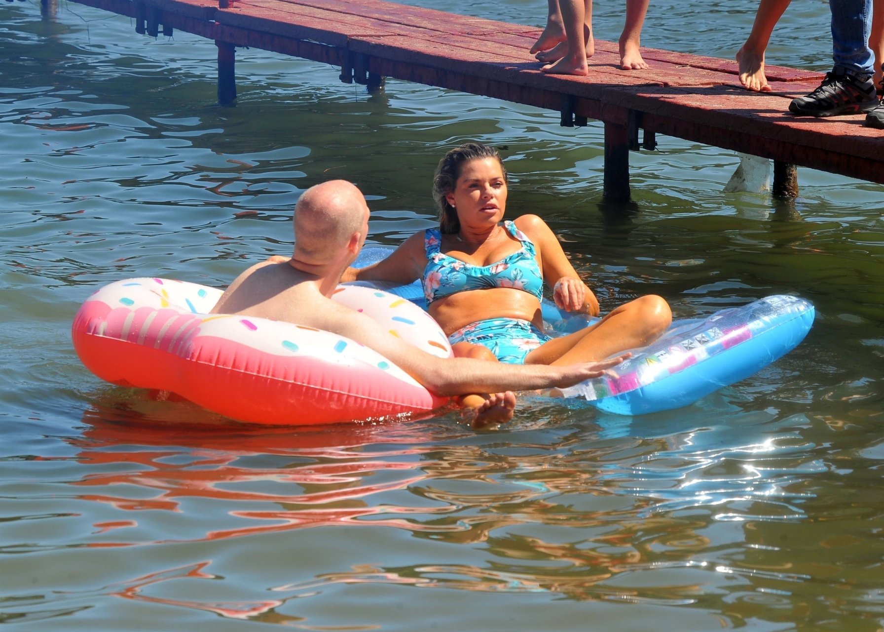 Sophie Monk fue fotografiada luciendo genial con un bikini azul de cintura alta mientras filmaba un programa de televisión con Oscar Gordon en la playa de Portofino, 14/07/2018.