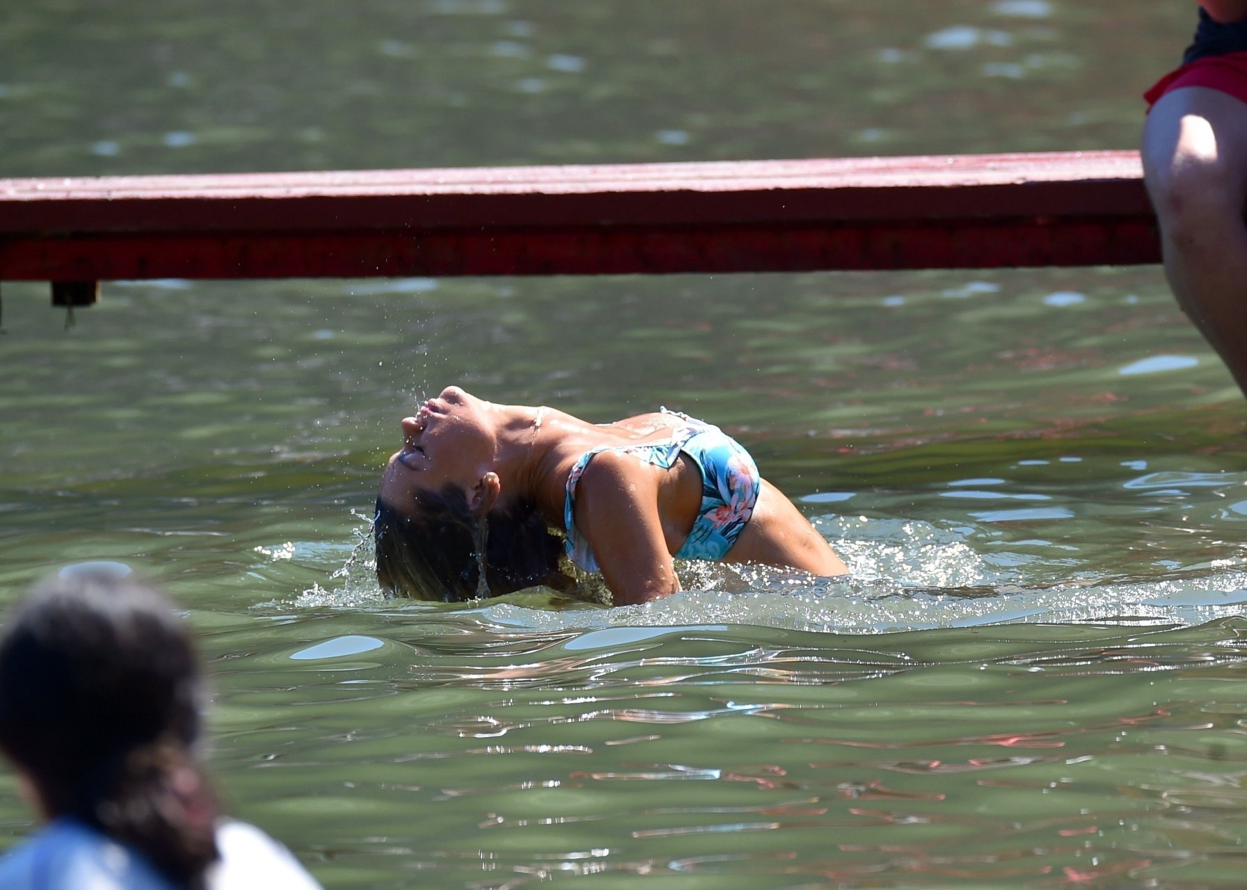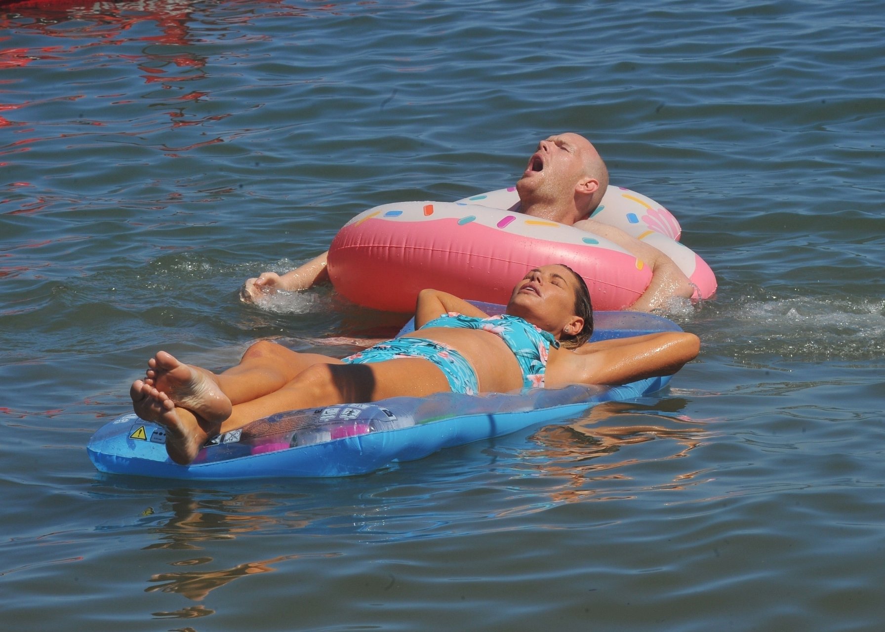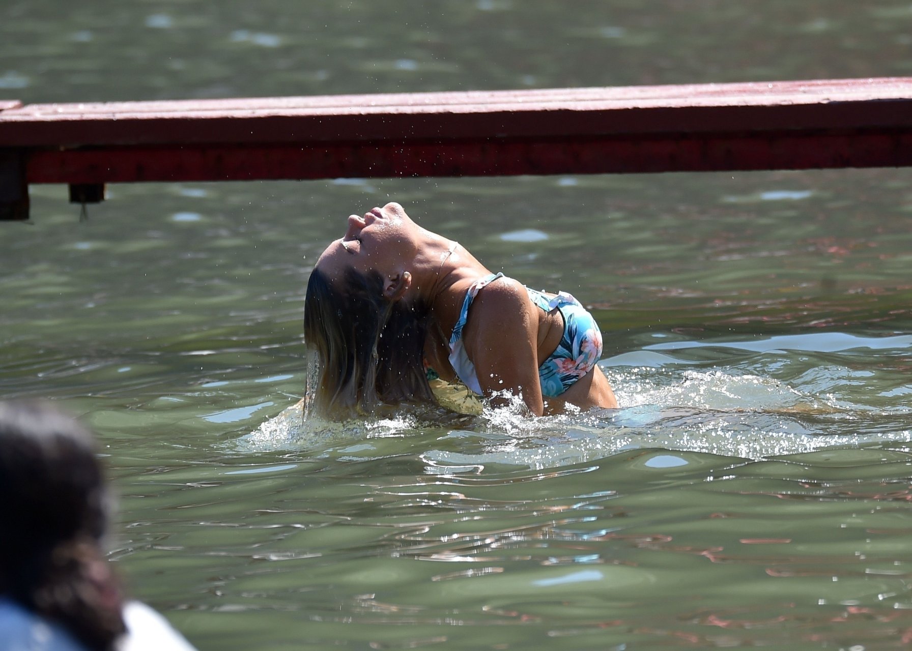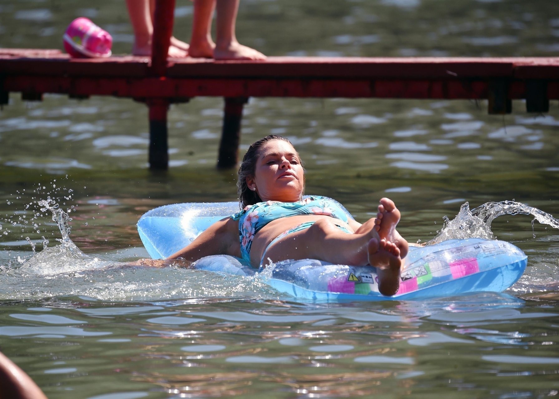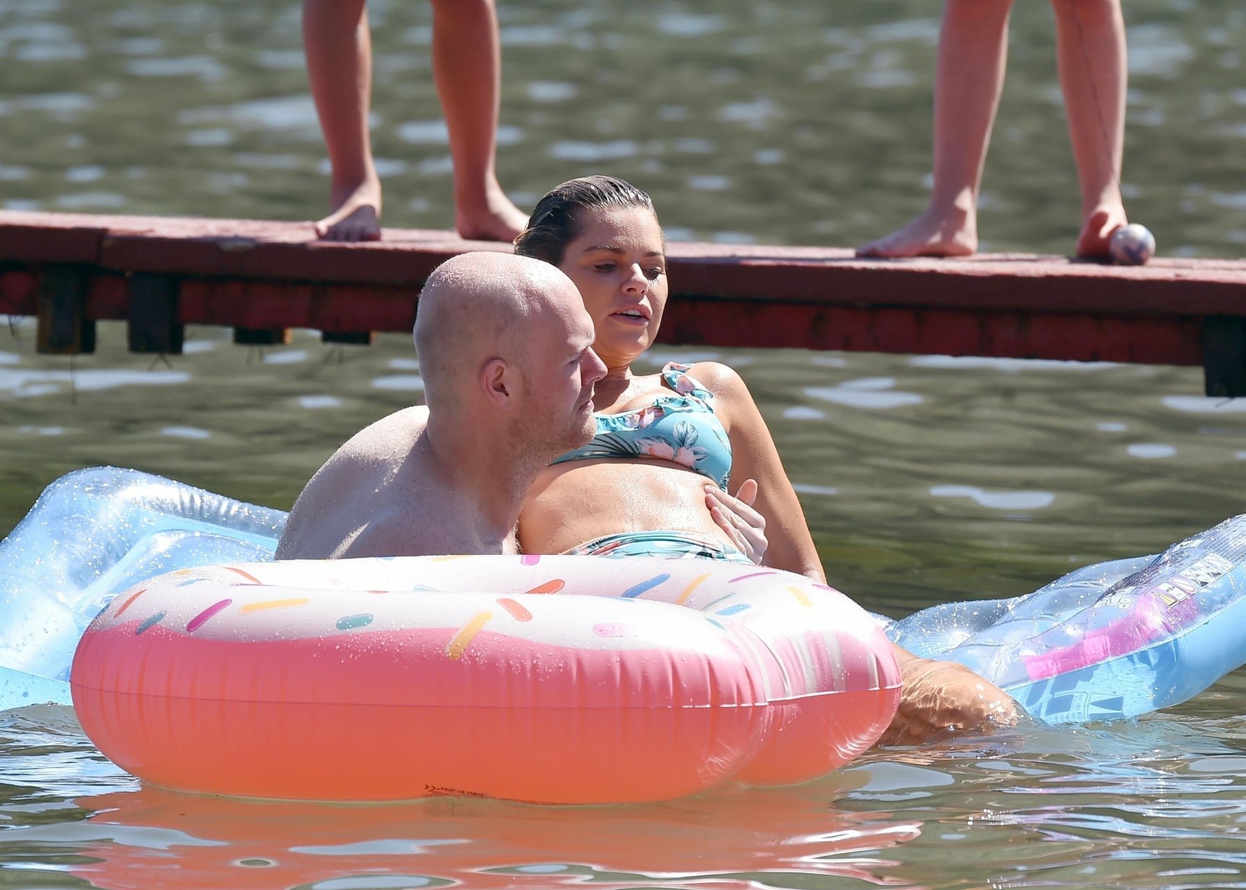 Sophie Monk fue fotografiada luciendo genial con un bikini azul de cintura alta mientras filmaba un programa de televisión con Oscar Gordon en la playa de Portofino, 14/07/2018.
