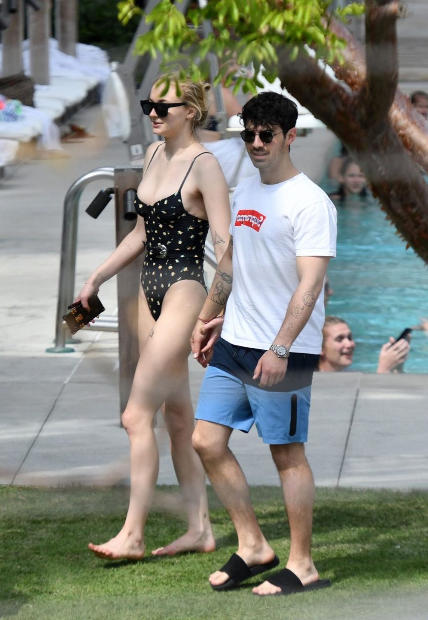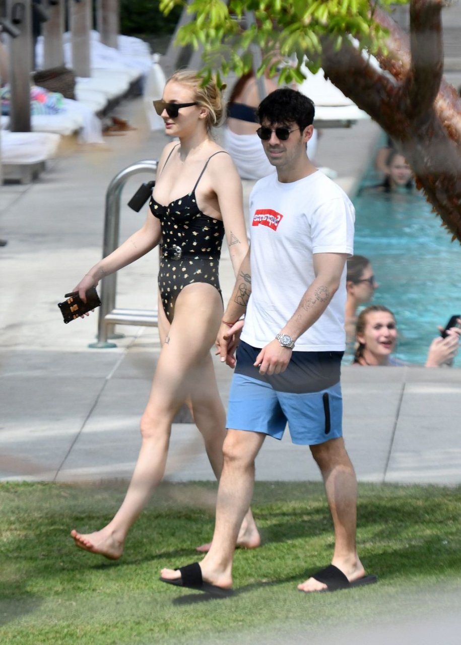 La actriz Sophie Turner lleva un traje de baño negro con cinturón mientras estaba con su prometido Joe Jonas en Miami, 23/03/2019.