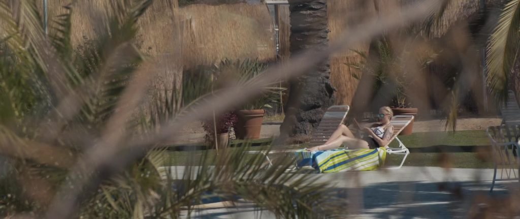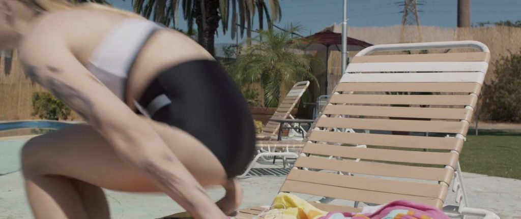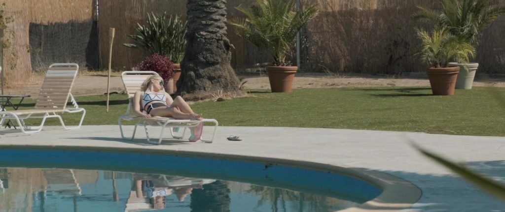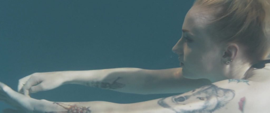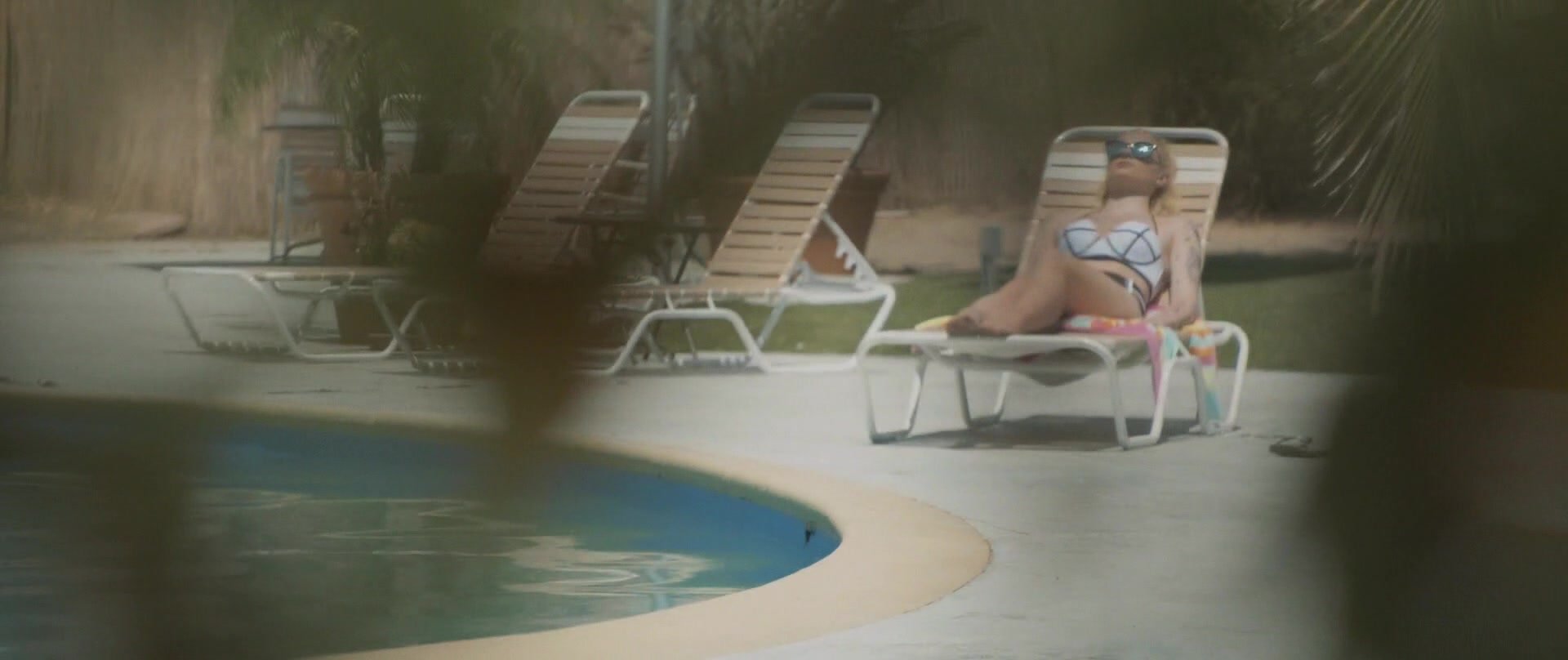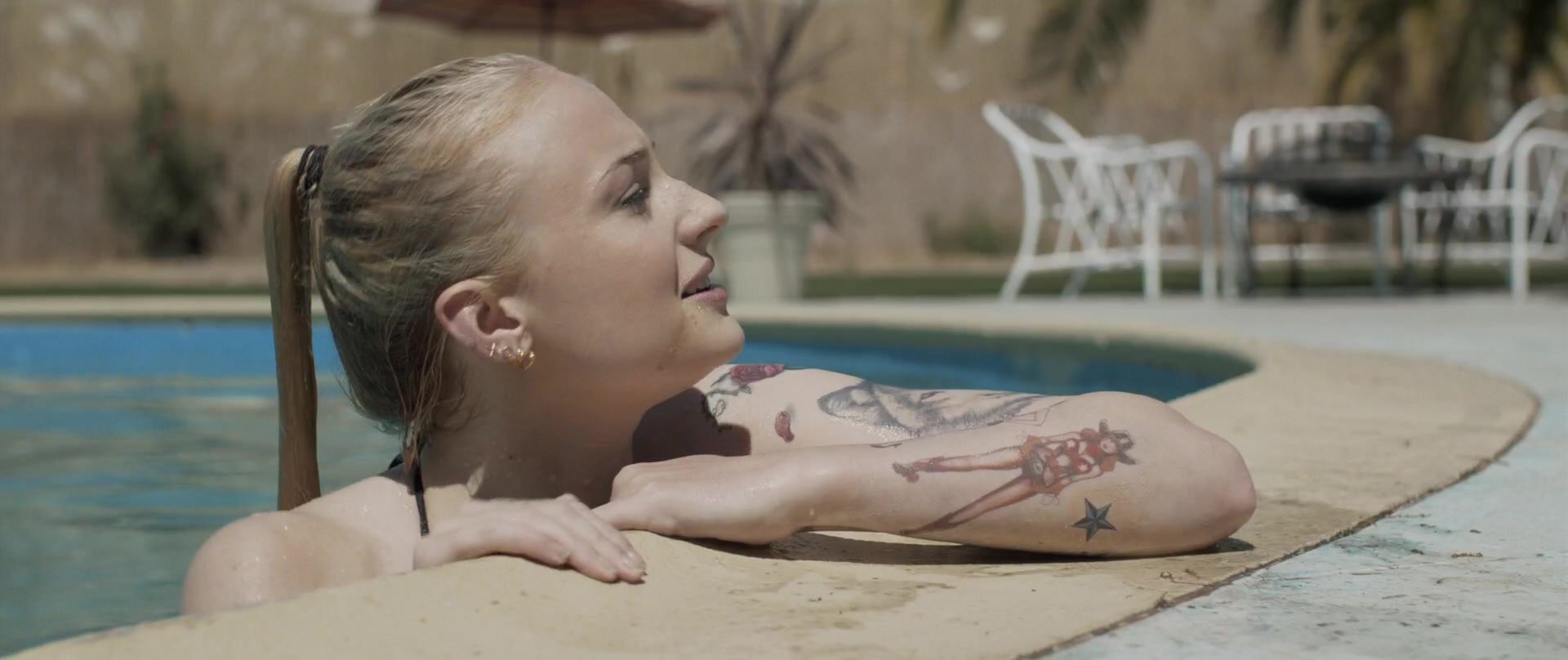 Vistas más cercanas de Sophie Turner en bikini acostada. Luego salta a la piscina y nada bajo el agua.