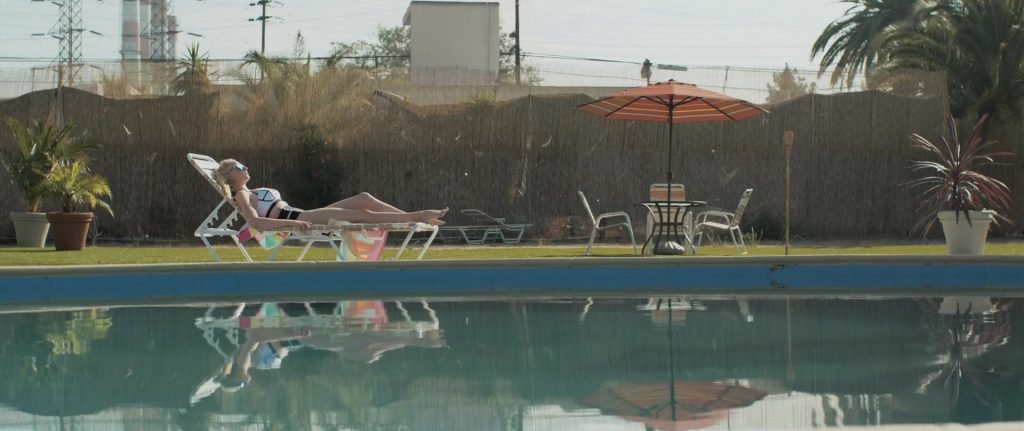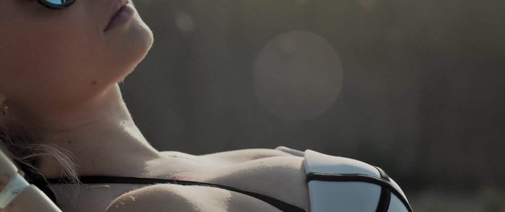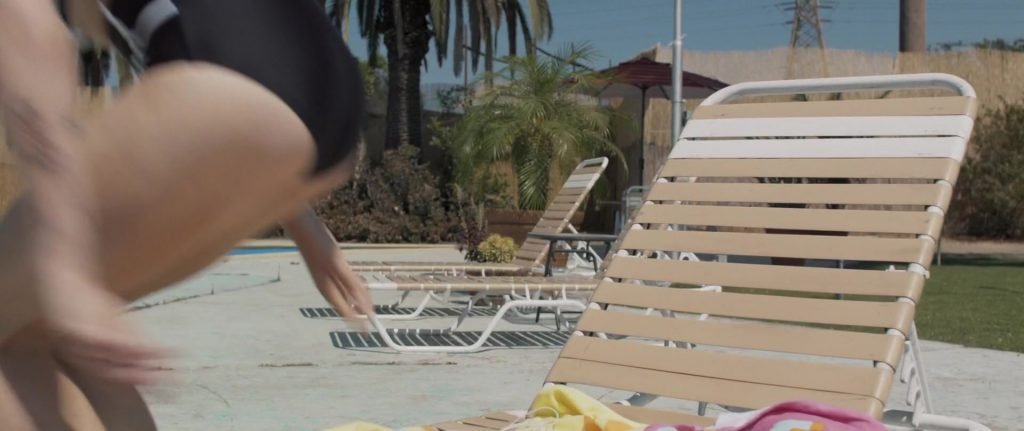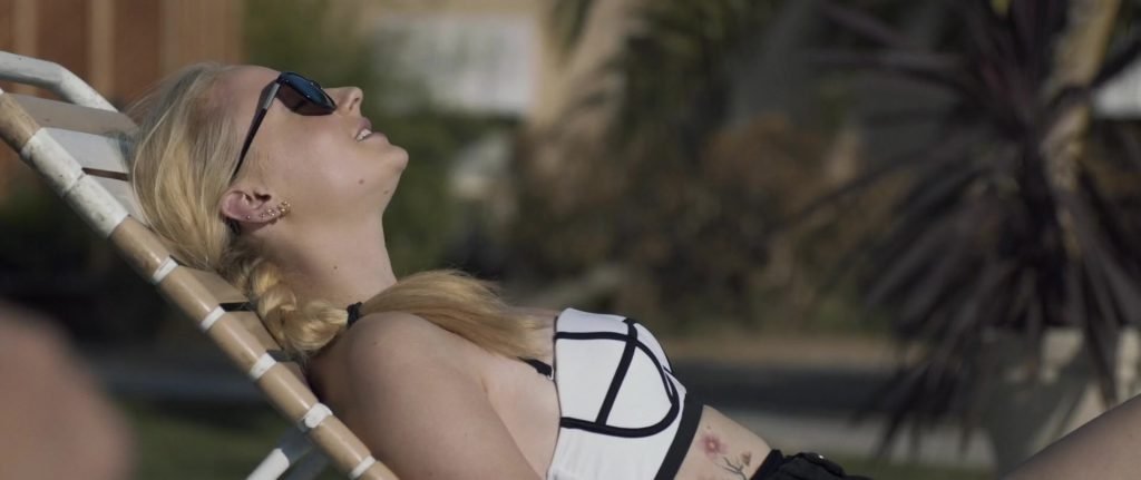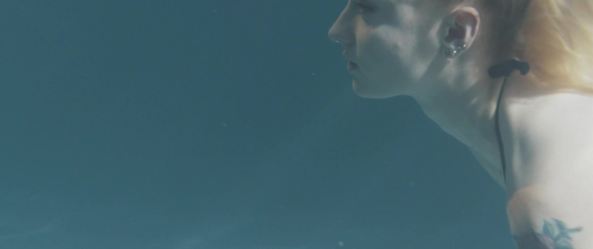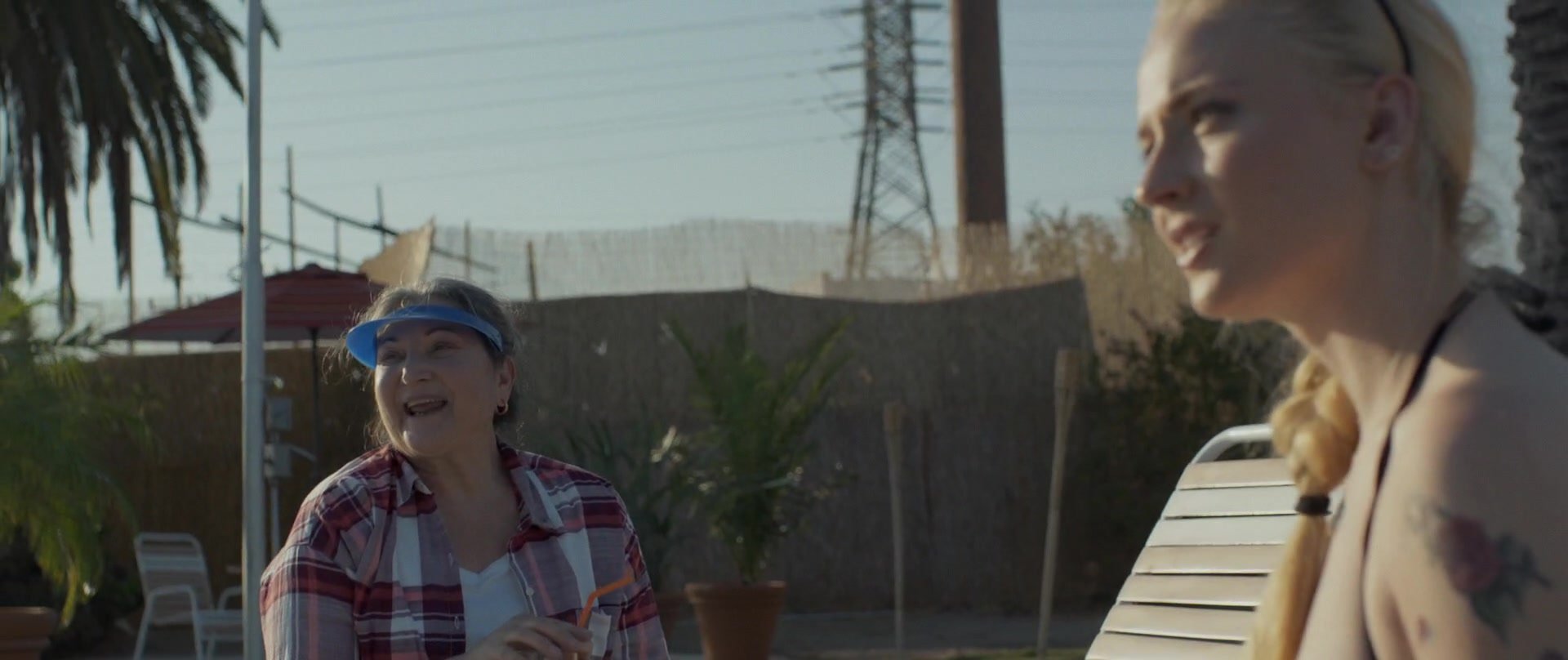Vistas más cercanas de Sophie Turner en bikini acostada. Luego salta a la piscina y nada bajo el agua.