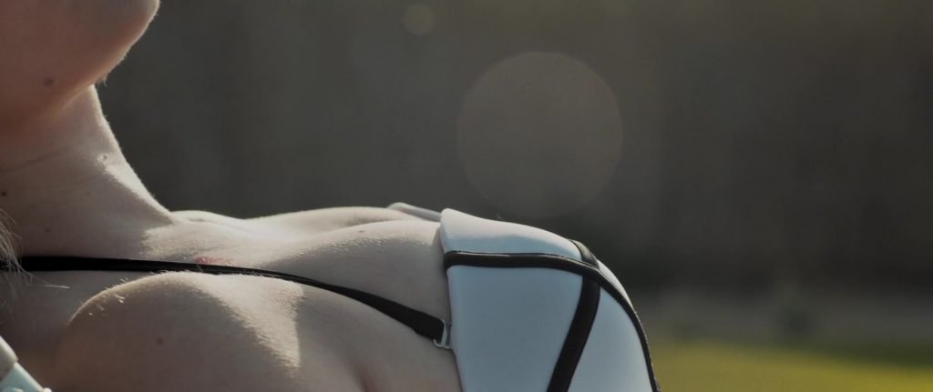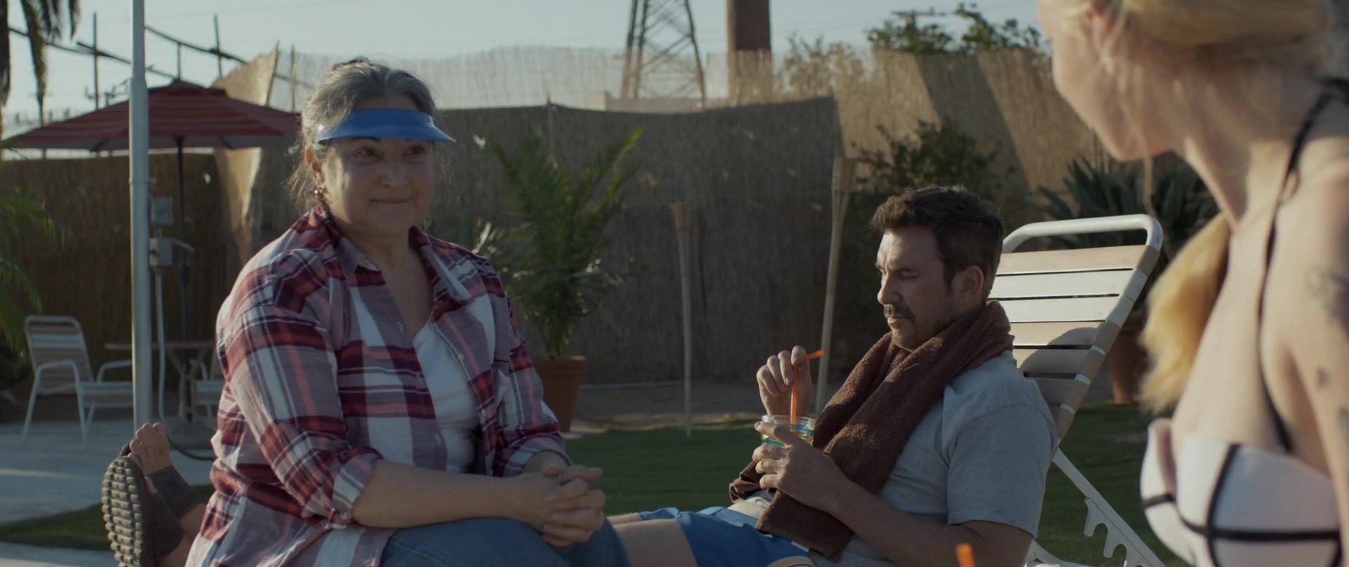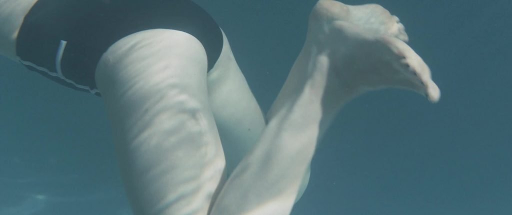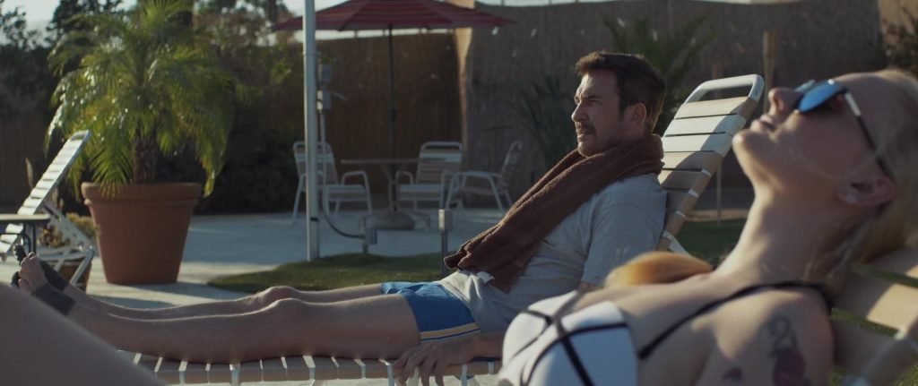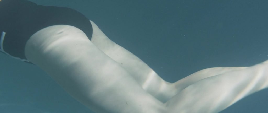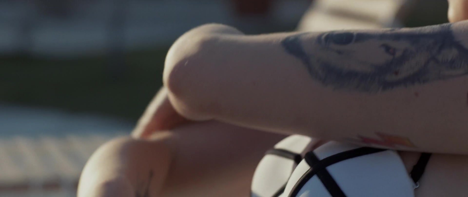 Vistas más cercanas de Sophie Turner en bikini acostada. Luego salta a la piscina y nada bajo el agua.