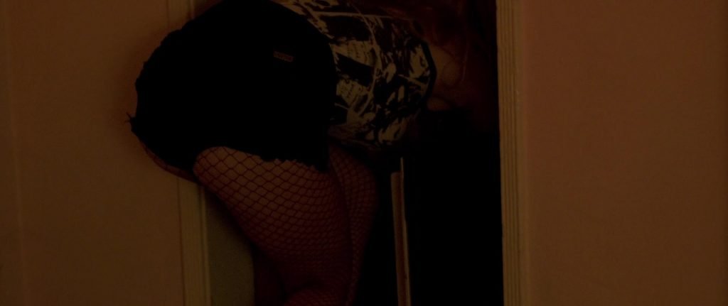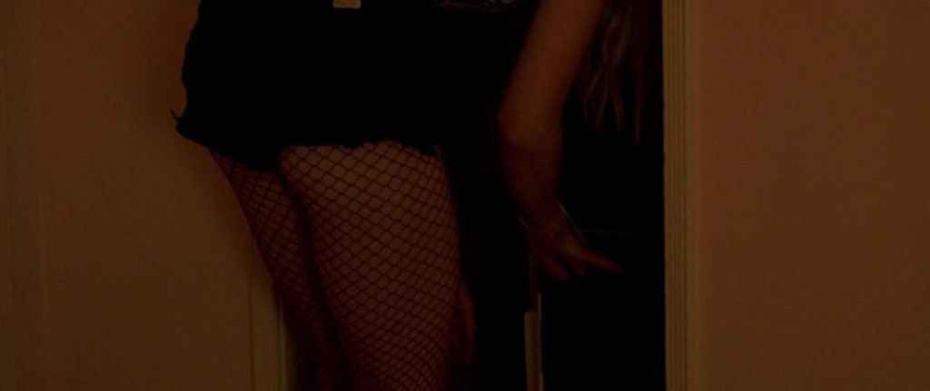 A guy watches Sophie Turner bend over in her jean shorts and fishnet stockings.