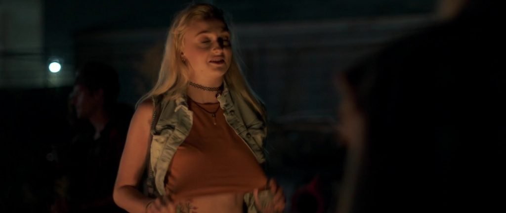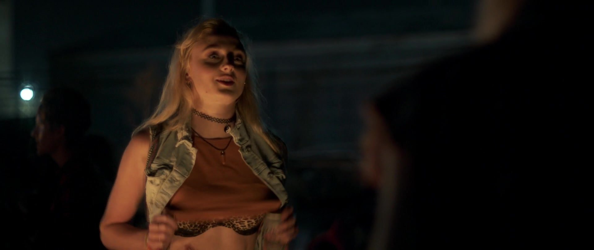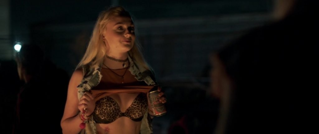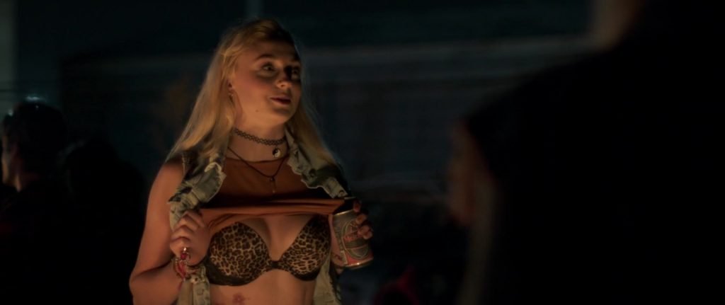 Sophie Turner lifts her shirt off to show her bra to a couple of guys before shotgunning a beer.