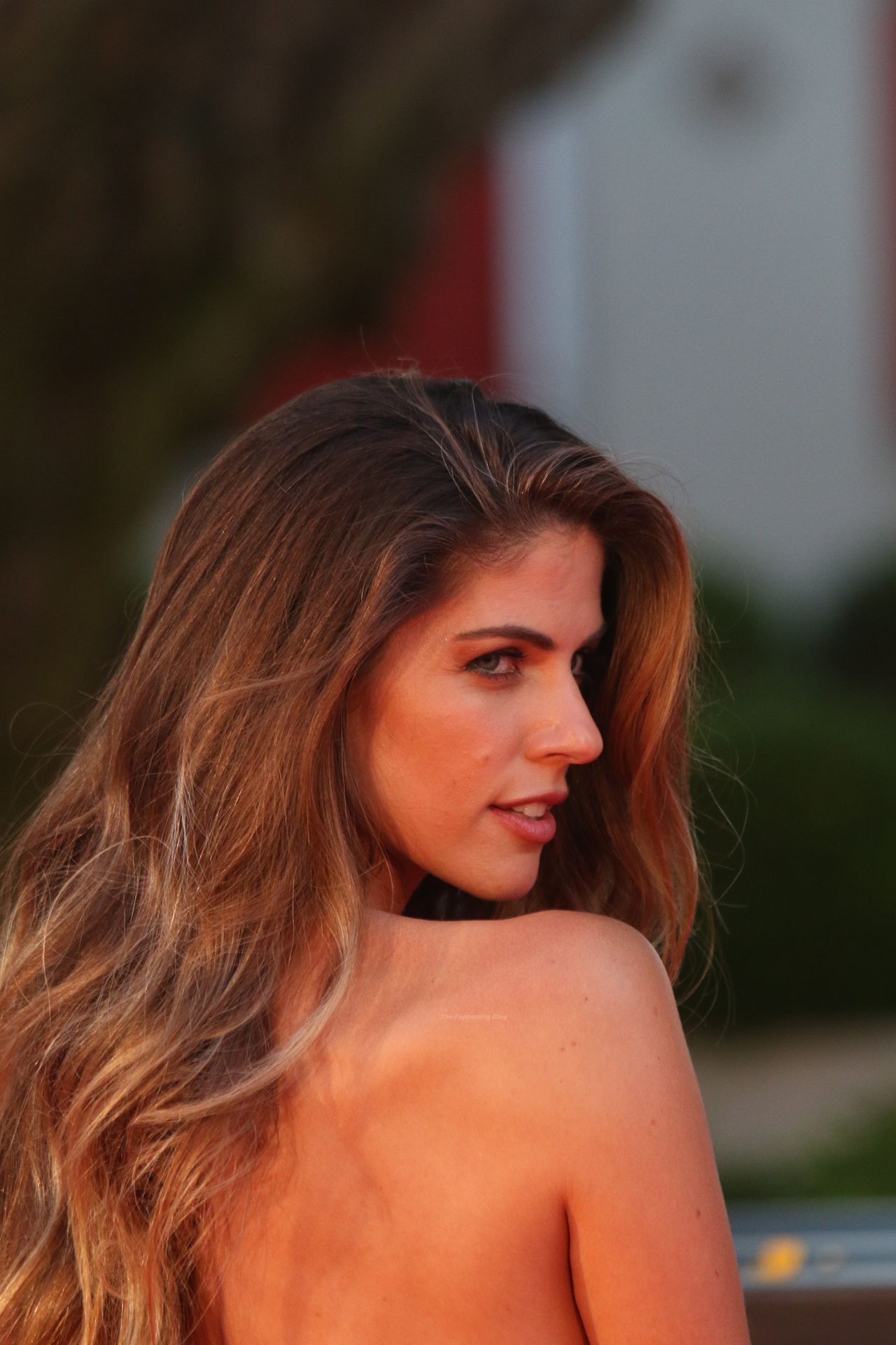 La actriz y modelo peruana Stephanie Cayo se ve con un vestido verde en la alfombra roja dentro del hotel Miramar, 06/07/2021.