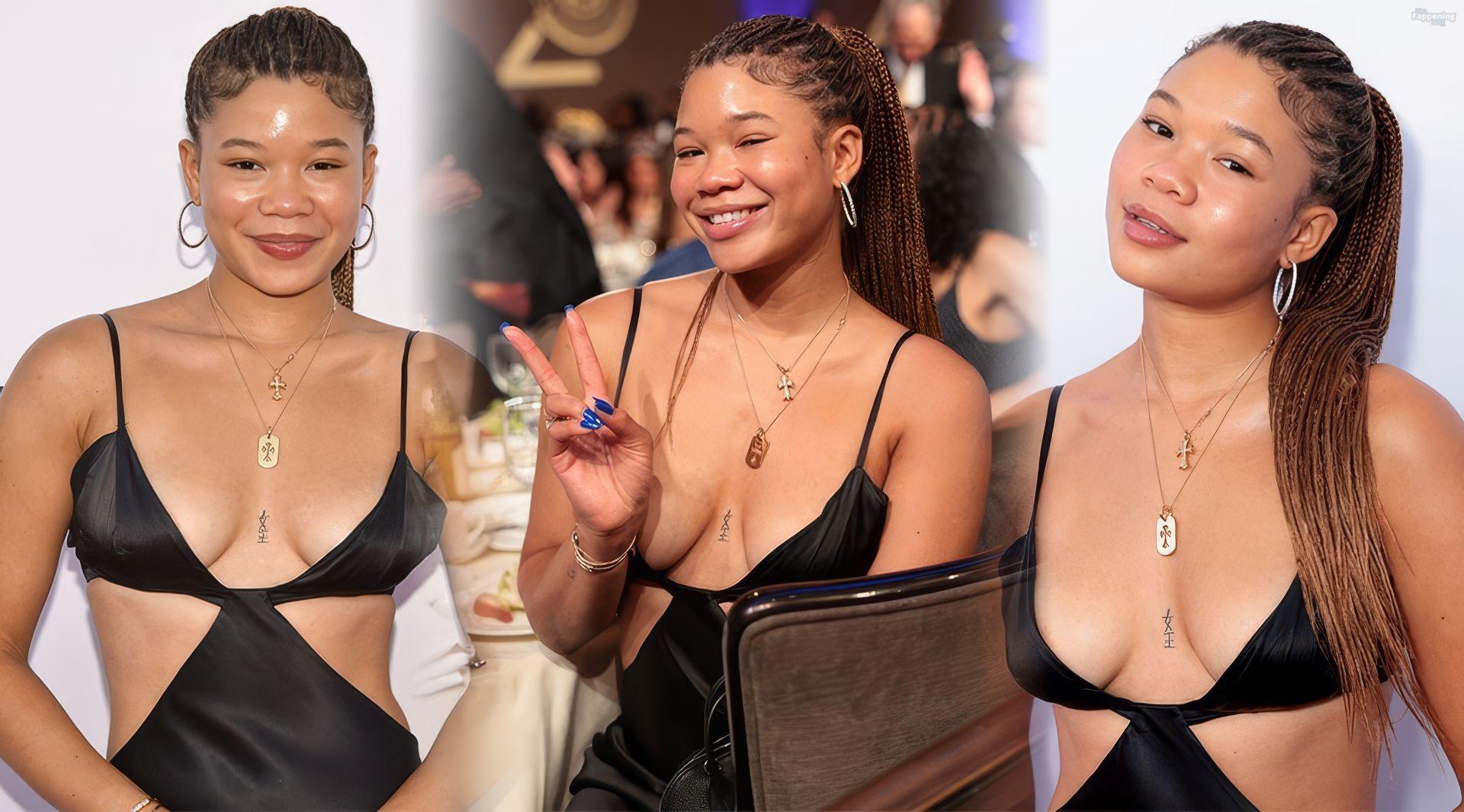 Storm Reid se ve en la Fundación Harold y Carole Pump en la fiesta en The Beverly Hilton en Beverly Hills con un vestido negro salvaje con algunos recortes, mostrando sus pechos sexys.
