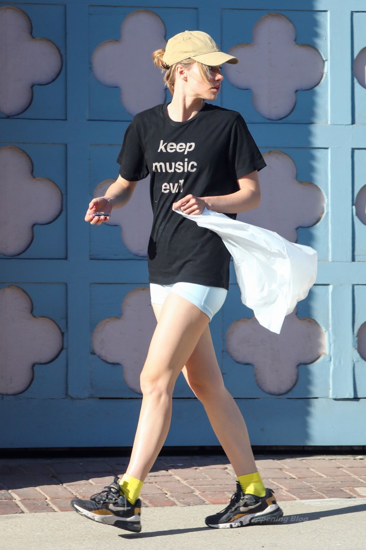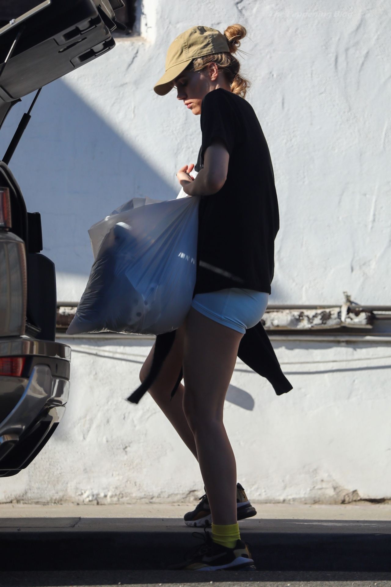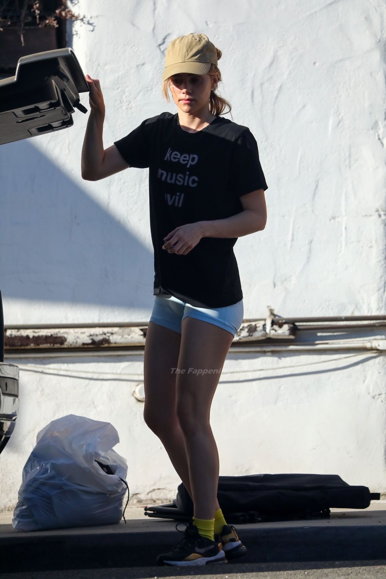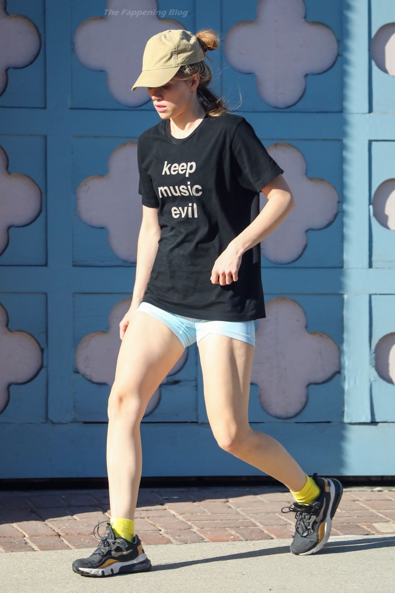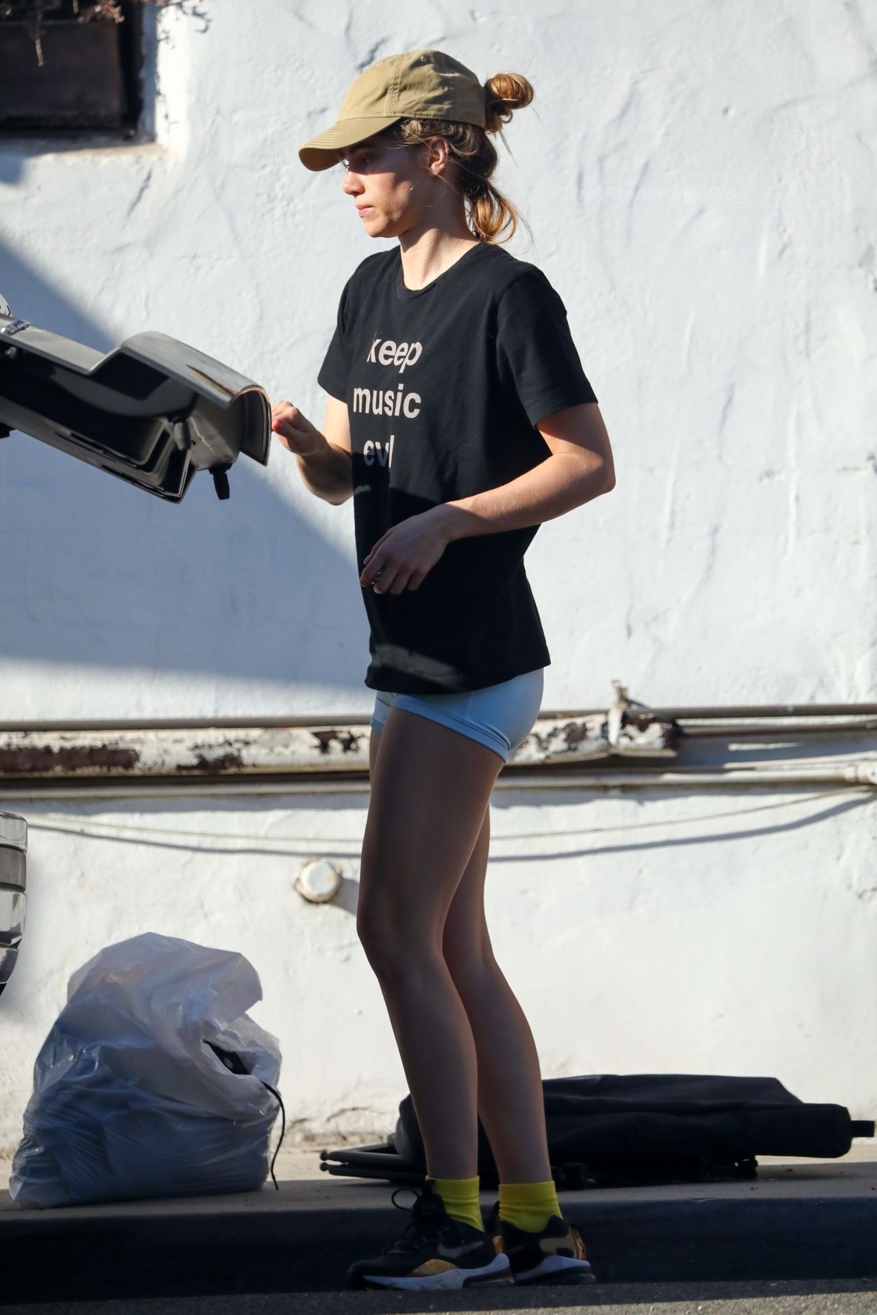 Actriz, modelo y estrella de The Fappening Suki Waterhouse limpia su coche y saca un guion para Daisy Jones and The Six, en Los Ángeles esta tarde. Mostró sus piernas con pantalones cortos y llevaba una camiseta negra que decía: ¡Mantiene la Música Malvada!