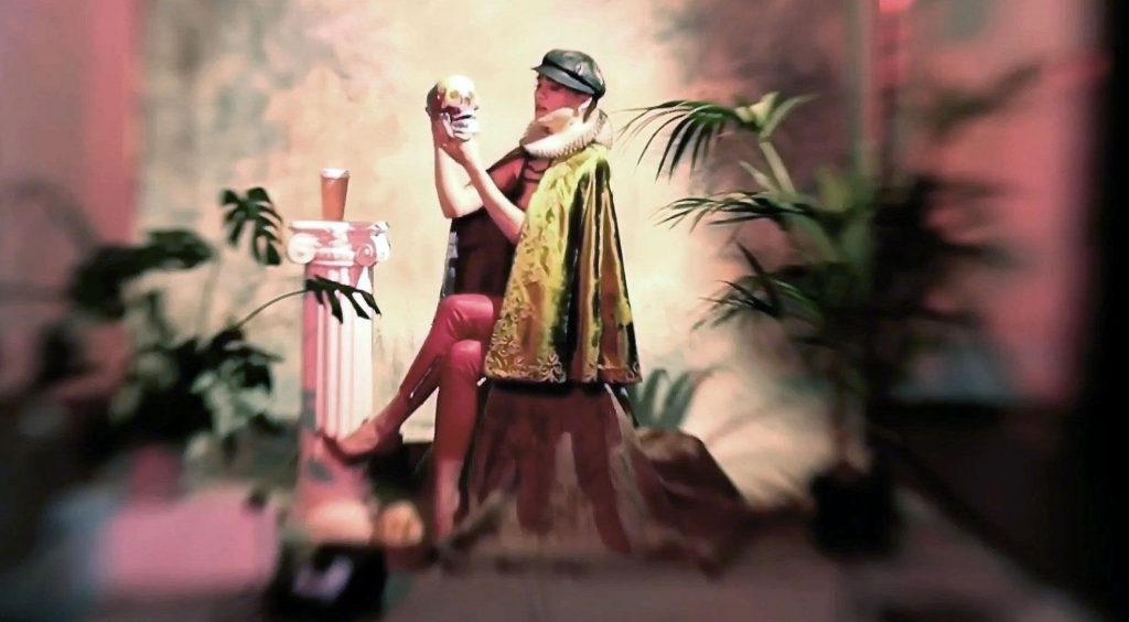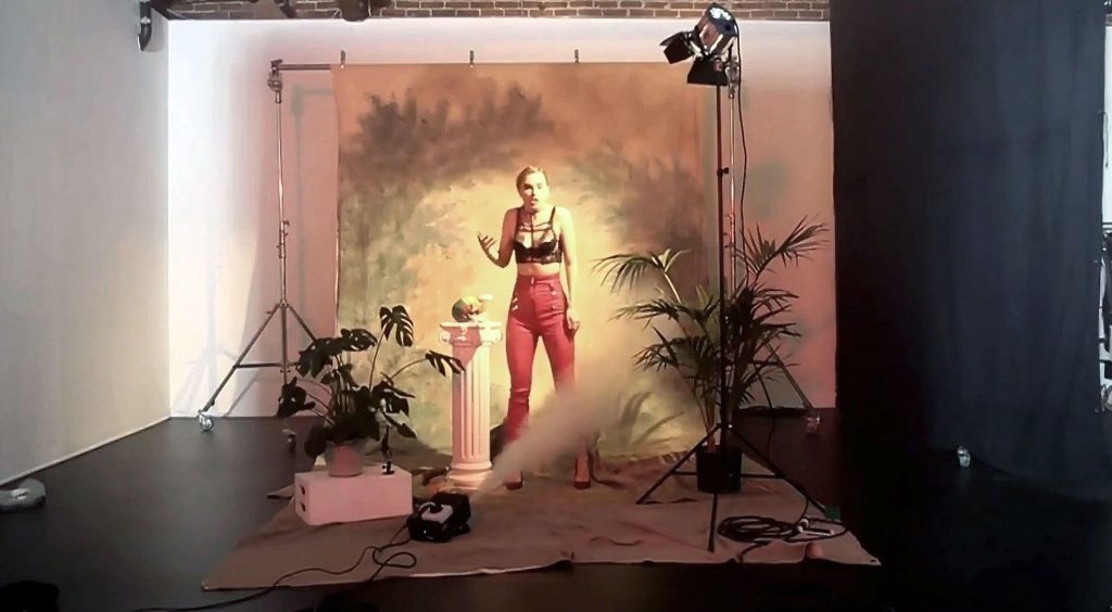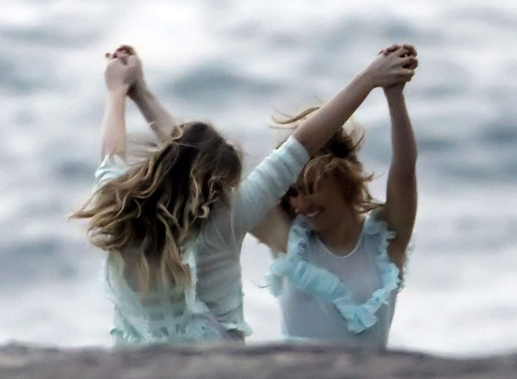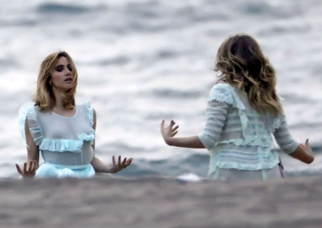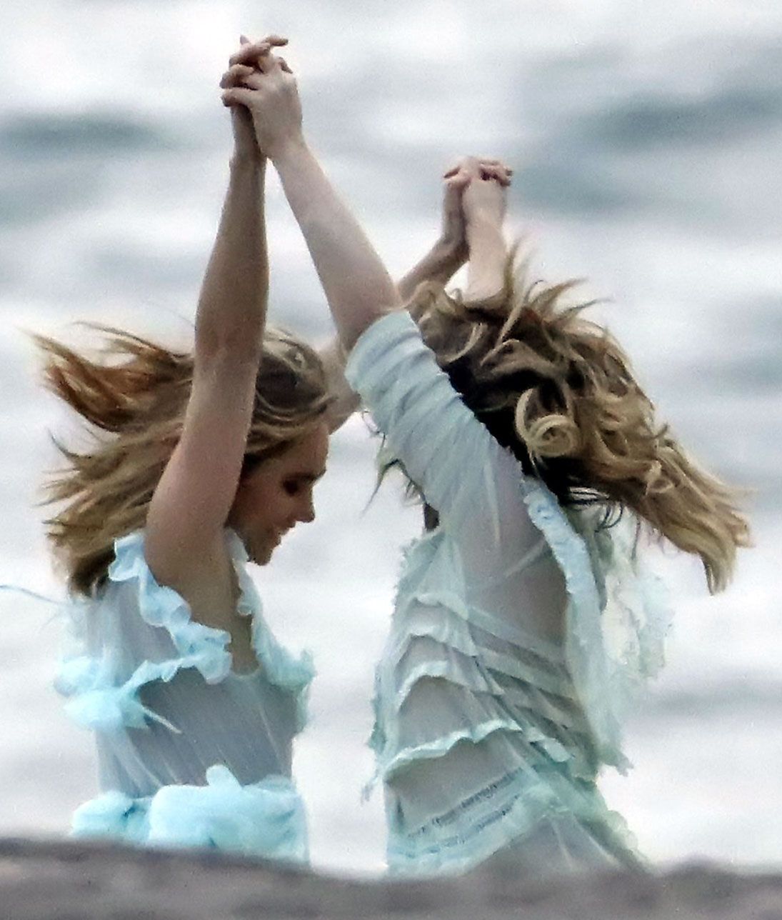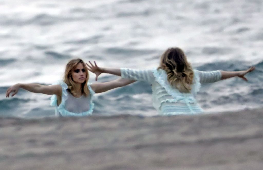 Waterhouse is shown naked from behind as she stands in a warehouse, revealing her butt while a man approaches and then stands by her, stroking her hair away from her neck.
