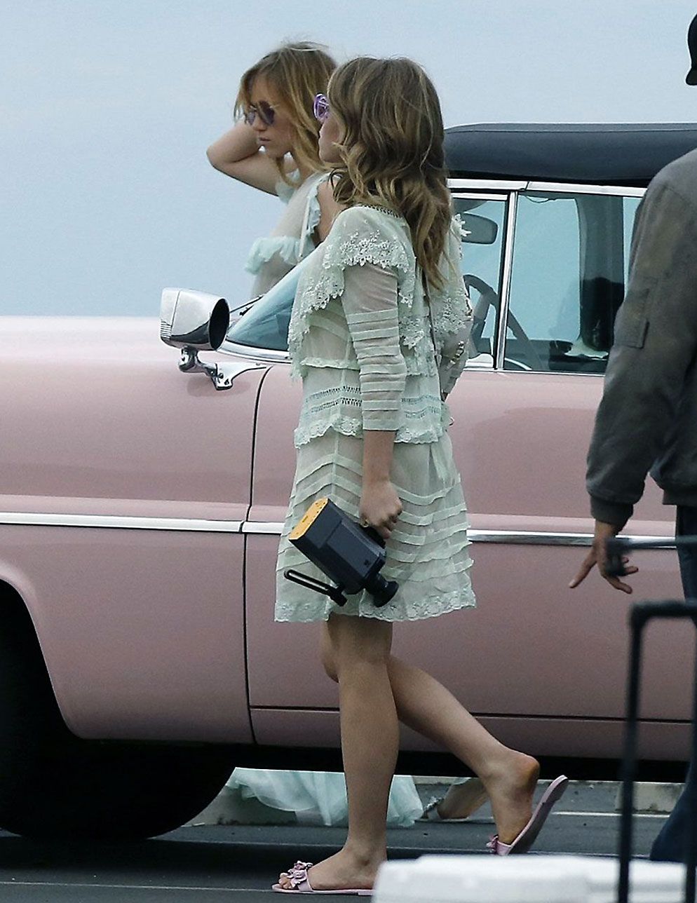 Here, Suki Waterhouse removes her white fur coat to reveal a black bra and her ass in black lace thong underwear with a garter and stockings while a man stares at her.