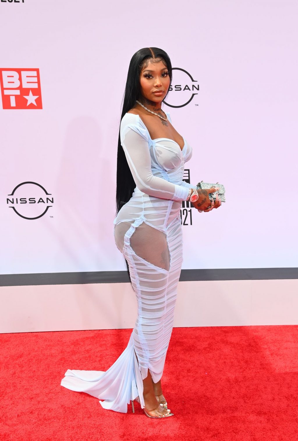 La cantante Summer Walker sin sujetador deslumbra en la alfombra roja al llegar a los BET Awards en el Microsoft Theatre de Los Ángeles, 27/06/2021.