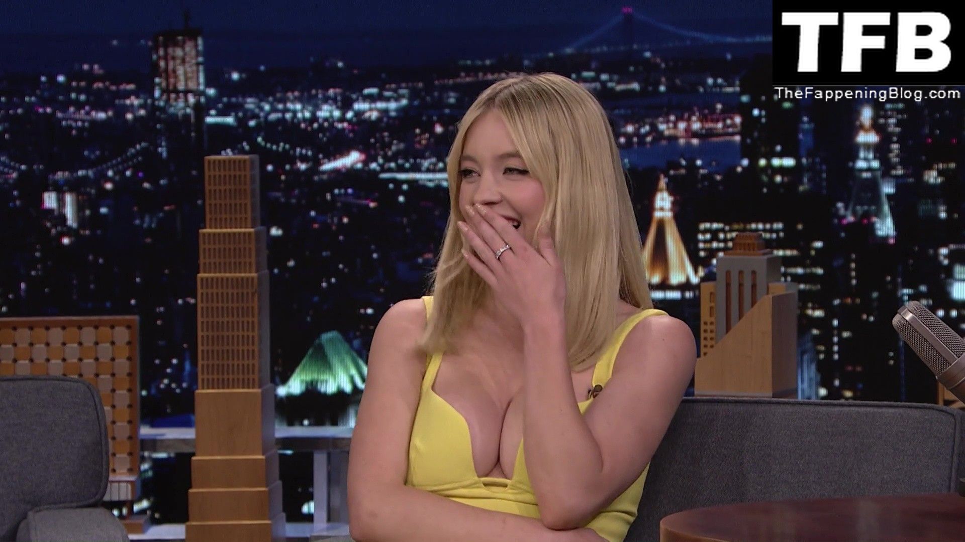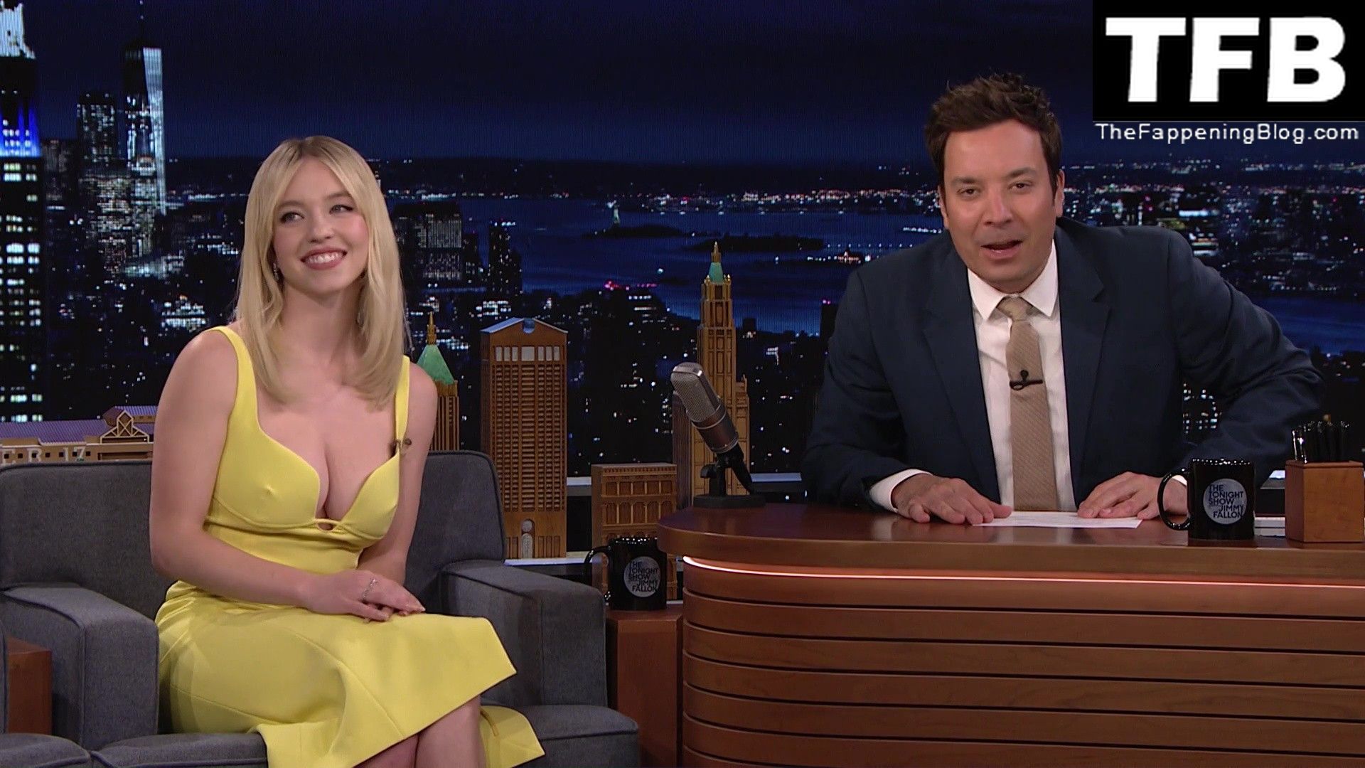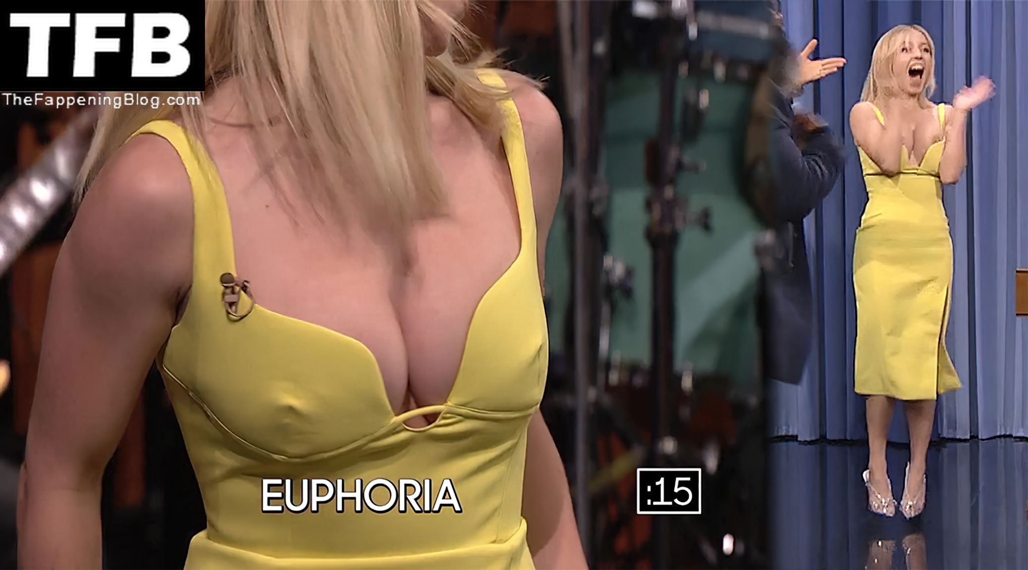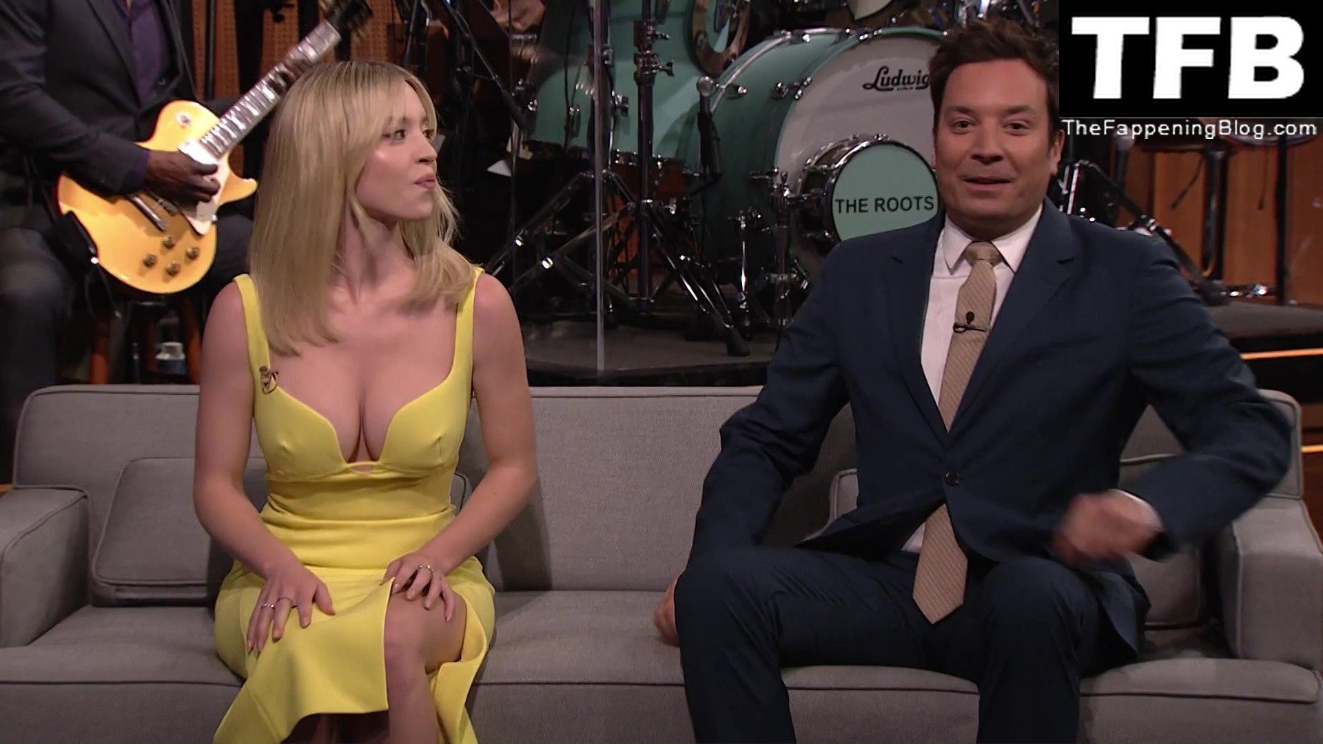 Sydney Sweeney muestra su sexy escote y enseña su pezón en el programa “The Tonight Show with Jimmy Fallon” (mayo 2022).